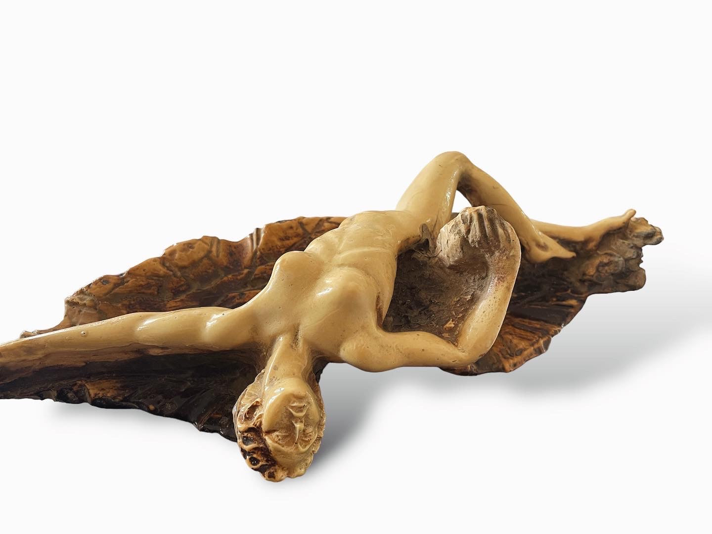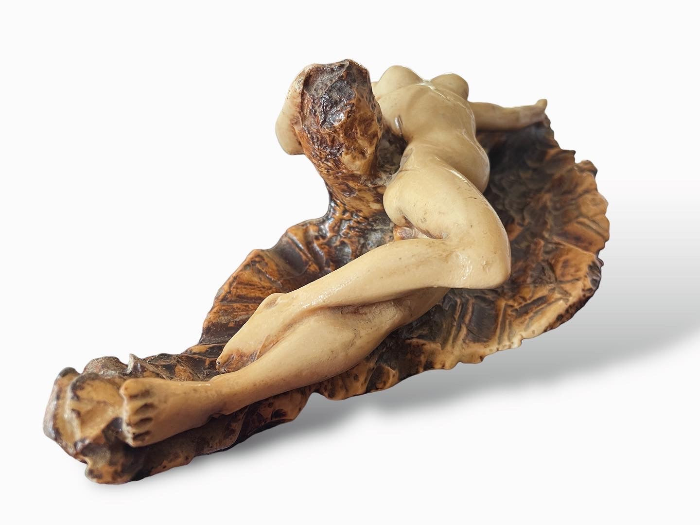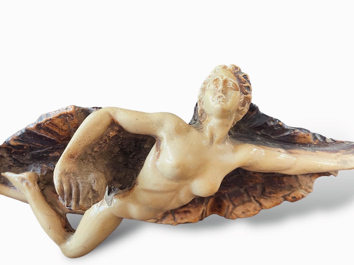 Spectacular large ashtray carved in high relief, resin and marble dust, in the shape of a woman's figure, 33 cm long, mid century, very well preserved, only sign of time (last photo) light chipping on a finger of the left hand. Beautiful plastic rendering of the curves and muscles of the body. Weight approx. 1.5 kg, beautiful display piece.
