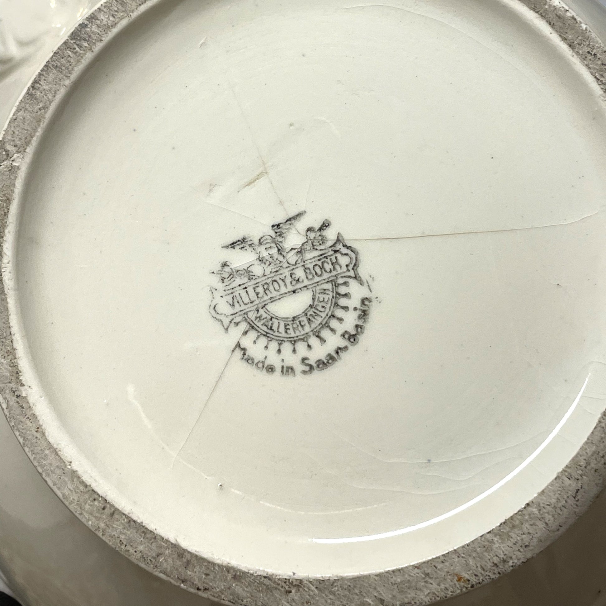 Chamber pot. Manifattura: Villeroy & Boch – Mettlach, Saar Basin. Epoca: ca. 1920–1935. Materiale: ceramica smaltata decorata a trasferibile con ritocchi a mano. Decoro: narcisi bianchi con dettagli giallo e bordeaux su fondo verde-grigio tenue. Condizioni: ottime; nessuna crepa né sbeccatura, craquelure uniforme tipica dell’epoca particolarmente visibile al fondo.