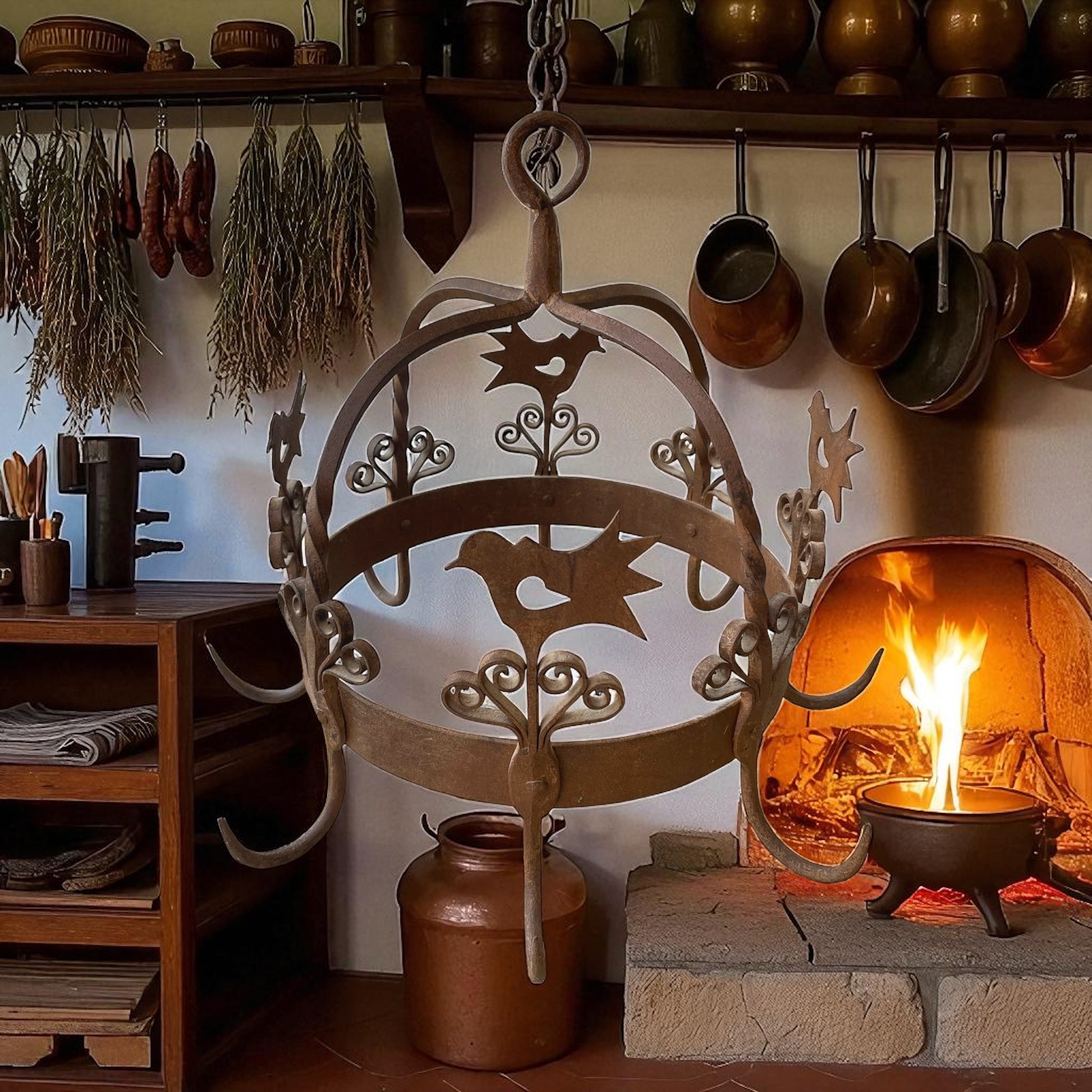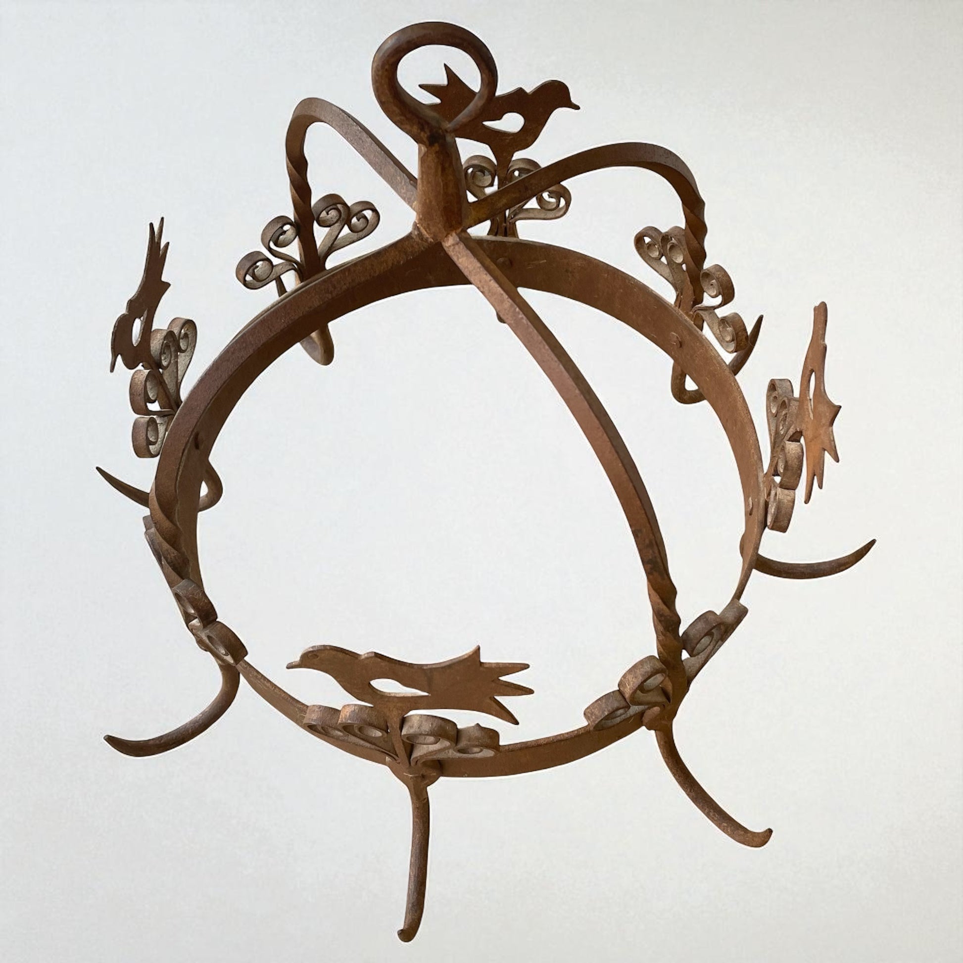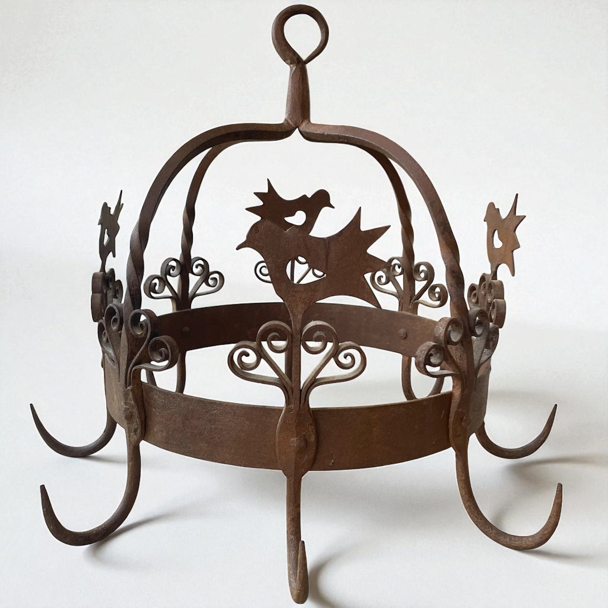 Appeso sopra al fuoco, al centro della cucina, questo manufatto non era solo uno strumento: era un simbolo. In Olanda veniva chiamato “potkroon” – letteralmente corona per pentole – ed era il cuore del focolare. Ai suoi ganci robusti si agganciavano paioli fumanti, piccole pentole, mestoli e persino erbe aromatiche o salumi da essiccare lentamente, mentre la famiglia si riuniva attorno al calore del fuoco. Questo esemplare, realizzato in ferro battuto a mano e decorato con motivi a volute e sagome di uccelli stilizzati, risale alla metà del Novecento e conserva tutto il fascino della tradizione olandese del focolare. I fabbri non si limitavano a creare utensili: plasmavano vere e proprie opere decorative, capaci di trasformare la cucina in uno spazio vivo e accogliente. Oggi, questa corona da camino si inserisce con naturalezza in un ambiente rustico-chic, sospesa in una cucina con travi a vista o accanto a un camino in pietra, come elemento ornamentale che richiama una tradizione antica e conviviale. Il suo peso importante e la lavorazione artigianale la rendono un pezzo autentico, capace di raccontare la bellezza del ferro battuto nella vita quotidiana del passato.