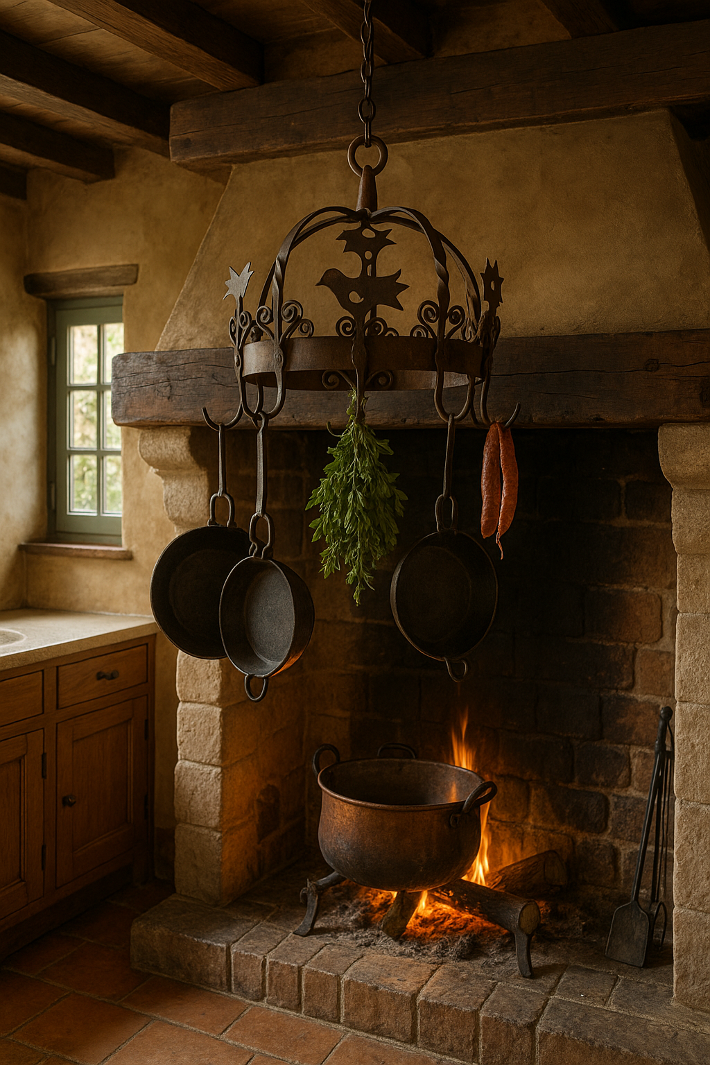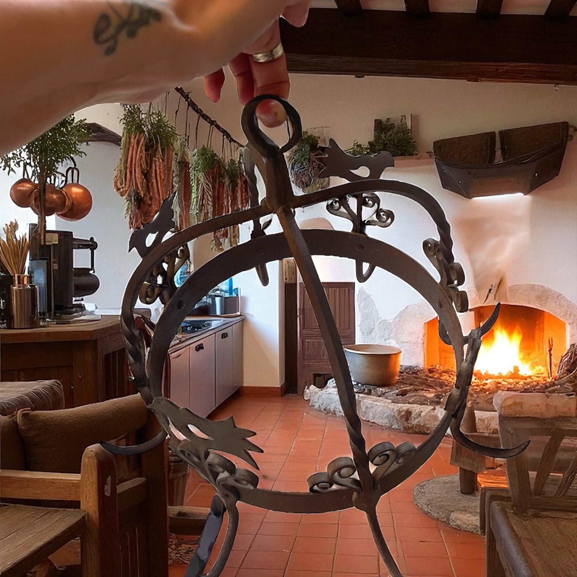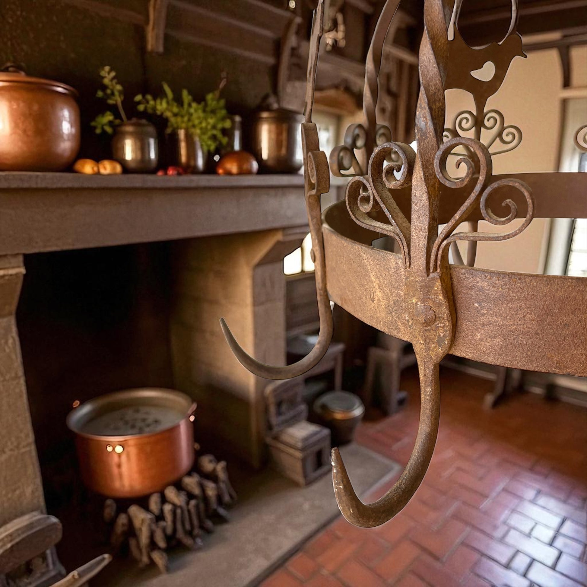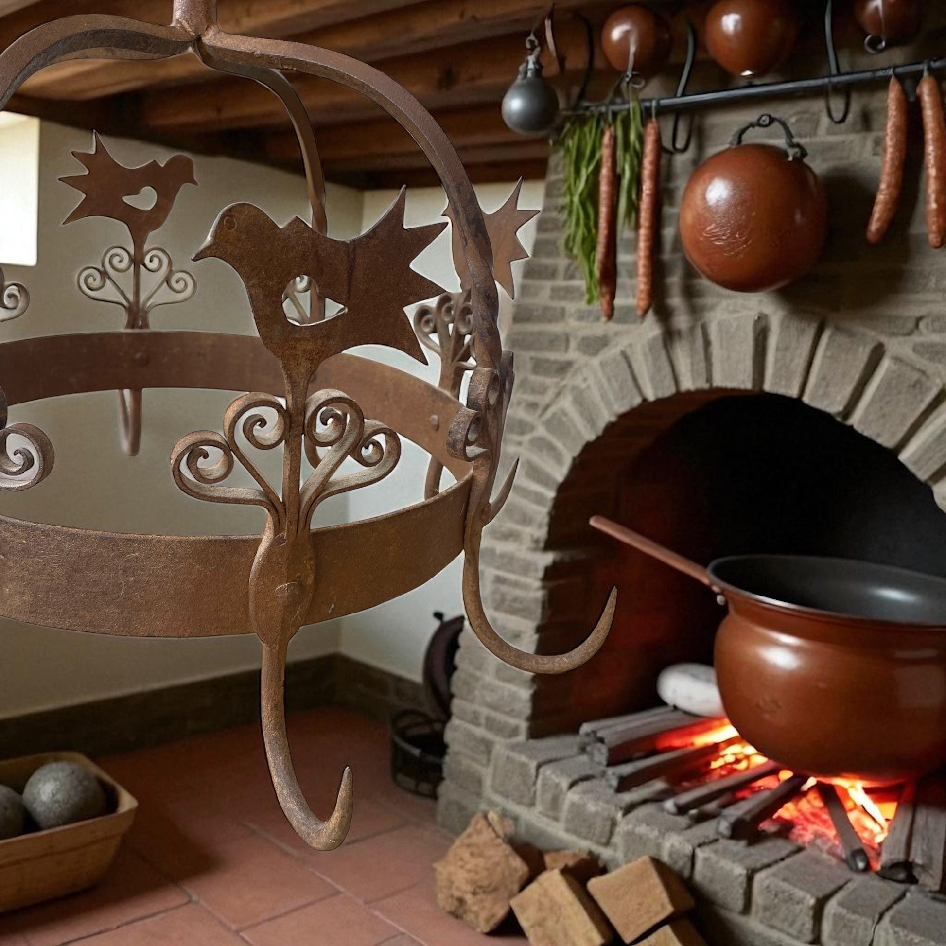 Appeso sopra al fuoco, al centro della cucina, questo manufatto non era solo uno strumento: era un simbolo. In Olanda veniva chiamato “potkroon” – letteralmente corona per pentole – ed era il cuore del focolare. Ai suoi ganci robusti si agganciavano paioli fumanti, piccole pentole, mestoli e persino erbe aromatiche o salumi da essiccare lentamente, mentre la famiglia si riuniva attorno al calore del fuoco. Questo esemplare, realizzato in ferro battuto a mano e decorato con motivi a volute e sagome di uccelli stilizzati, risale alla metà del Novecento e conserva tutto il fascino della tradizione olandese del focolare. I fabbri non si limitavano a creare utensili: plasmavano vere e proprie opere decorative, capaci di trasformare la cucina in uno spazio vivo e accogliente. Oggi, questa corona da camino si inserisce con naturalezza in un ambiente rustico-chic, sospesa in una cucina con travi a vista o accanto a un camino in pietra, come elemento ornamentale che richiama una tradizione antica e conviviale. Il suo peso importante e la lavorazione artigianale la rendono un pezzo autentico, capace di raccontare la bellezza del ferro battuto nella vita quotidiana del passato.