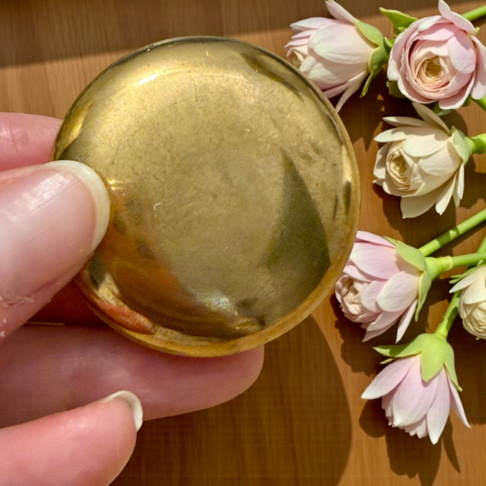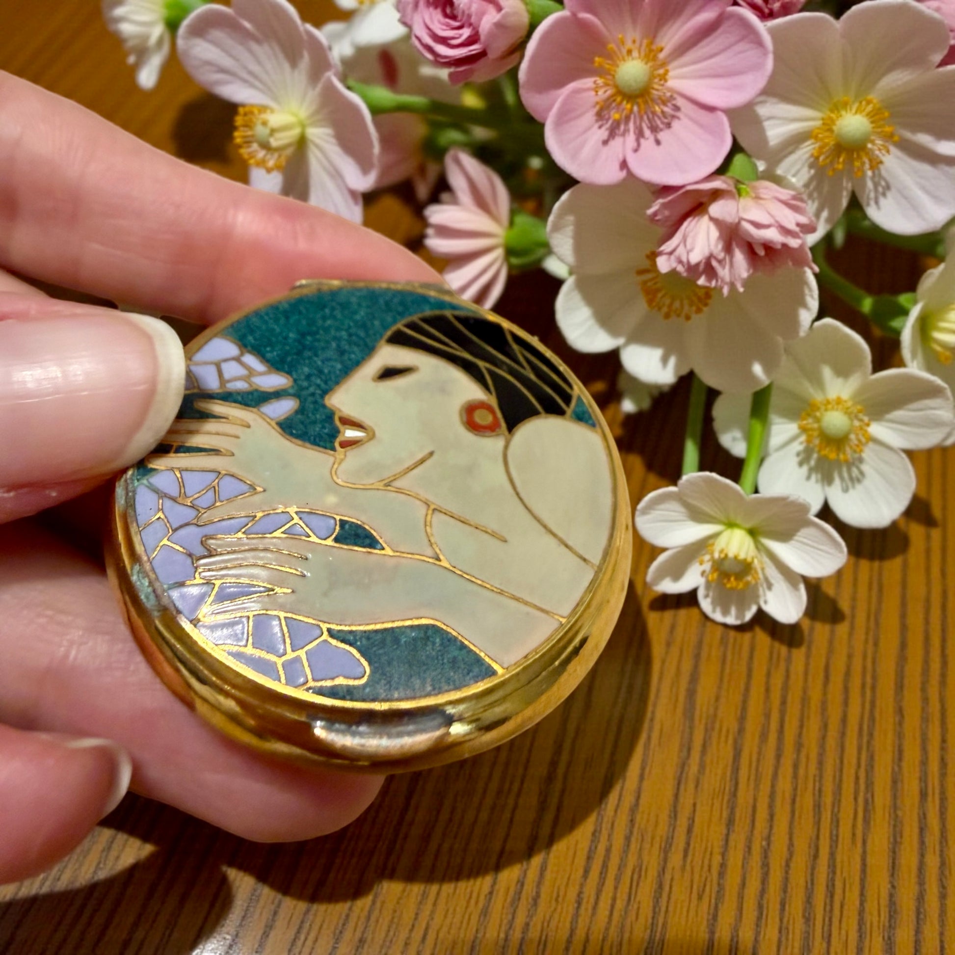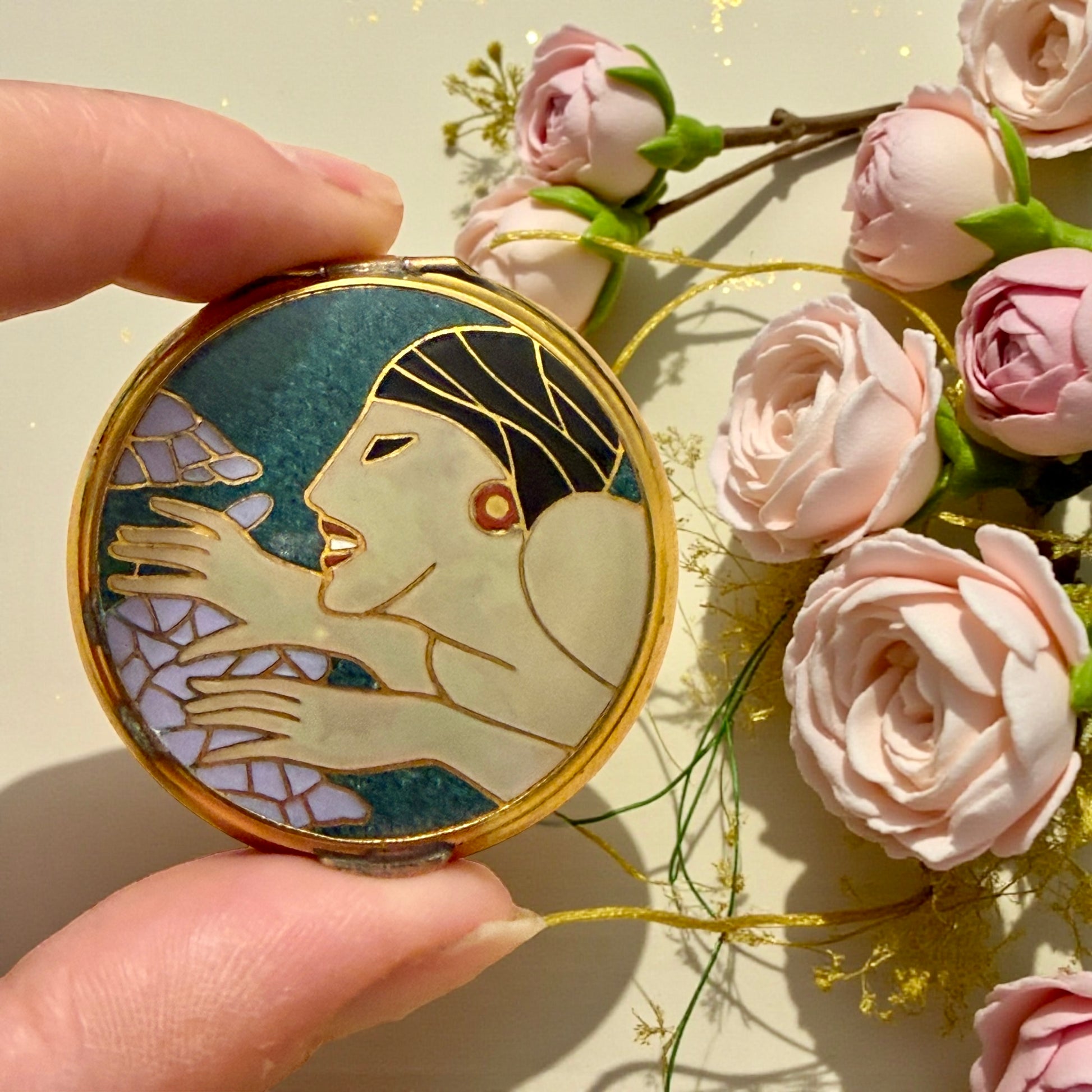 Portacipria compatto da borsetta in ottone dorato con decorazione a smalto.