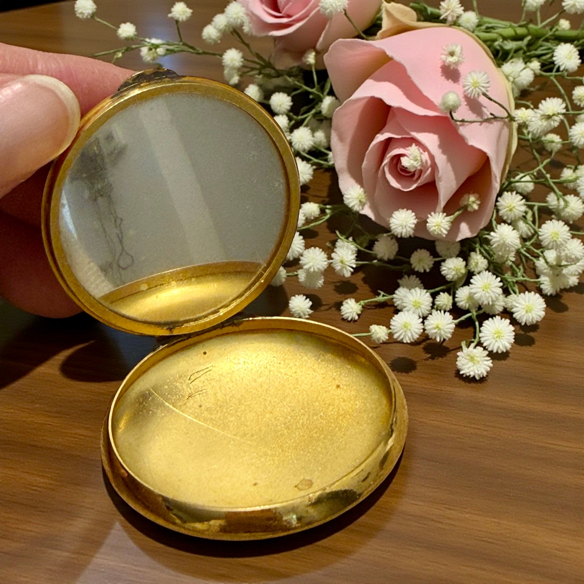 Una donna con cuffia da bagno, le mani aperte, come se stesse per accogliere o per danzare. Questo piccolo portacipria racconta un tempo in cui anche il gesto più quotidiano — ritoccare il viso — diventava un rituale elegante. La figura femminile, sospesa nel suo mare artistico, sembra muoversi ancora oggi leggera e consapevole; con quella grazia tipica degli anni Trenta. Pensato per stare in una borsetta, accompagnava le donne nella vita di ogni giorno: un oggetto intimo, personale, silenzioso. All’interno conserva lo specchio originale in stato perfetto. Un poudrier che si può usare perfettamente ancora oggi. Un piccolo compagno di viaggio, discreto e poetico, capace di attraversare decenni senza perdere fascino e soprattutto carattere.
