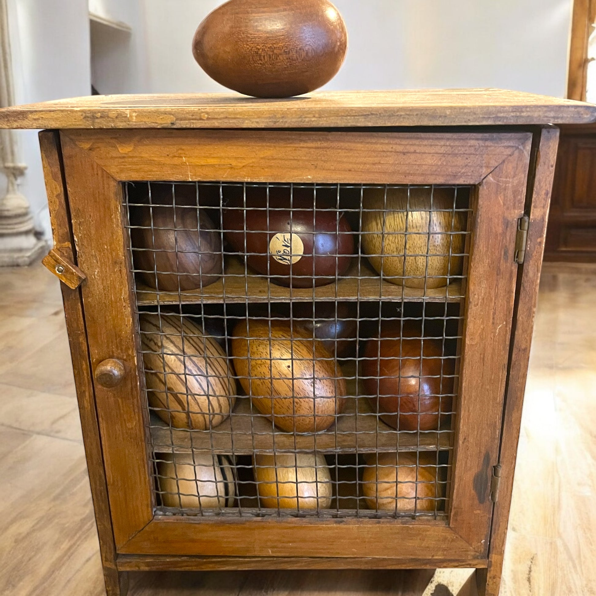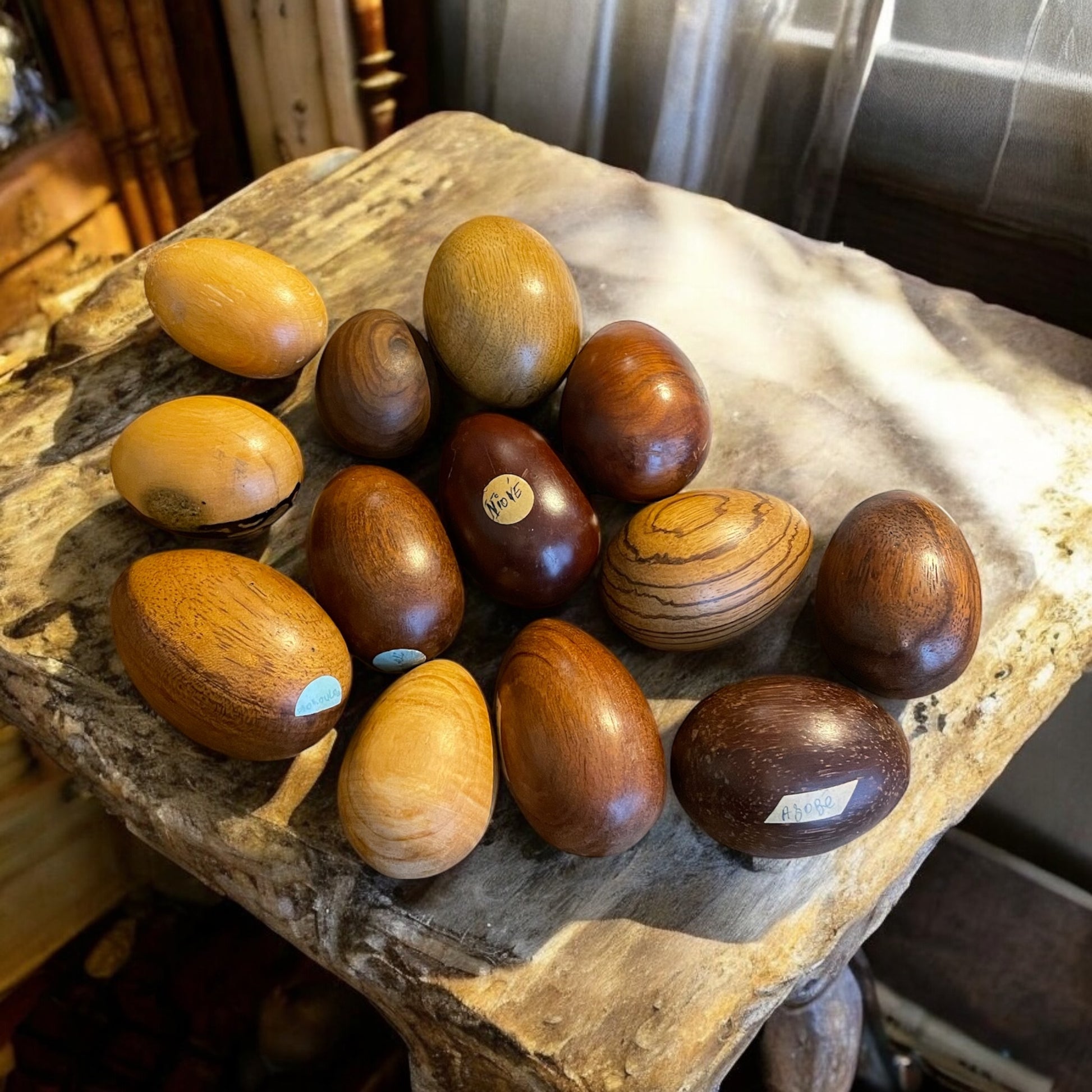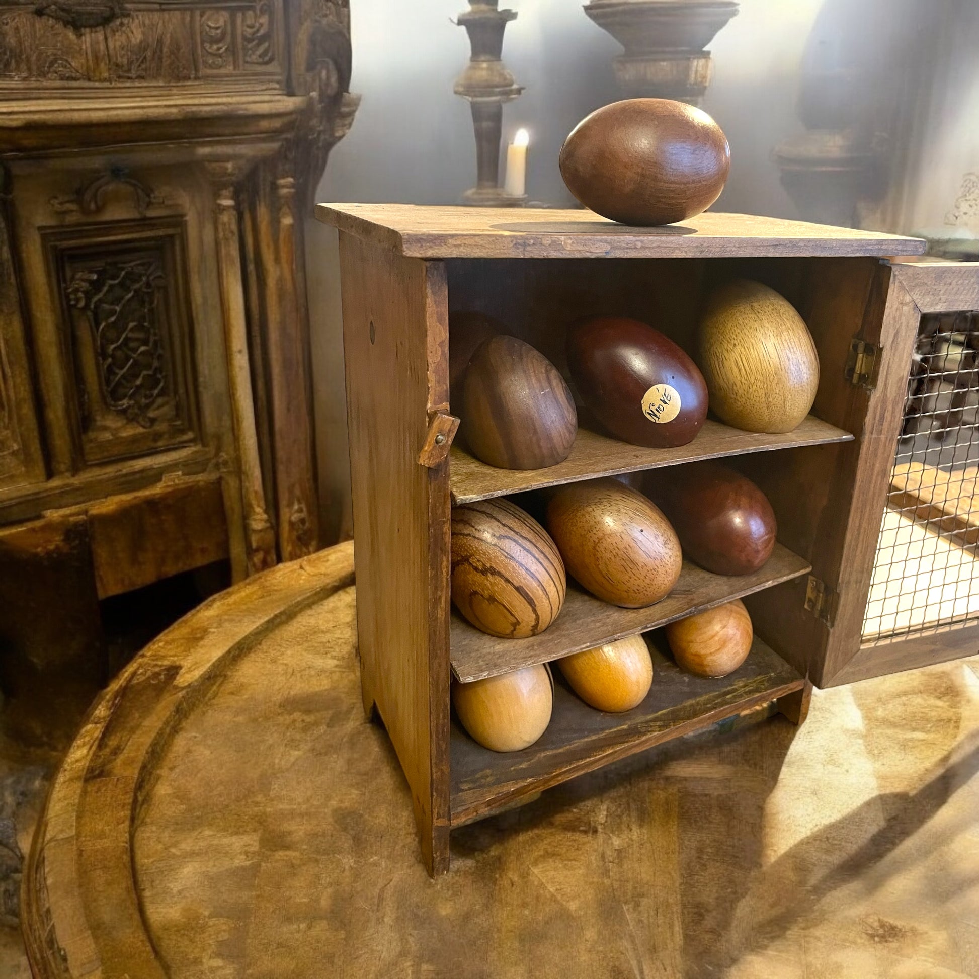 Oggi una CHICCA… l’affascinante campionario di essenze lignee esotiche, composto da 13 uova in legno, ciascuna meticolosamente tornita per esaltarne venature e texture, etichettata con il nome della specie legnosa: bubinga, kiové, abobé e altre ancora; legni provenienti dalle foreste tropicali dell’Africa. Accarezzare questi legni con le loro superfici più o meno lisce ci fa proprio sentire le mani eleganti di chi, durante la Belle époque, sceglieva l’essenza linea più adatta alla propria anima e alla propria dimora - lontani ancora i pensieri della guerra. Realizzato nel primo Novecento, questo campionario di chiara impronta coloniale racconta la storia di un’epoca in cui i legni preziosi erano riservati ad artigiani d’élite, mercanti e clienti di un certo ceto. La sua origine francese, testimoniata dalla sua provenienza, evoca il legame tra il Paese e le sue colonie africane, allora fonte di materiali esotici ricercati. Ad accompagnarlo, una curiosa bacheca in legno degli anni ’50, originariamente utilizzata come porta-uova contadino per lasciar riposare le uova fresche delle galline: l’ex proprietario l’aveva adattata come contenitore per custodire questo straordinario campionario di famiglia. Dunque una coppia di oggetti che raccontano due storie: quella semplice e autentica della vita rurale, e quella raffinata e ambiziosa delle esplorazioni coloniali e della lavorazione artigianale. Due mondi che si incontrano per caso, ritirati insieme dalla stessa dimora, e pronti a conquistare nuove pagine di storia.