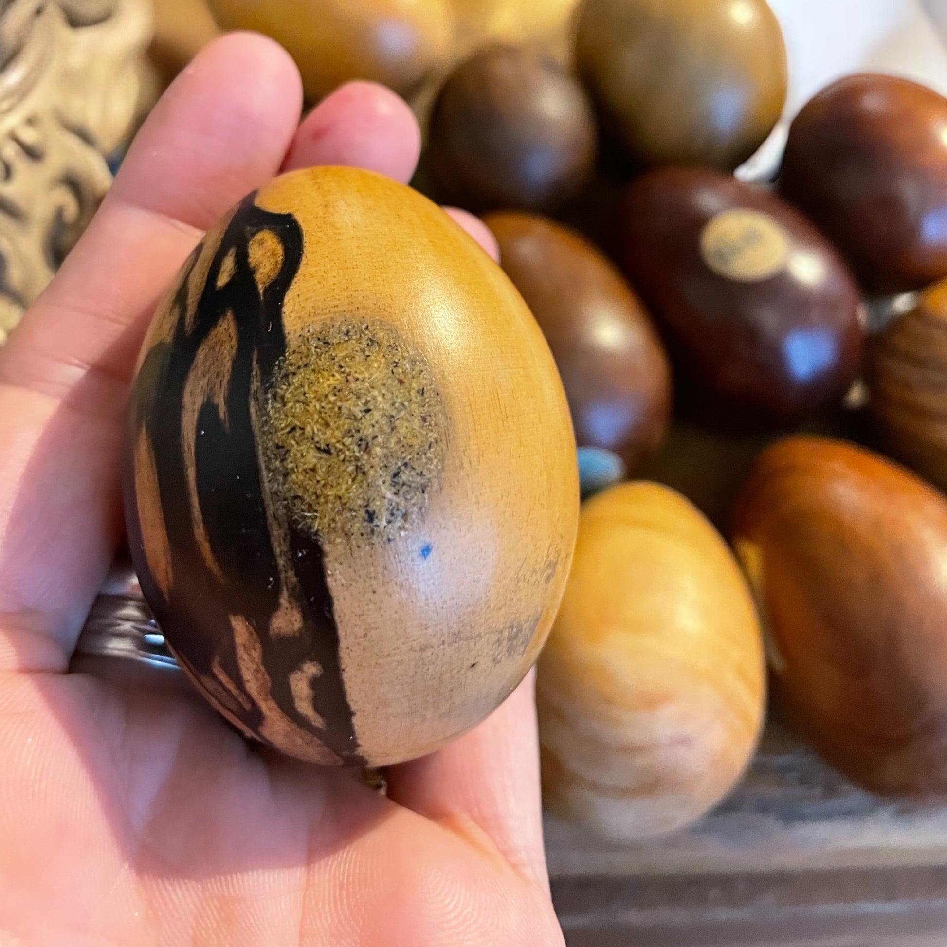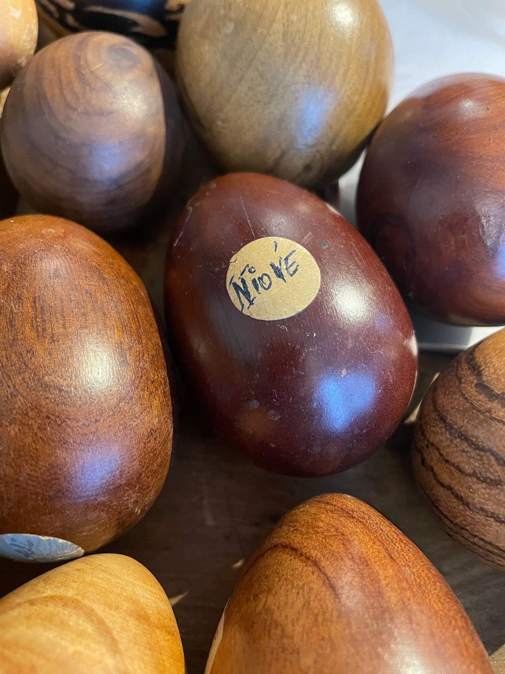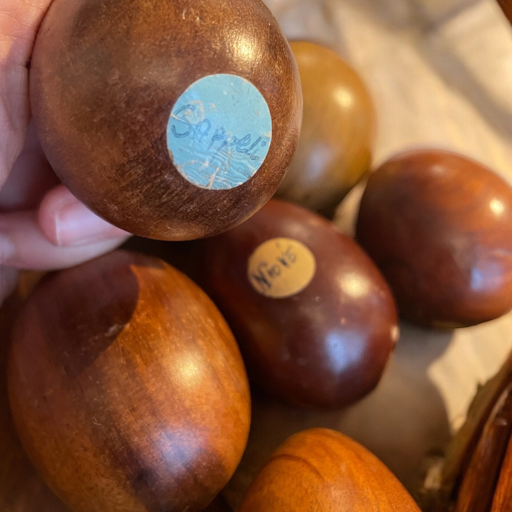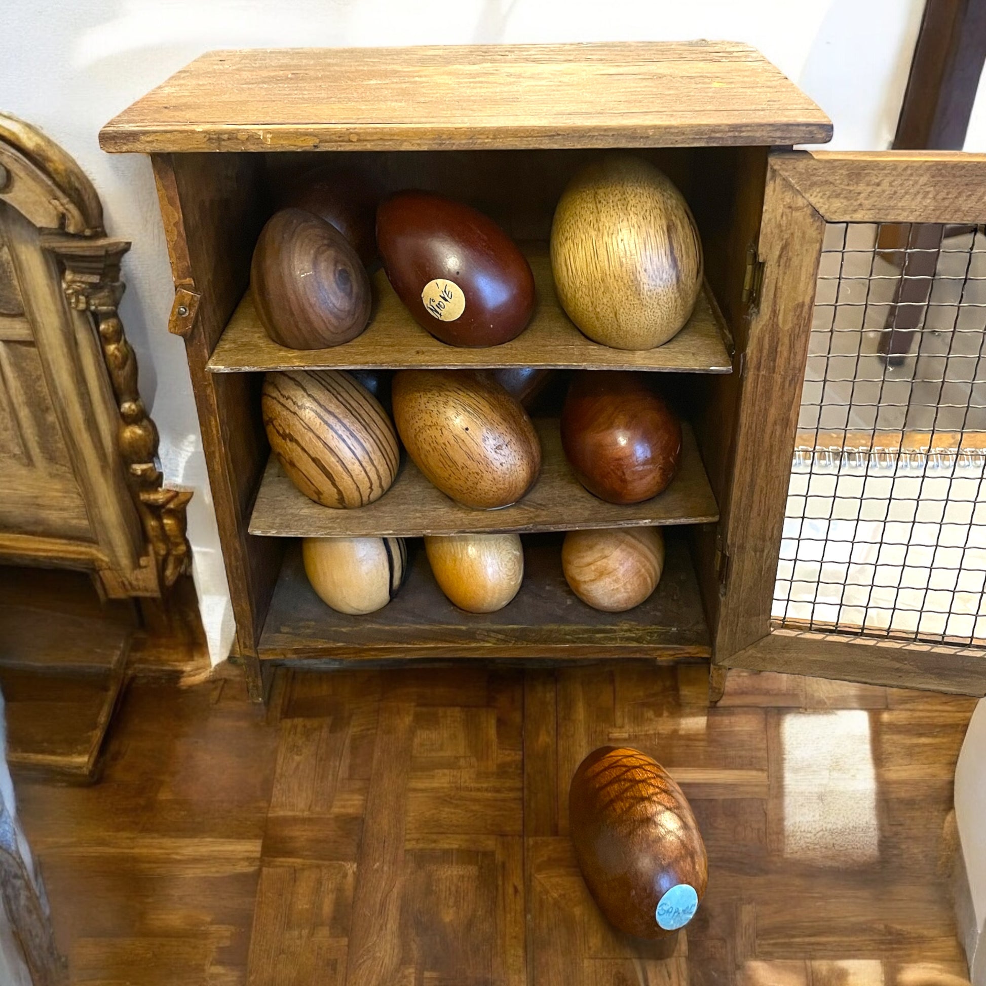 Oggi una CHICCA… l’affascinante campionario di essenze lignee esotiche, composto da 13 uova in legno, ciascuna meticolosamente tornita per esaltarne venature e texture, etichettata con il nome della specie legnosa: bubinga, kiové, abobé e altre ancora; legni provenienti dalle foreste tropicali dell’Africa. Accarezzare questi legni con le loro superfici più o meno lisce ci fa proprio sentire le mani eleganti di chi, durante la Belle époque, sceglieva l’essenza linea più adatta alla propria anima e alla propria dimora - lontani ancora i pensieri della guerra. Realizzato nel primo Novecento, questo campionario di chiara impronta coloniale racconta la storia di un’epoca in cui i legni preziosi erano riservati ad artigiani d’élite, mercanti e clienti di un certo ceto. La sua origine francese, testimoniata dalla sua provenienza, evoca il legame tra il Paese e le sue colonie africane, allora fonte di materiali esotici ricercati. Ad accompagnarlo, una curiosa bacheca in legno degli anni ’50, originariamente utilizzata come porta-uova contadino per lasciar riposare le uova fresche delle galline: l’ex proprietario l’aveva adattata come contenitore per custodire questo straordinario campionario di famiglia. Dunque una coppia di oggetti che raccontano due storie: quella semplice e autentica della vita rurale, e quella raffinata e ambiziosa delle esplorazioni coloniali e della lavorazione artigianale. Due mondi che si incontrano per caso, ritirati insieme dalla stessa dimora, e pronti a conquistare nuove pagine di storia.