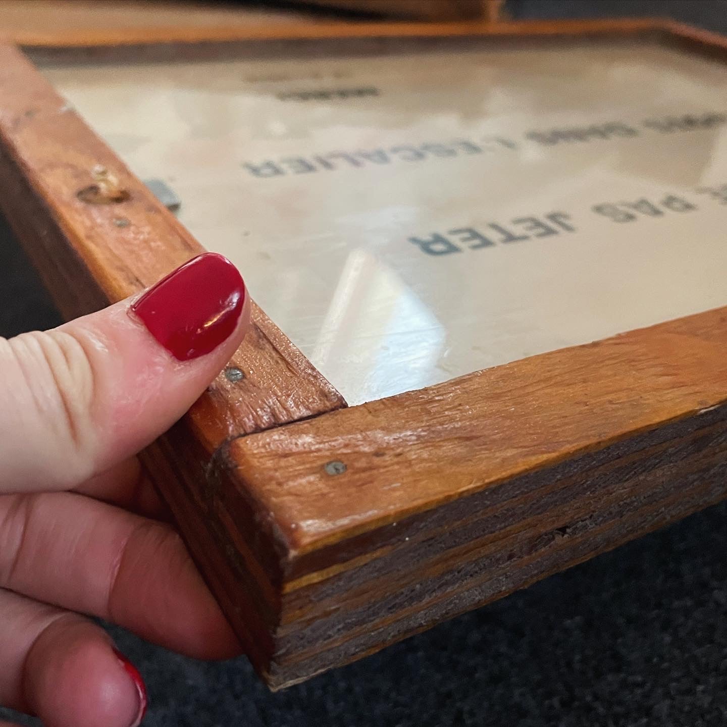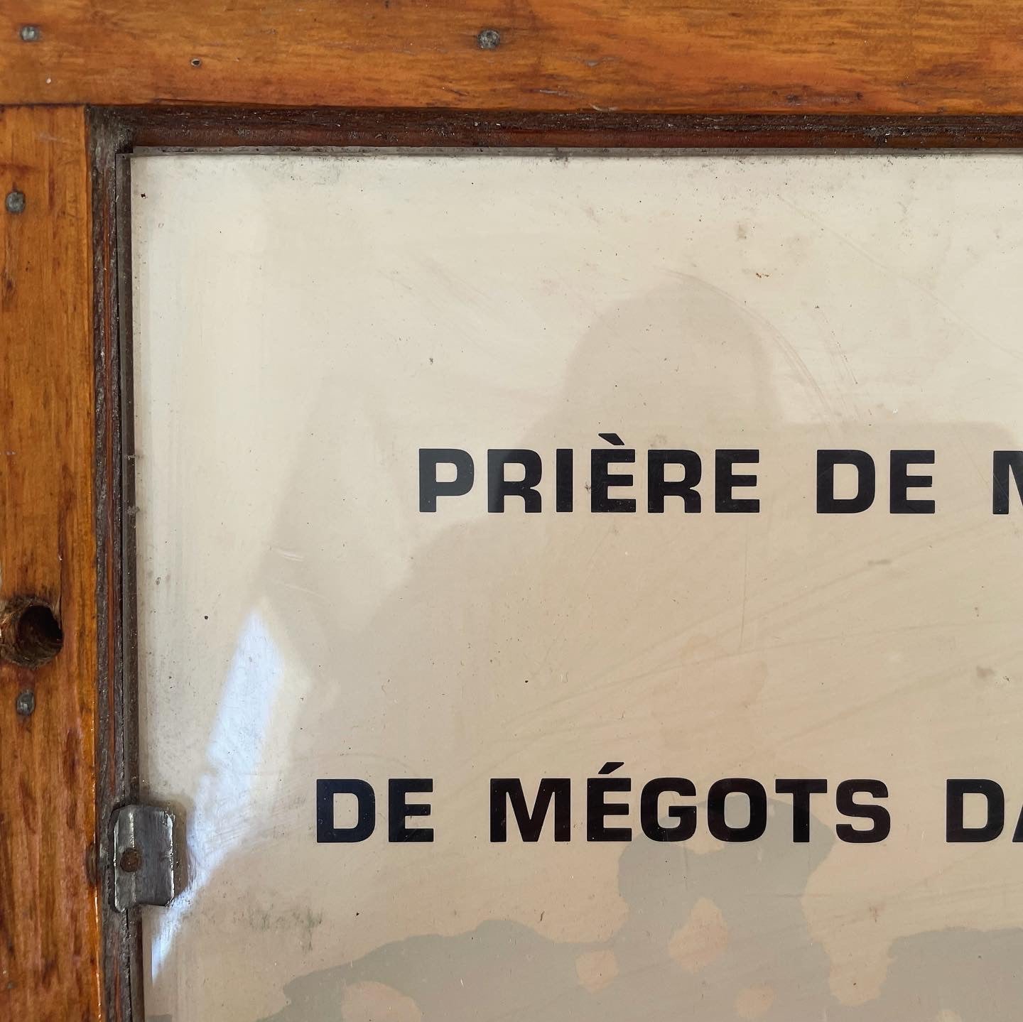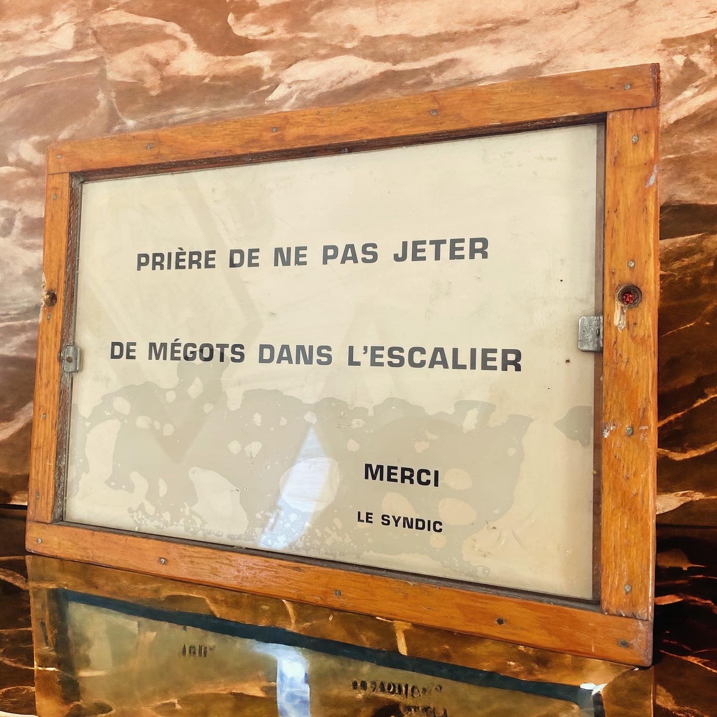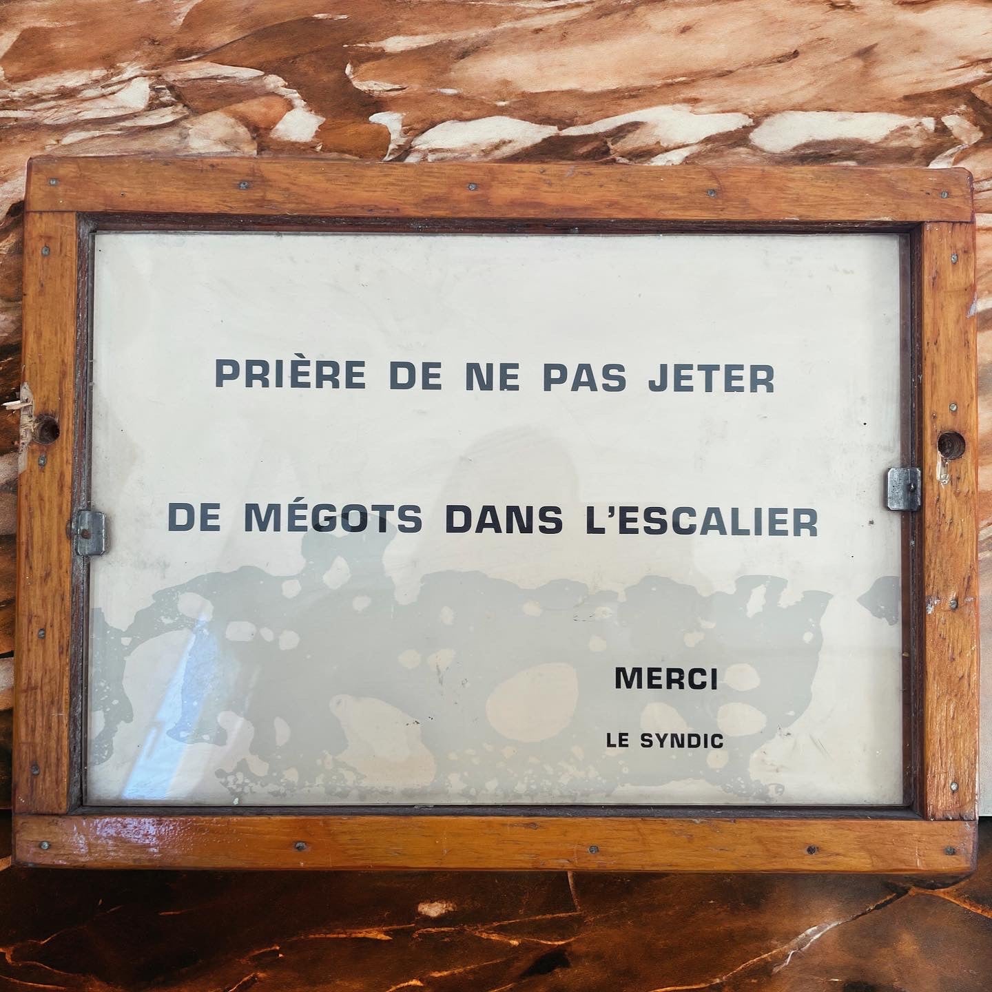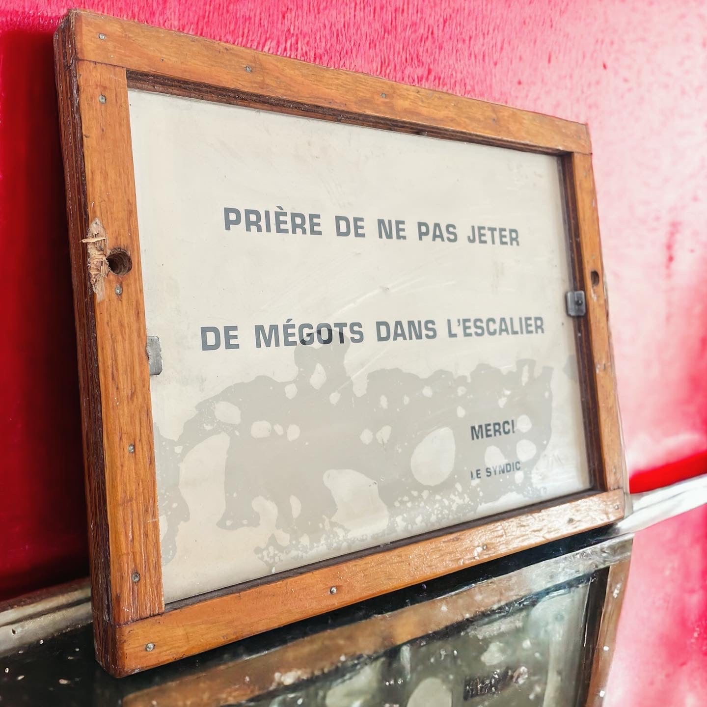 Beautiful painting in a thick wooden frame with glass with a notice that reads "please do not throw cigarette butts along the stairs". This notice comes, with its original frame of the time, from a headquarters of the French Section of the Workers' International. Period 60s, very good condition of the frame and glass, some marks on the internal paper. Excellent interesting price of industrial furniture. Dimensions 35 × 25 cm.