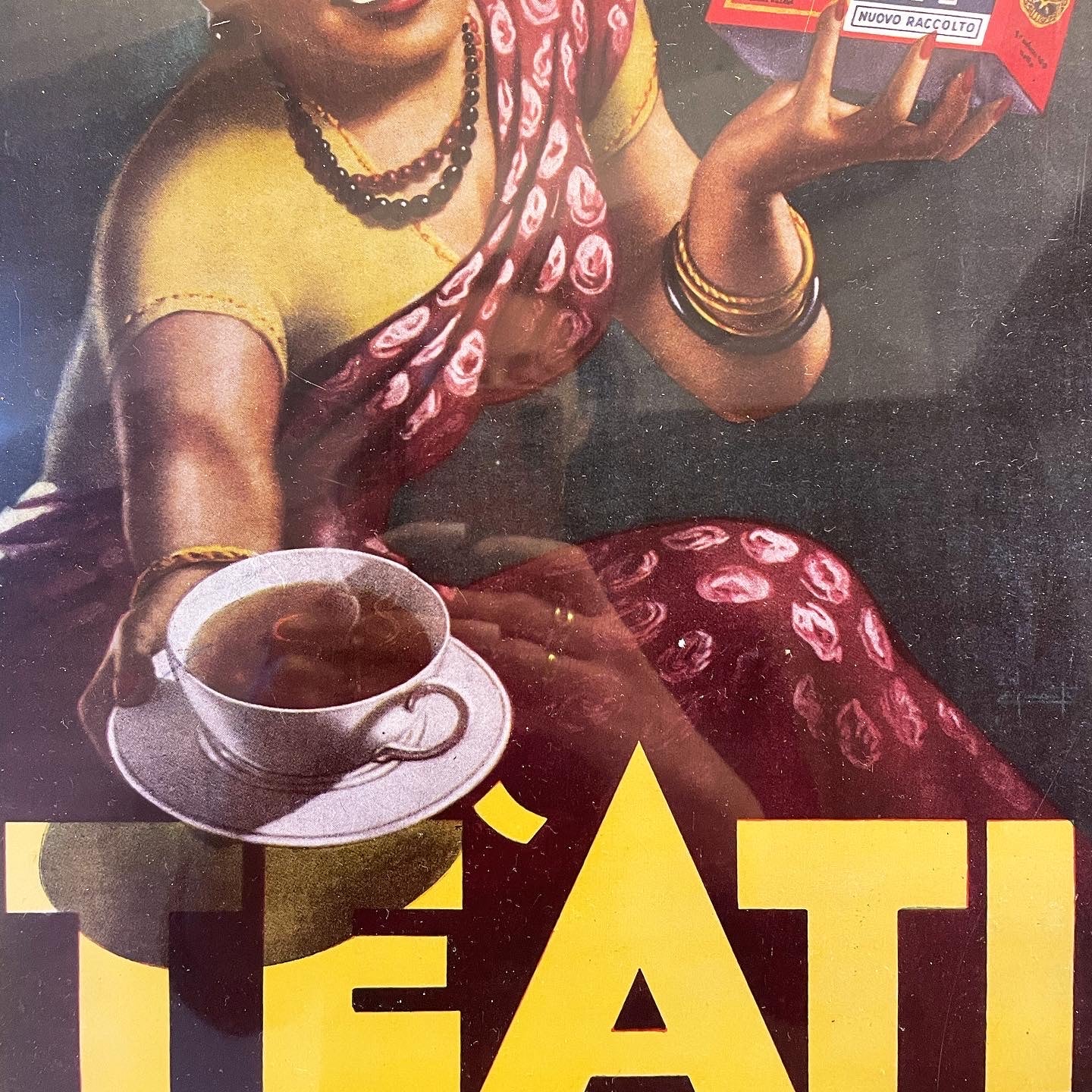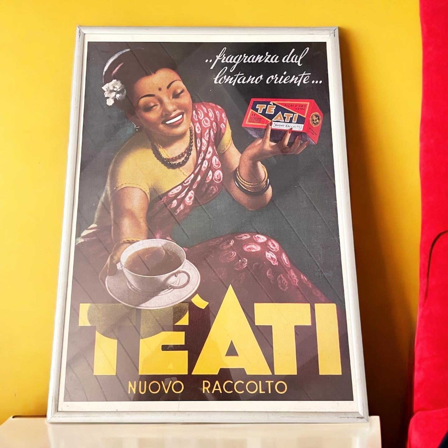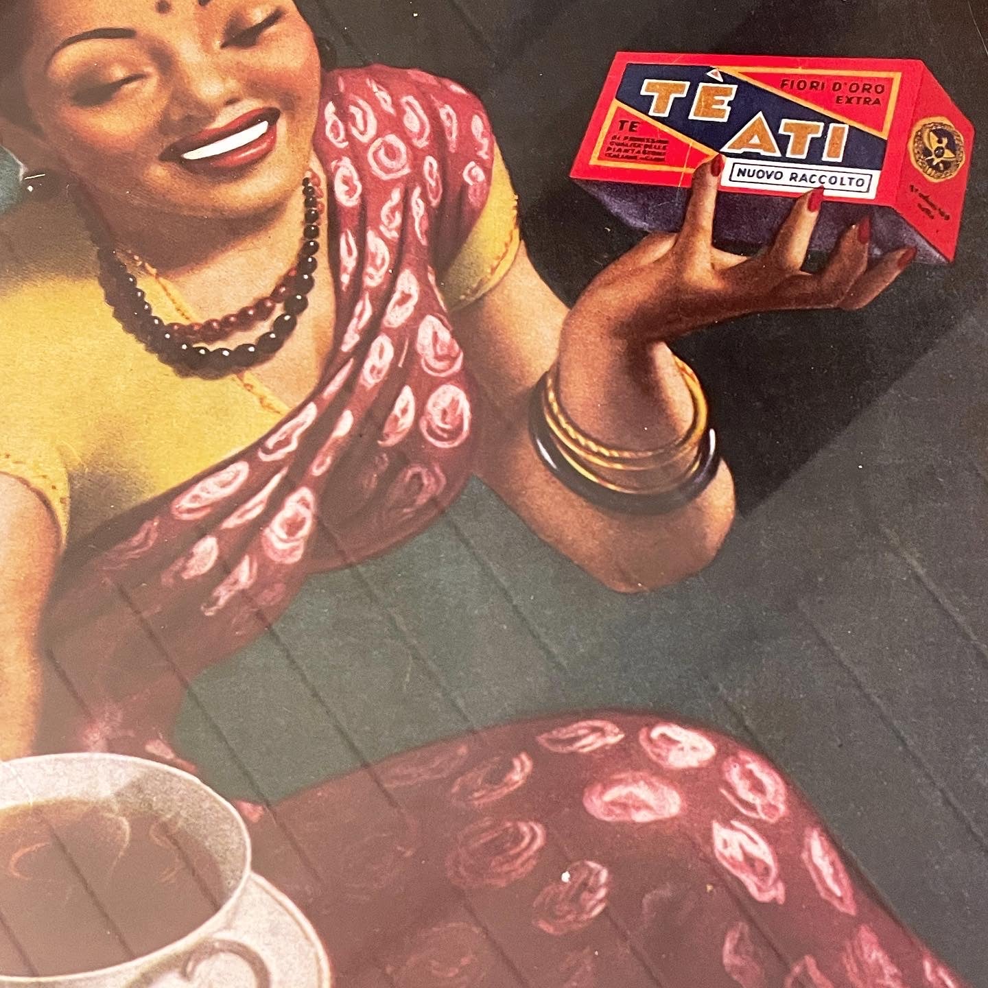 advertising picture 40 x 30 cm produced in the 90s with the #historical advertising of #ati #tea from the #50s, when it was still accepted that the protagonist of advertising language was the ethnic-geographical origin - and here is the #oriental girl wrapped in her traditional dress. Aesthetically it has always been a beautiful #advertisement and will be a classy #vintage decor in a #teasalad.