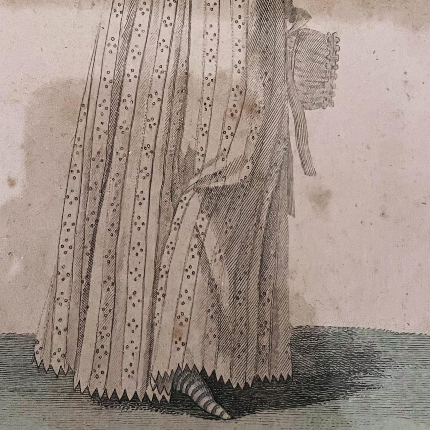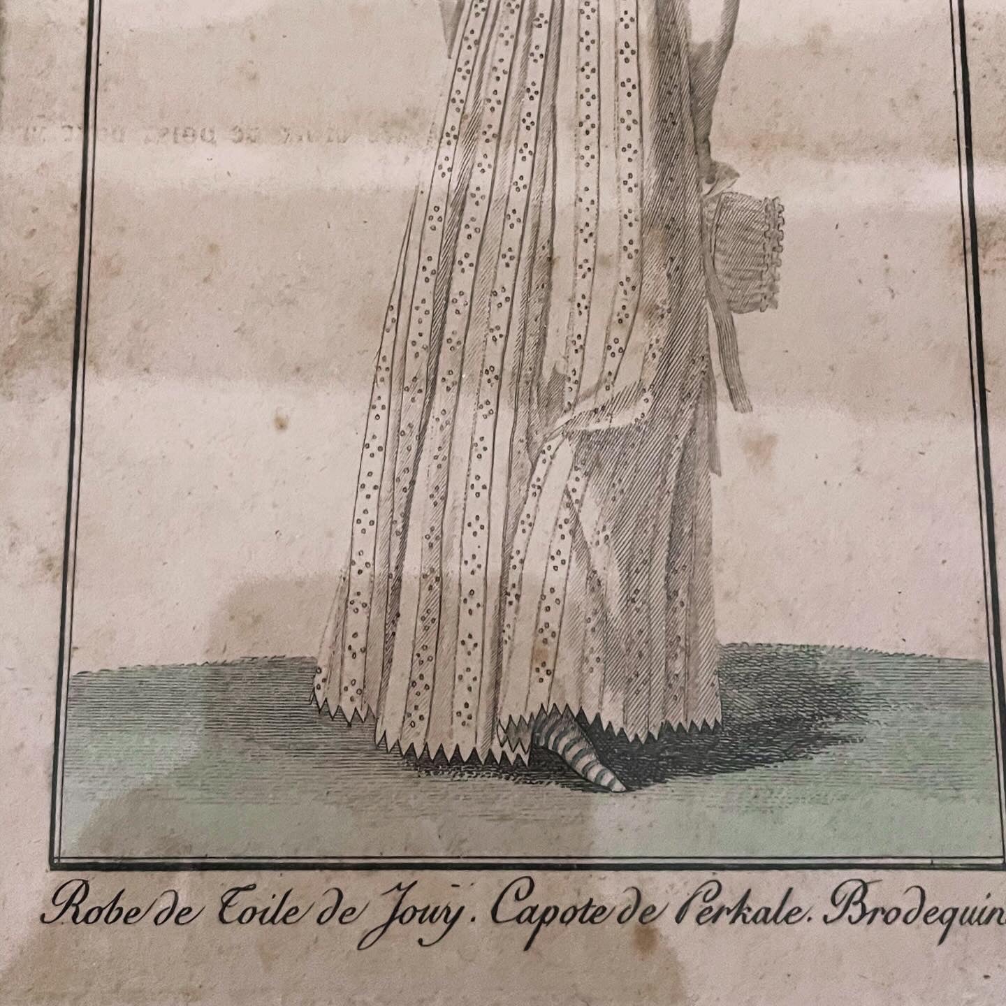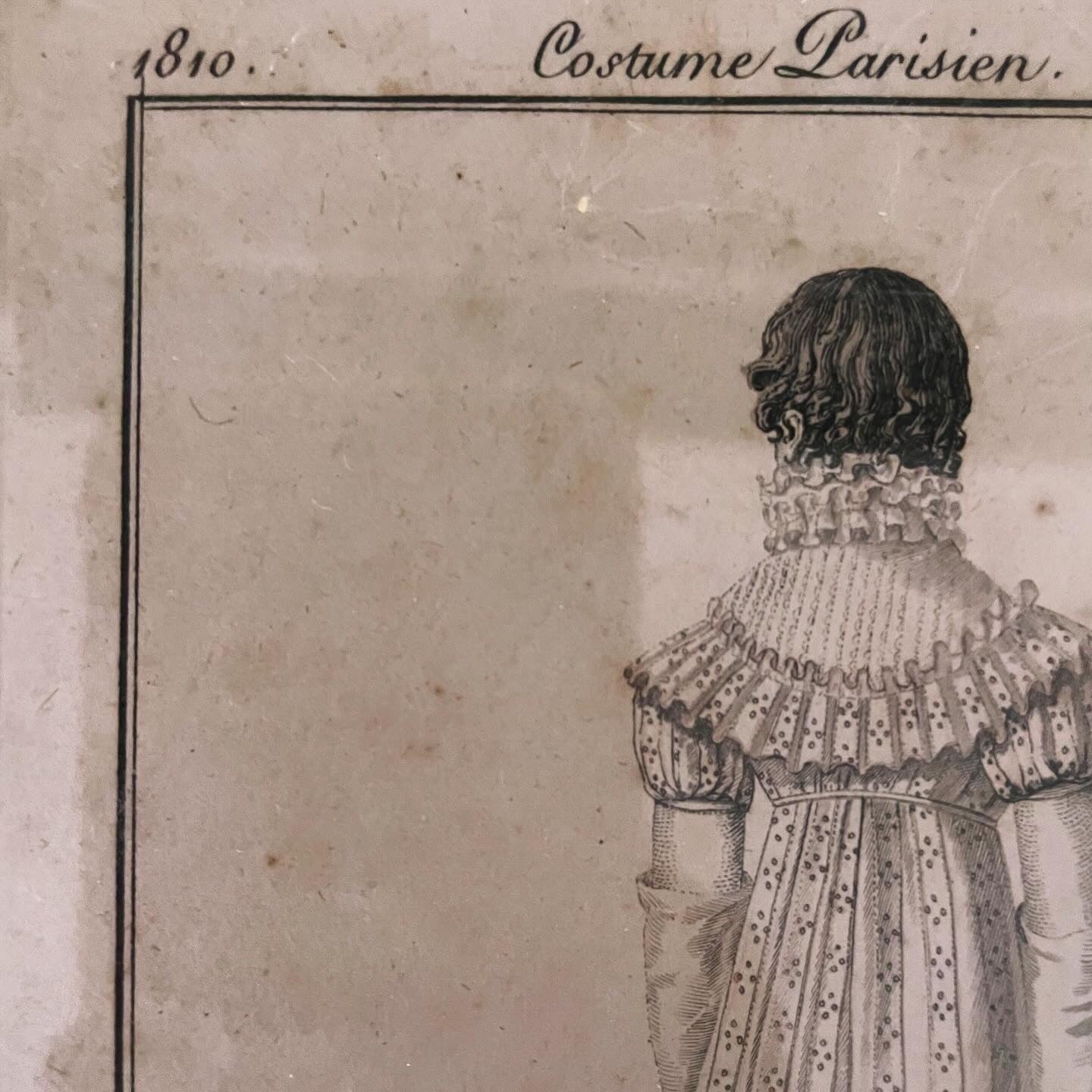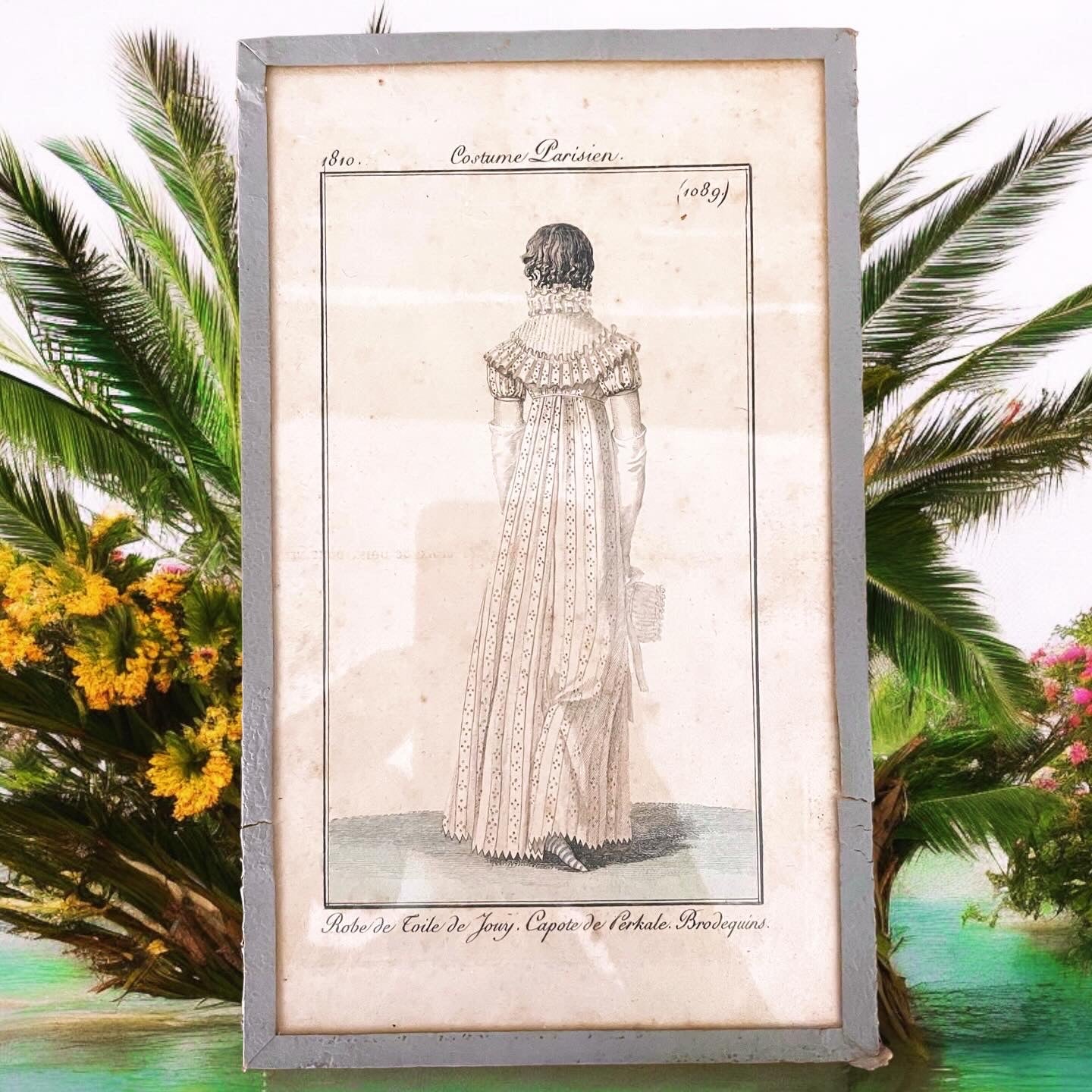 Also from the same villa from which we took the painting published above ... delightful nineteenth-century millinery print that proposes and describes a wonderful dress in percale and broderies, combined with the headdress and the large collar, as well as with gloves up to the forearm. period first half of the nineteenth century; the sketch is numbered and was subsequently framed with glass (the glass is in perfect condition) at the end of the nineteenth century. Dimensions: 21.5 x 13 cm.