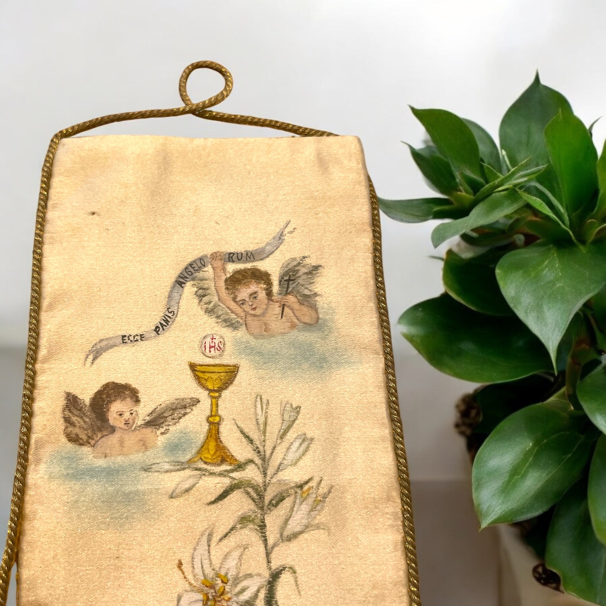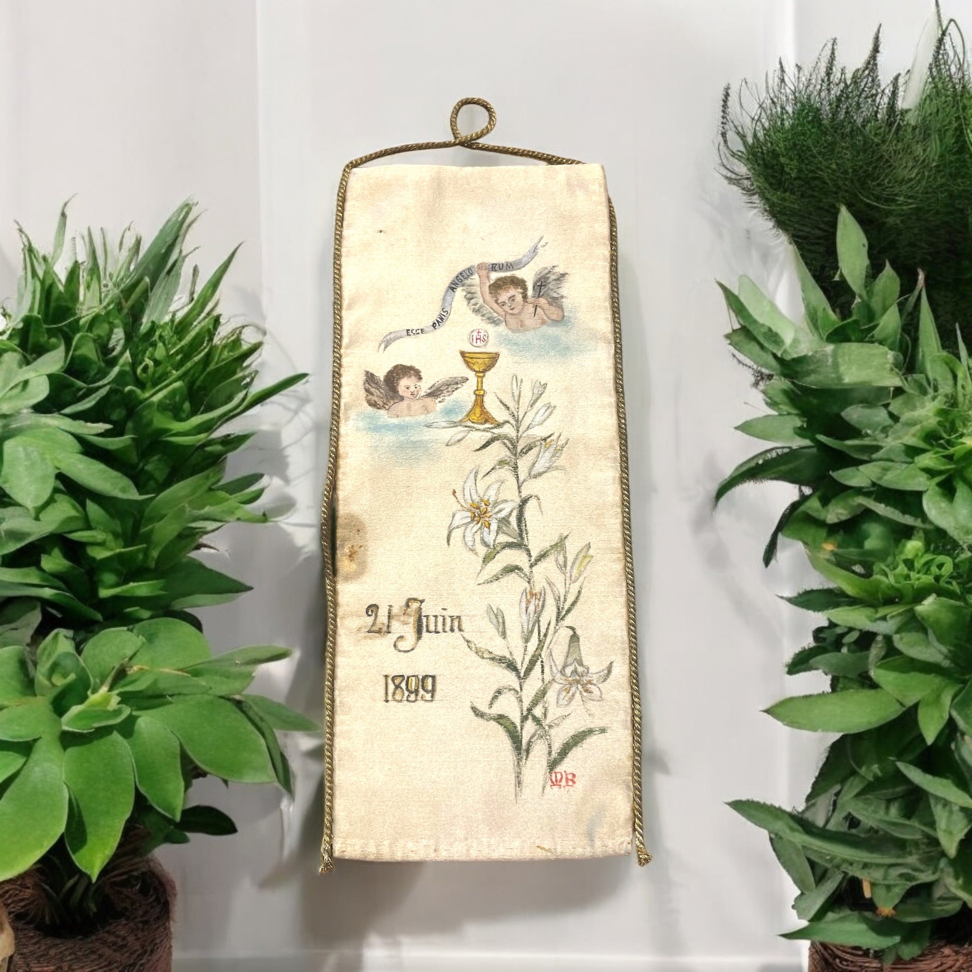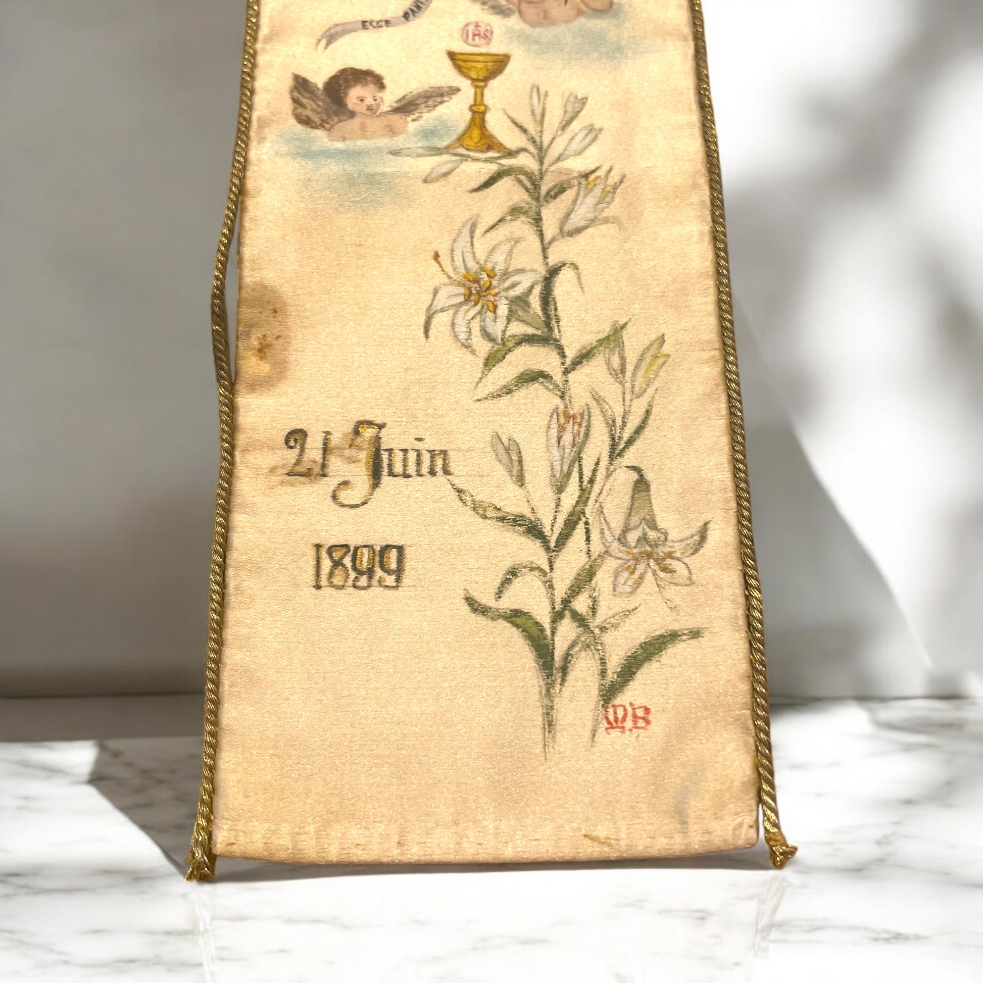 Delicato ricordo di Prima Comunione datato 21 giugno 1899, dipinto a mano su seta con bordatura dorata. Due angioletti tra le nuvole vegliano su un calice dorato, mentre un nastro recita “Ecce Panis Angelorum”. Al centro, un ramo di gigli bianchi simboleggia la purezza del sacramento. L’opera, firmata con le iniziali DB, unisce devozione e finezza ottocentesca. Probabilmente da Boule. Lunghezza cm 16.
