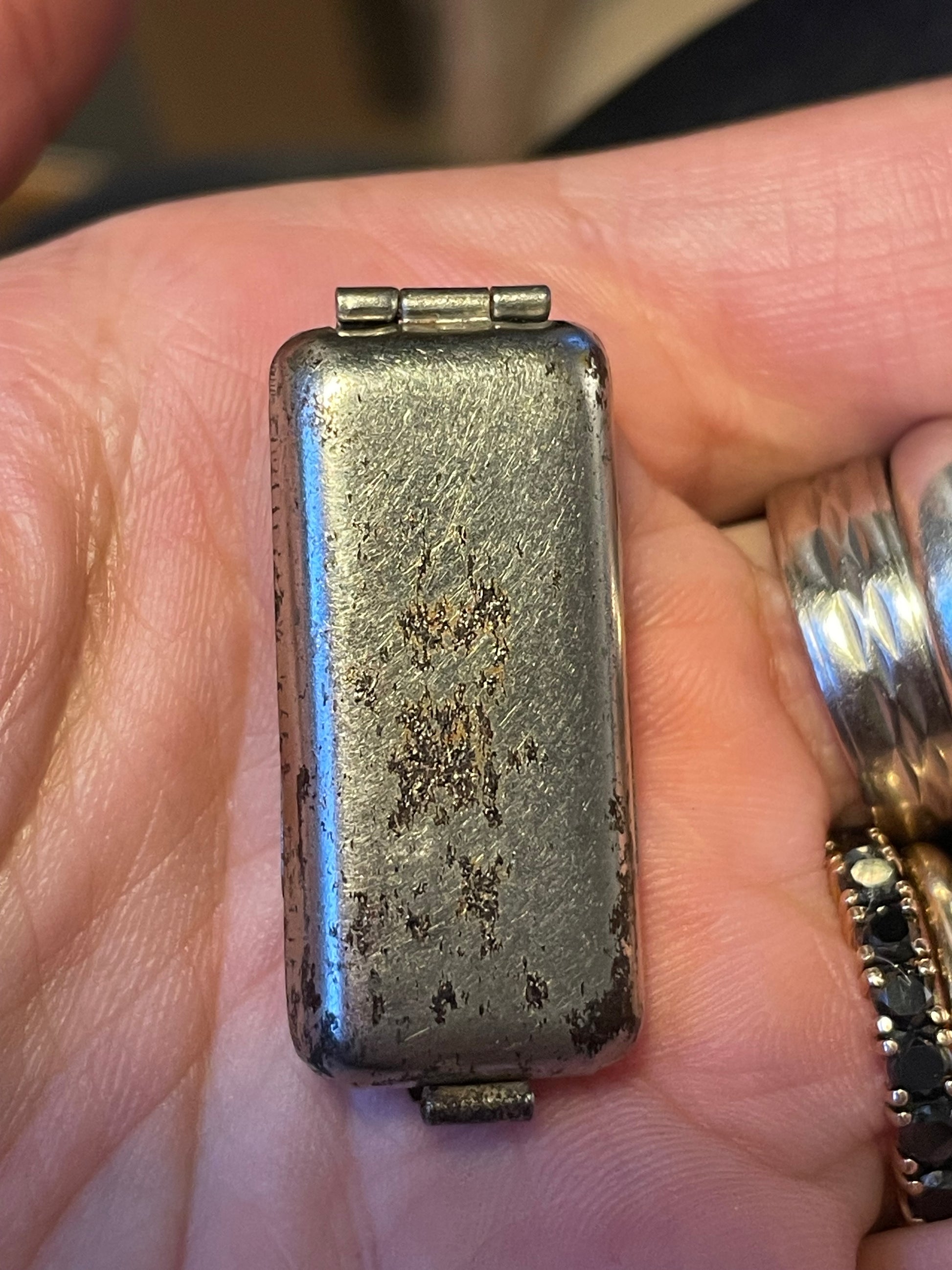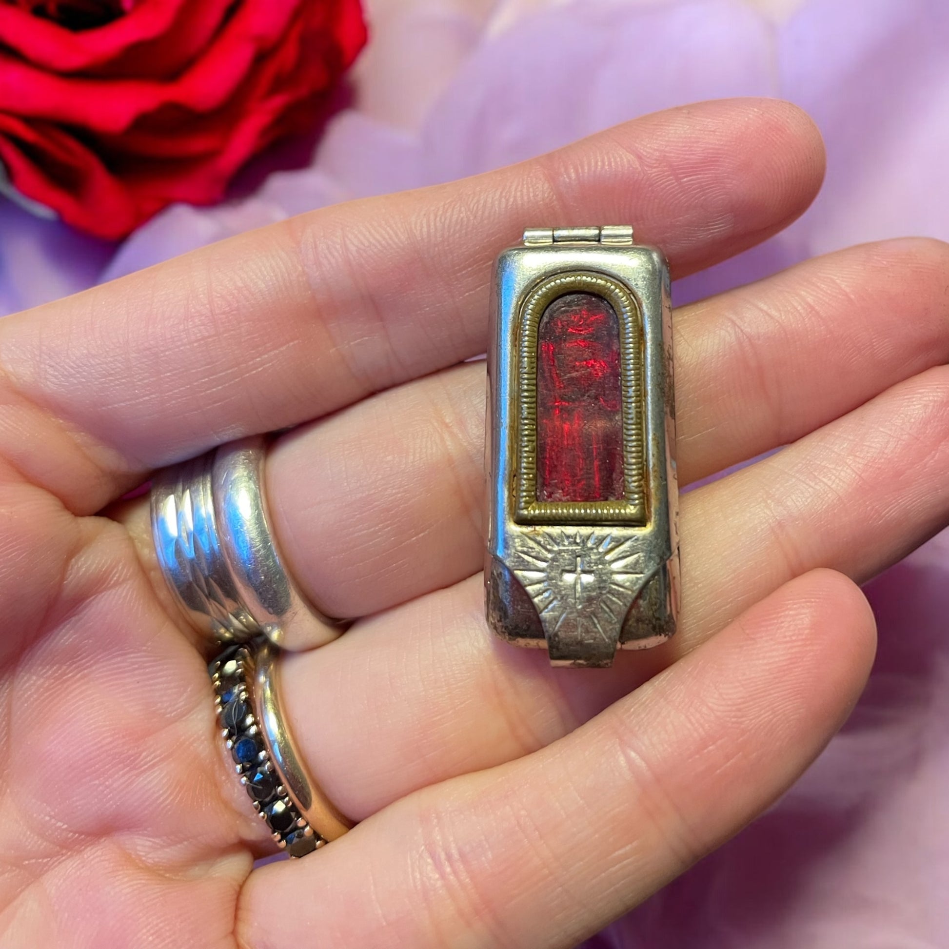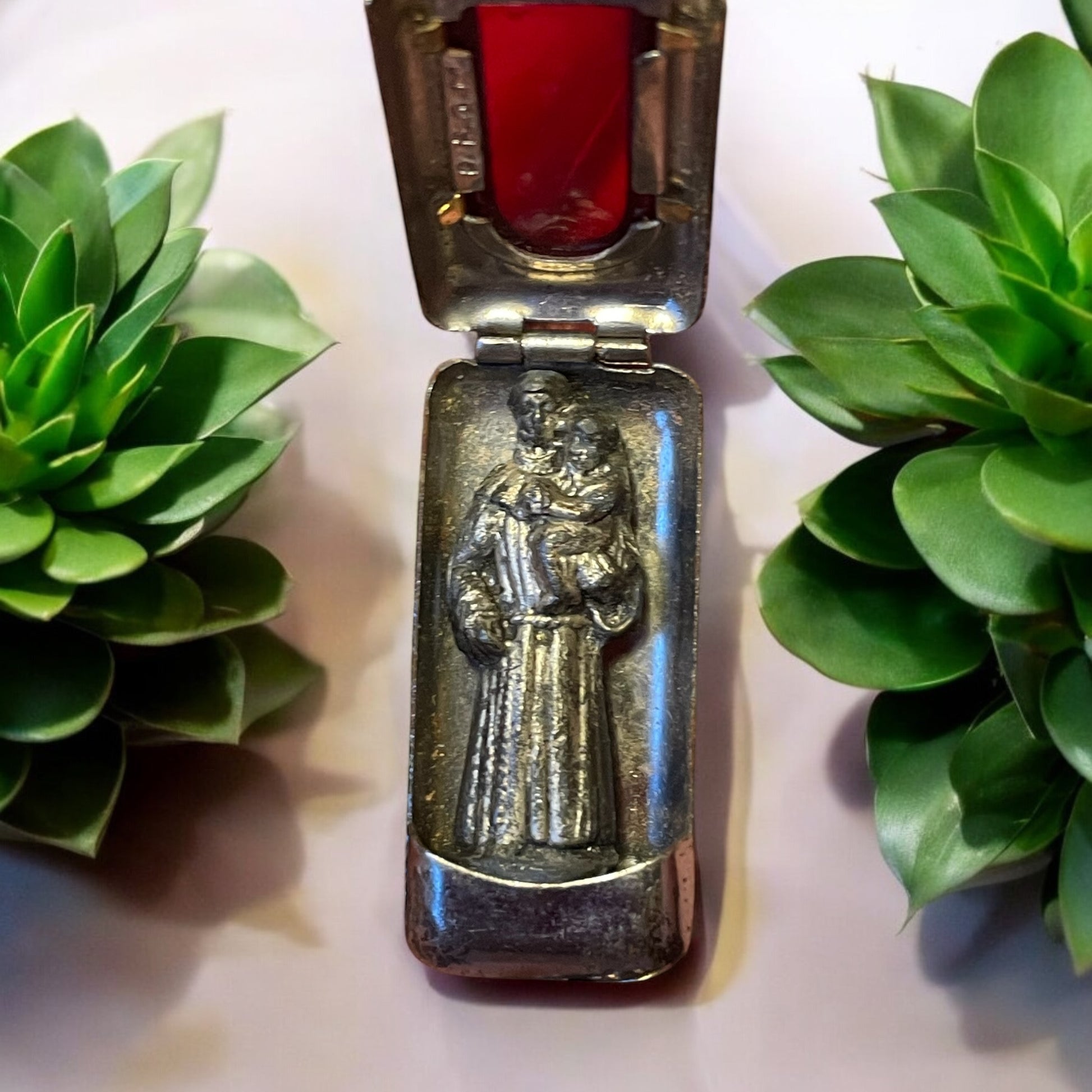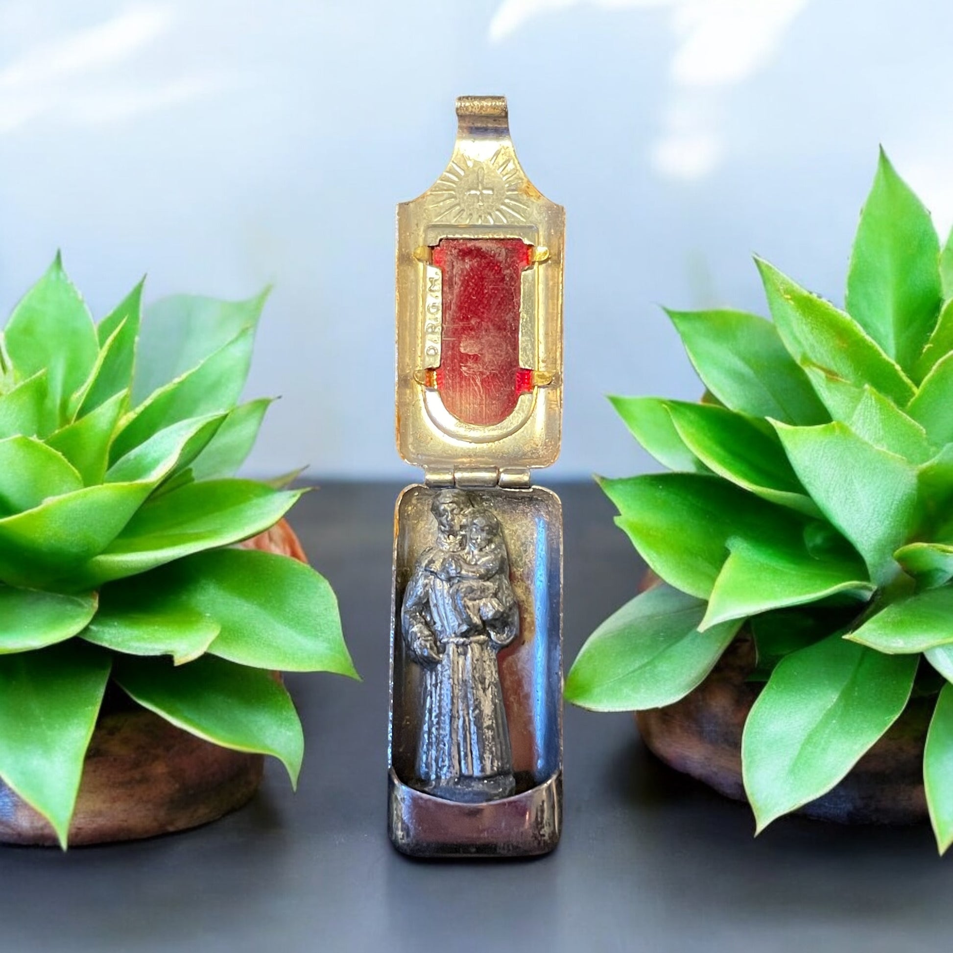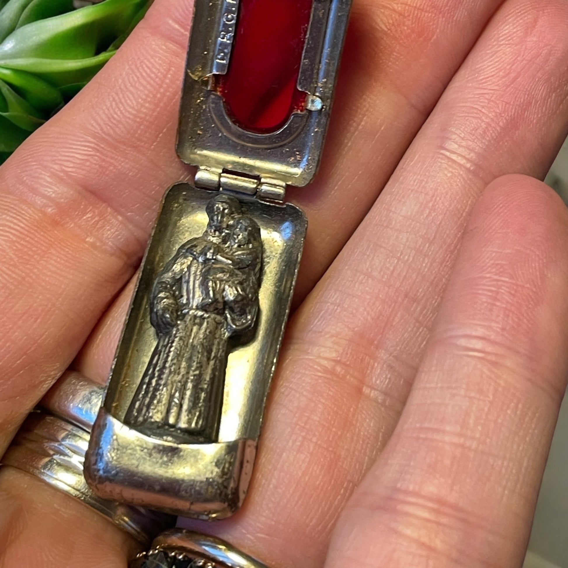 Vi presentiamo un oggetto assolutamente inusuale… Chiudendo il palmo attorno a questo piccolo oggetto, si può quasi immaginare il calore della mano che un tempo lo stringeva, la fede silenziosa di chi lo portava con sé, nascosto in una tasca o in una borsetta, come un talismano di protezione. Un reliquiario tascabile, discreto ma potente, pronto a essere aperto con un gesto familiare per rivelare l’immagine di Sant’Antonio di Padova con il Bambino, simbolo di intercessione e conforto spirituale. Il piccolo sportello cela un’area protetta da una lastra color rubino, sotto la quale poteva trovarsi una reliquia, una minuscola immagine o un frammento di tessuto benedetto - o, come in questo caso, la miniatura di un Santo. La chiusura, impreziosita da un motivo solare e da una croce incisa, aggiunge un dettaglio simbolico di luce e redenzione. La sigla punzonata D.R.G.M. (Deutsches Reichsgebrauchsmuster), attestando la registrazione del design in Germania, consente di circoscrivere la datazione essendo stata usata sino al 1945. Pensato per essere portato sempre con sé, questo reliquiario non era solo un oggetto di preghiera, ma un simbolo tangibile di protezione. Quanti viaggi ha affrontato? Quante dita hanno sfiorato la sua superficie liscia, cercando conforto in momenti di difficoltà? Oggi, è testimone di una fede che ha attraversato il tempo, un piccolo scrigno che conserva il fascino di un’epoca in cui ogni oggetto aveva un significato profondo, ben oltre il semplice possesso materiale.