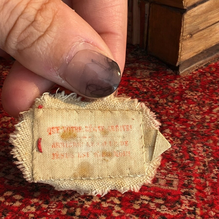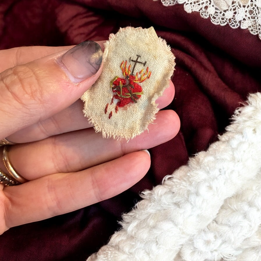 Questo scapolare devozionale, realizzato a mano in Francia tra la fine del XIX e l’inizio del XX secolo (circa 1880–1930), è un esempio di oggetto tessile religioso carico di significato e di storia. Gli scapolari erano indumenti o piccoli oggetti tessili portati a contatto con il corpo, spesso come segno di protezione e devozione personale. Questo, in particolare, si caratterizza per un ricamo finemente eseguito che raffigura il Sacro Cuore di Gesù: un cuore fiammeggiante, sovrastato dalla croce, trafitto e coronato di spine. Questi dettagli simbolici rappresentano la forza dell’amore divino, la sofferenza e il sacrificio di Gesù per l’umanità. Il tessuto sfrangiato e l’asola cucita nella parte superiore lo rendono pratico da indossare, come voleva la tradizione: lo scapolare era percepito come un segno tangibile di protezione e fede. Il ricamo vivace in rosso, verde e oro spicca sul fondo grezzo, testimonianza di una devozione semplice e popolare, radicata nella cultura religiosa francese. Perfettamente conservato per la sua età, questo scapolare offre non solo un tocco di bellezza e spiritualità, ma anche un frammento autentico della storia devozionale di fine Ottocento.