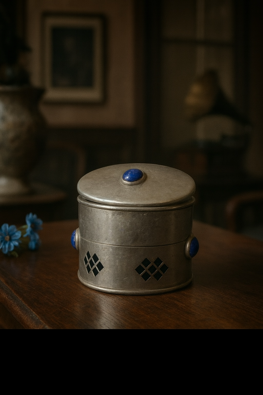 Epoca: 1925–1935. Area: Mitteleuropa (Austria/Germania). Stile: Art Déco – influenza Wiener Werkstätte. Materiale: metallo cromato (lega nichelata). Pietre: lapislazzuli naturali cabochon. Funzione: scaldaessenze / bruciaprofumi da tavolo. Condizione: ottima patina coerente con l’epoca. Dimensioni: ca. 8,5 × 6,5 cm