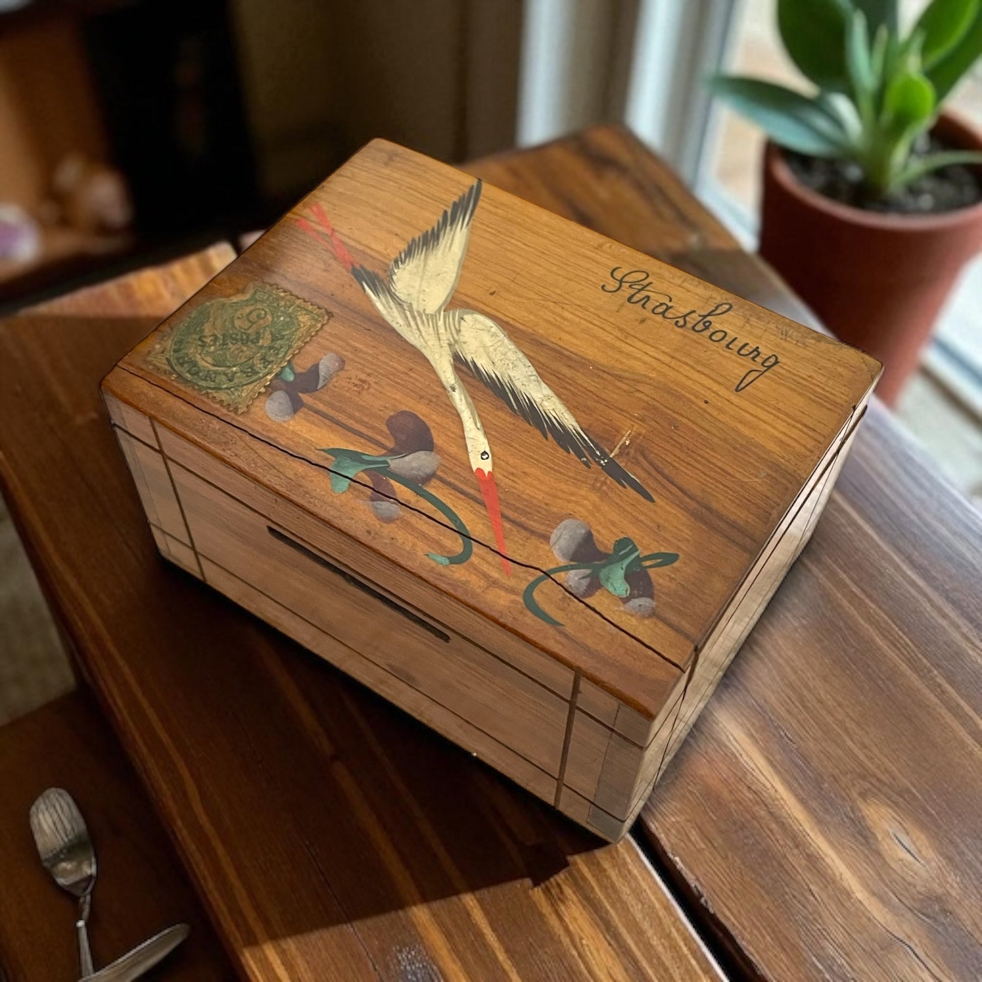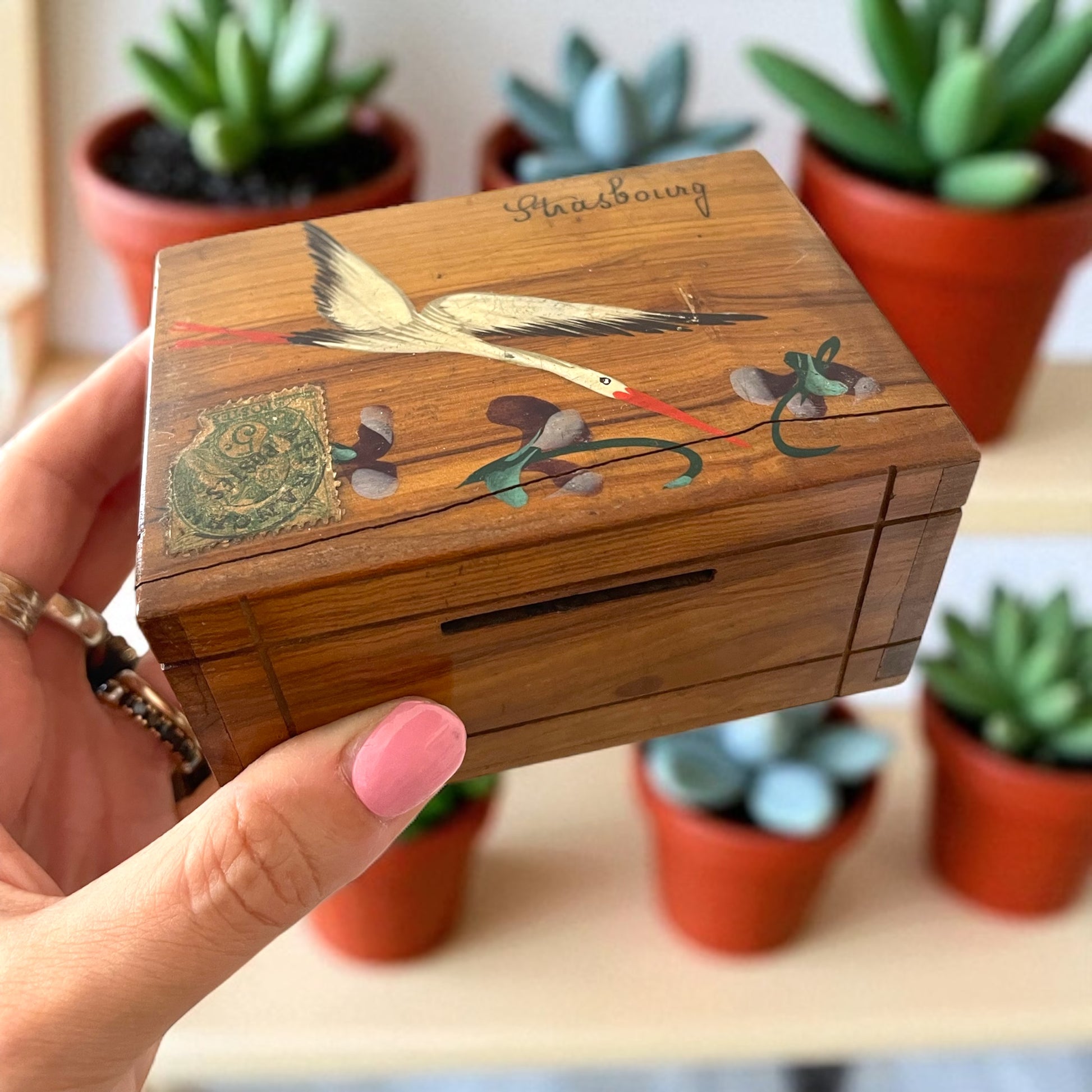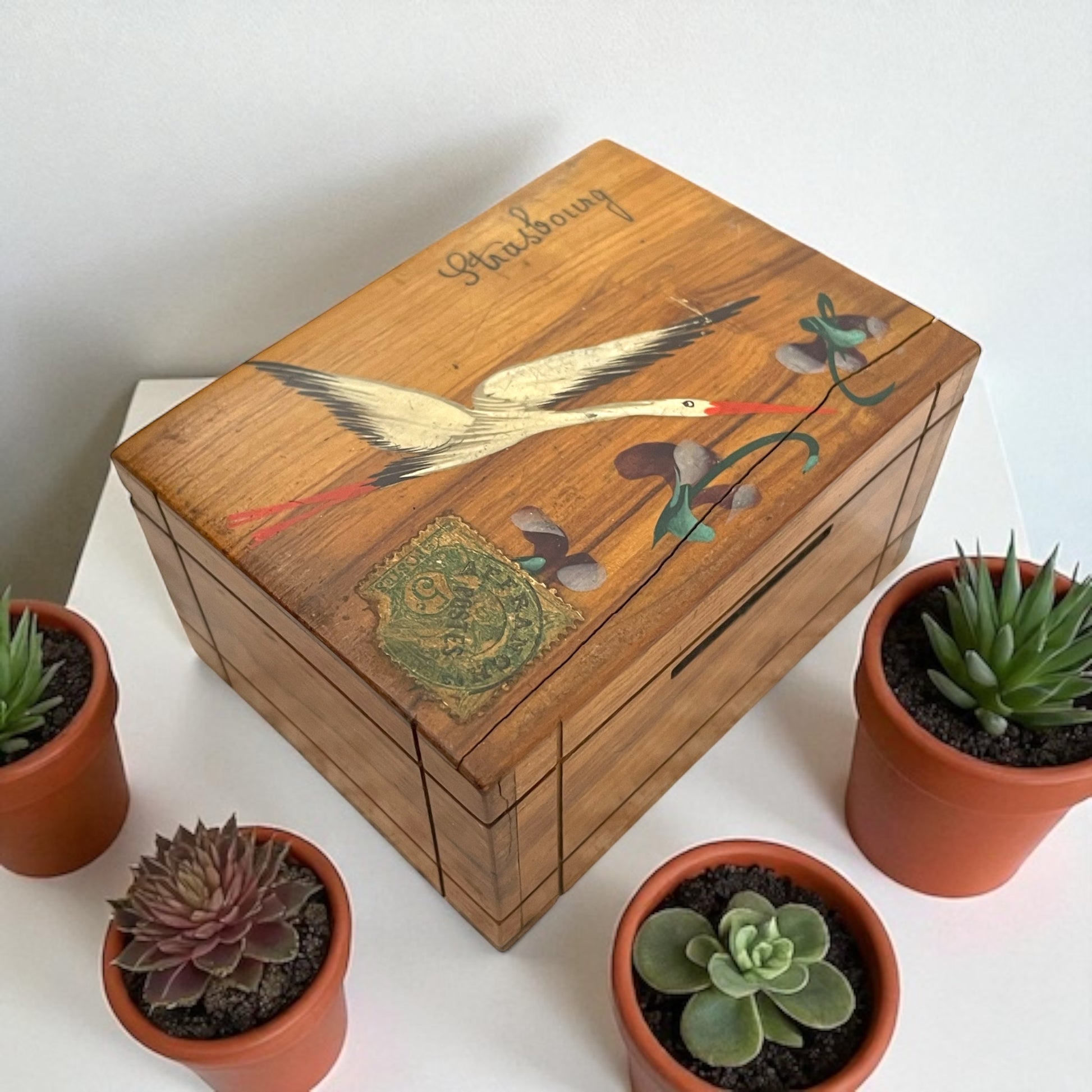 Sembra una semplice scatola di legno, ma appena la tieni tra le mani, senti che qualcosa non torna. Nessun coperchio da sollevare, nessuna serratura a vista. Solo piccole linee e incastri invisibili che raccontano un enigma. Ed è lì che comincia il gioco: un sistema segreto di apertura, pensato per proteggere le preziose monete che vi venivano inserite… e che oggi può aprire un passaggio verso il passato. Questa scatola arriva da Strasburgo, terra di confine e di storie. Decorata a mano con una cicogna in volo e un francobollo originale, è un oggetto che porta con sé il respiro di un tempo che amava la meraviglia delle piccole cose. Perfetta da regalare o da tenere come scrigno per ciò che ha valore solo per te.