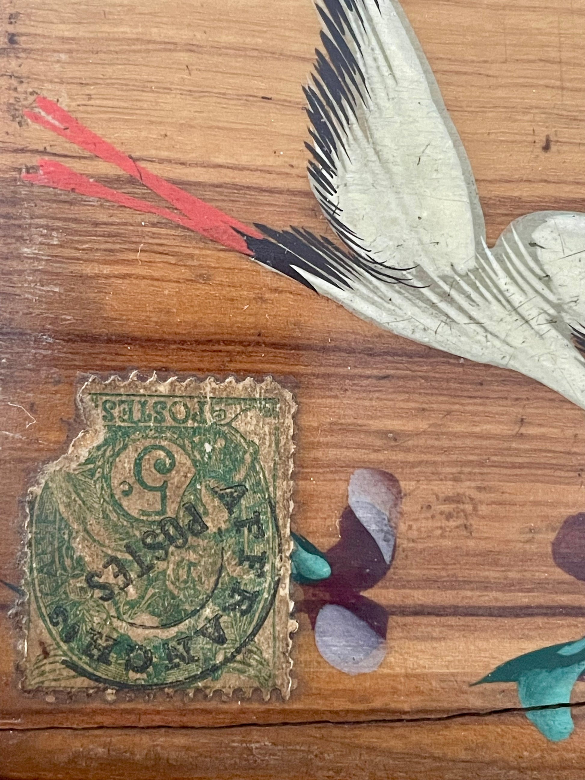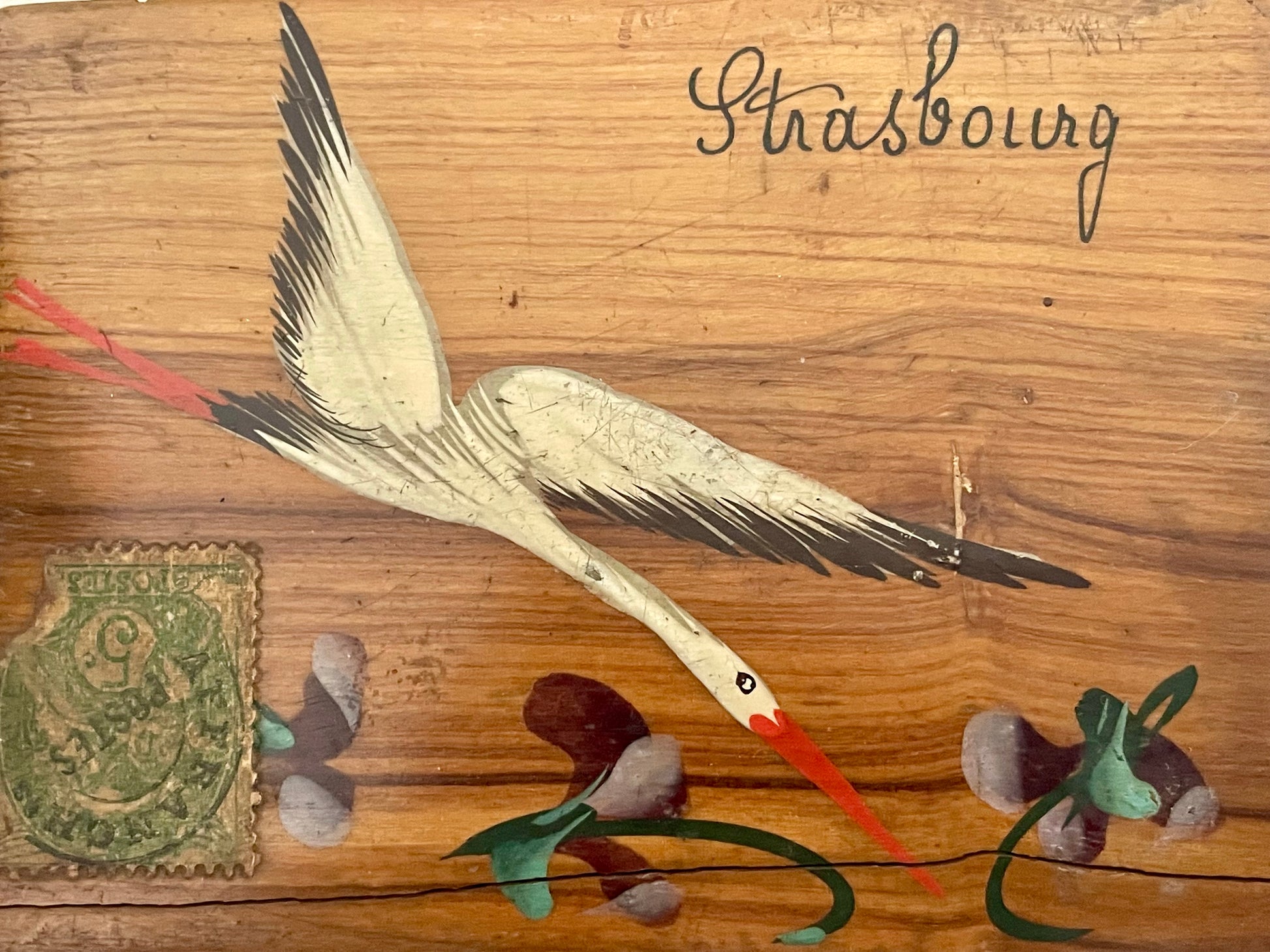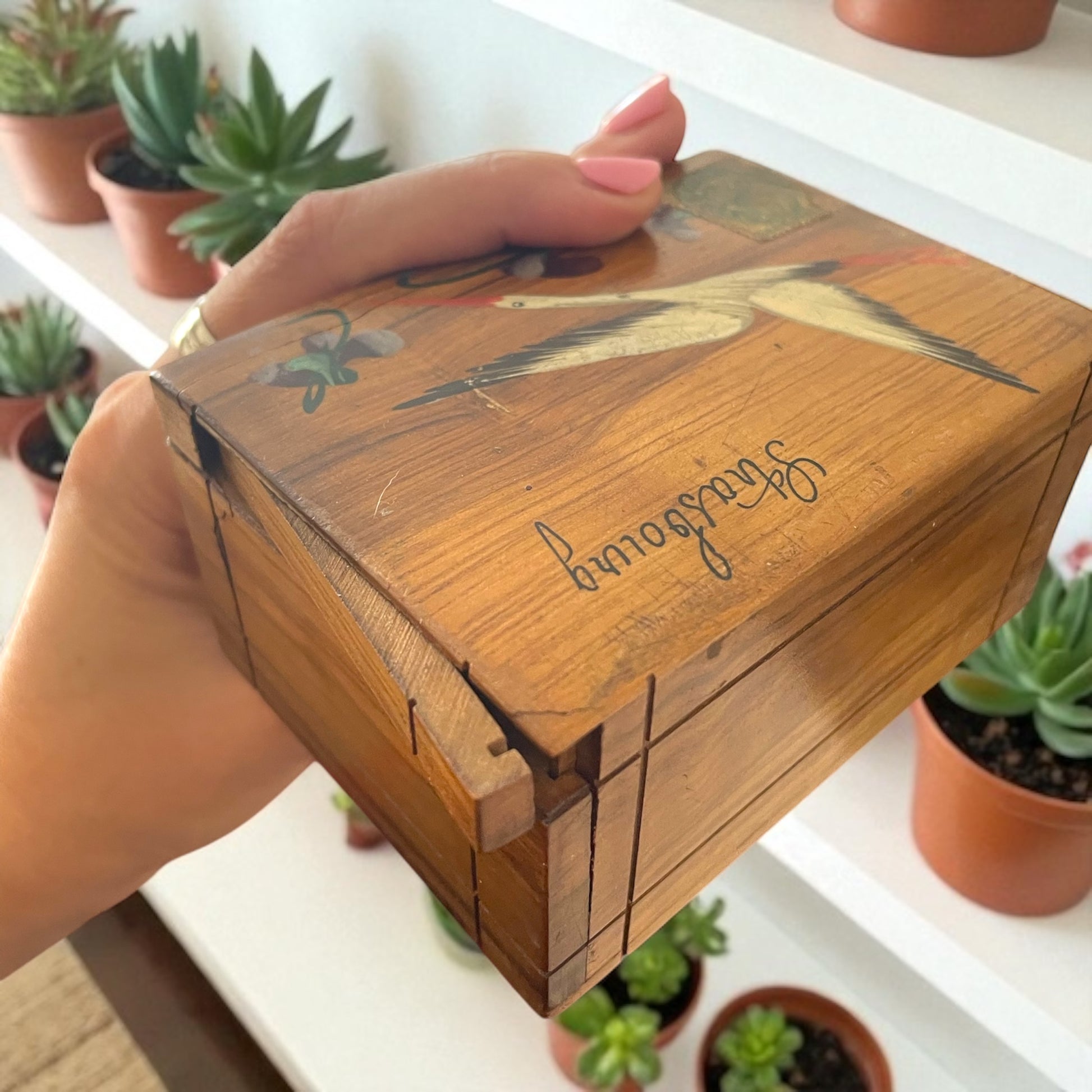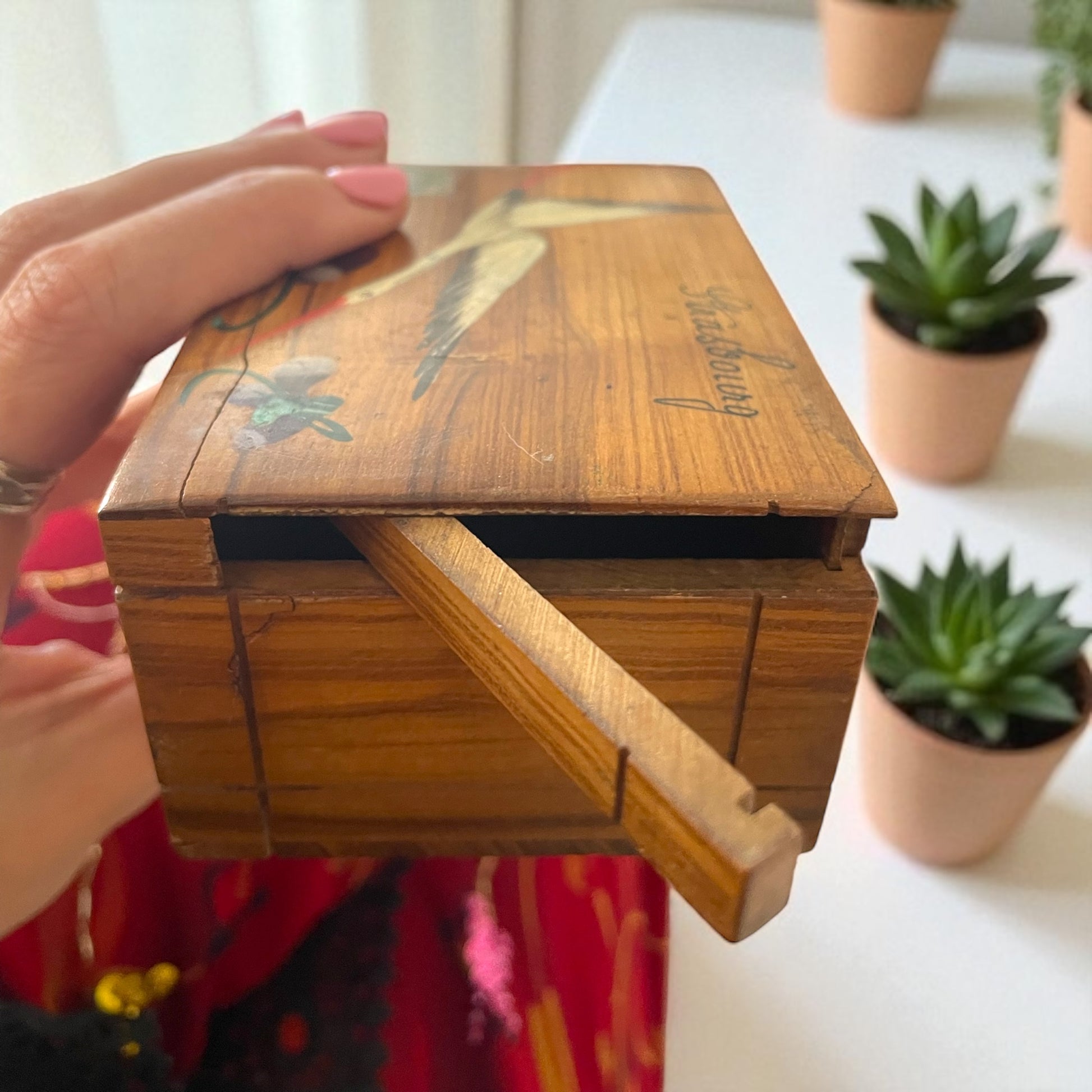 Sembra una semplice scatola di legno, ma appena la tieni tra le mani, senti che qualcosa non torna. Nessun coperchio da sollevare, nessuna serratura a vista. Solo piccole linee e incastri invisibili che raccontano un enigma. Ed è lì che comincia il gioco: un sistema segreto di apertura, pensato per proteggere le preziose monete che vi venivano inserite… e che oggi può aprire un passaggio verso il passato. Questa scatola arriva da Strasburgo, terra di confine e di storie. Decorata a mano con una cicogna in volo e un francobollo originale, è un oggetto che porta con sé il respiro di un tempo che amava la meraviglia delle piccole cose. Perfetta da regalare o da tenere come scrigno per ciò che ha valore solo per te.