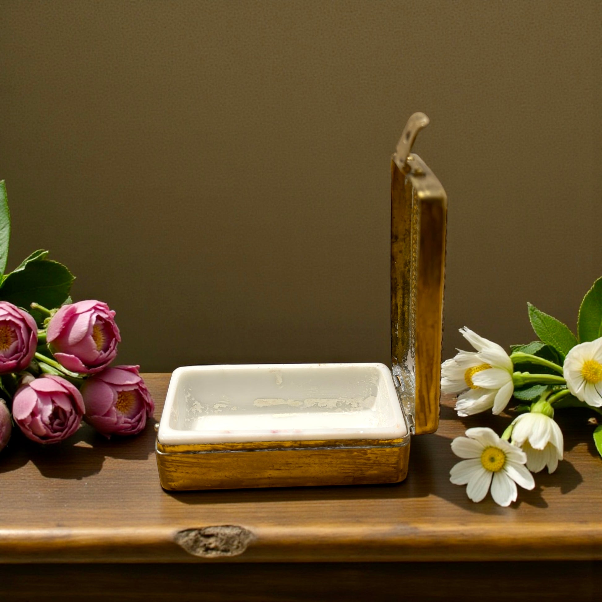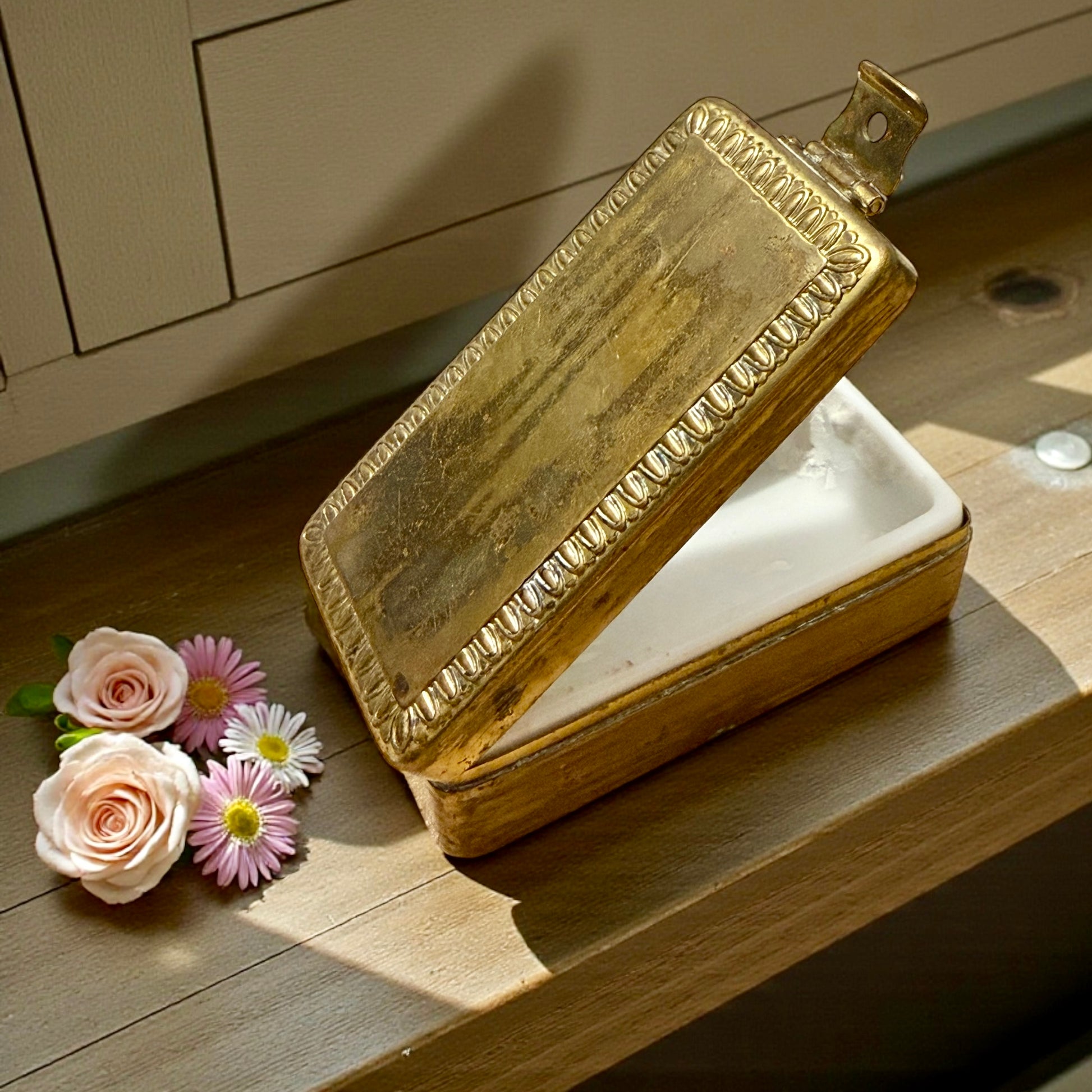 Scatola da barba primo ‘900, ottone e vaschetta in ceramica per crema da rasatura