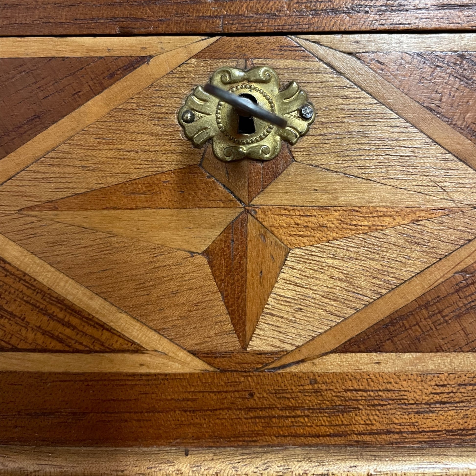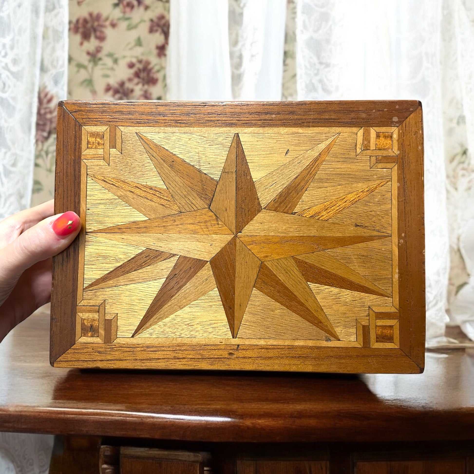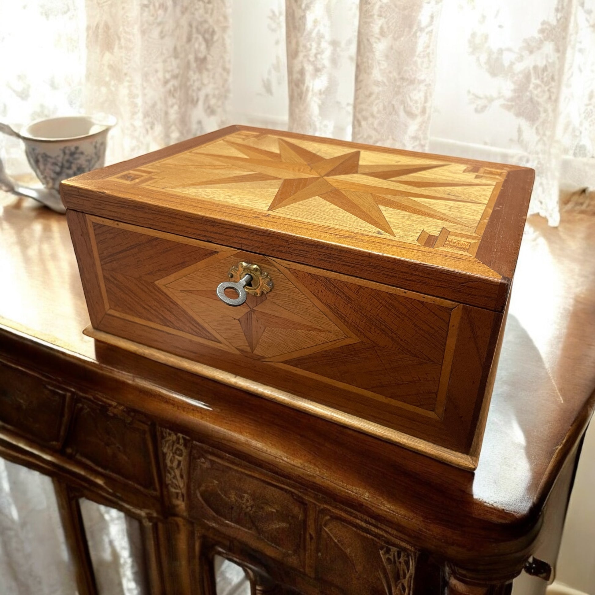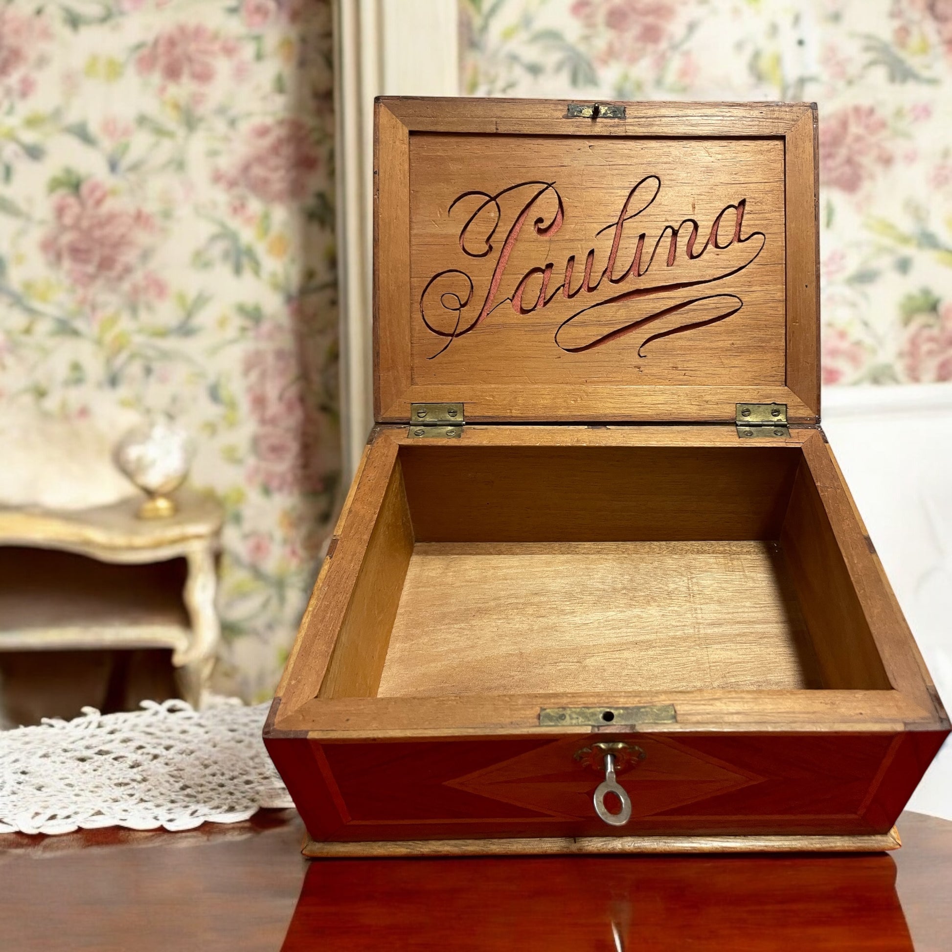 Paulina era nata nel 1879, figlia di una famiglia benestante che possedeva una merceria. Cresciuta tra tessuti pregiati, fili di seta e bottoni di madreperla, aveva sviluppato un gusto raffinato e una spiccata sensibilità. Era una ragazza riservata, ma con un animo profondo, incline a confidare i suoi pensieri più intimi solo alla carta. Questa scatola le fu donata da suo zio materno, un abile ebanista, nel giorno del suo ventesimo compleanno. Lo zio, che le voleva molto bene, aveva intarsiato con pazienza la stella sul coperchio, simbolo di orientamento e protezione. All’interno, aveva inciso il suo nome in una grafia elegante e morbida. Paulina custodiva nella scatola un carteggio segreto: lettere d’amore che si scambiava con Franz, fitte di parole appassionate, racconti di sogni comuni e progetti di fuga. Vi erano persino piccole poesie che Franz le scriveva nei momenti di malinconia. Ma quando Franz dovette partire per il servizio militare, Paulina si ritrovò sola e i genitori decisero di spedirla per qualche tempo presso una zia, lontano dalla città. Al suo ritorno, scoprì che Franz non era più tornato: si diceva che fosse morto durante un’epidemia in una caserma di confine. Paulina conservò quelle lettere come fossero reliquie. Non volle mai rileggerle, ma non ebbe nemmeno il coraggio di distruggerle. La scatola rimase con lei per tutta la vita. Alla sua morte furono i nipoti a trovarla. In ottimo stato, con serratura e chiave (funzionante). Dimensioni: 22 x 17 altezza cm 10.
