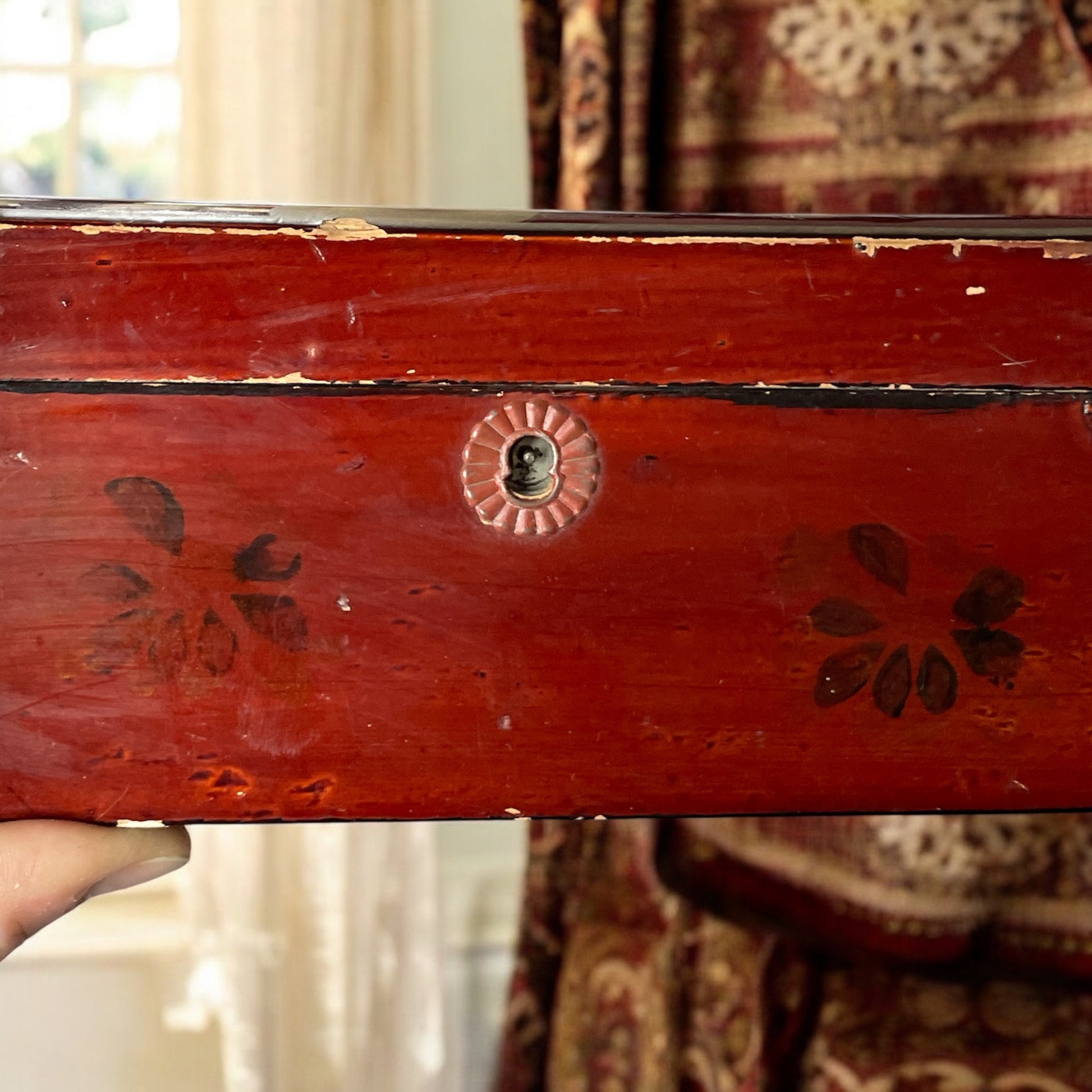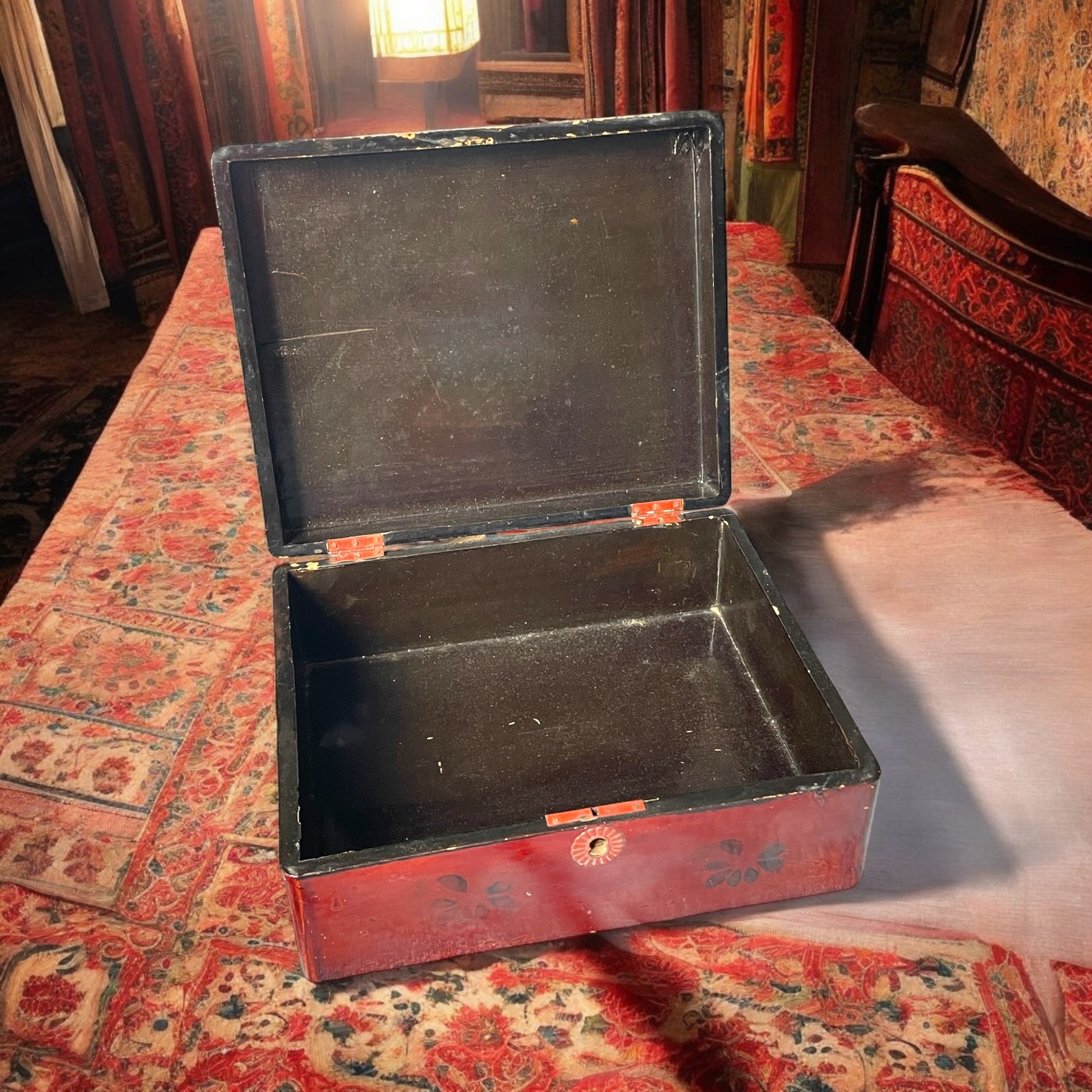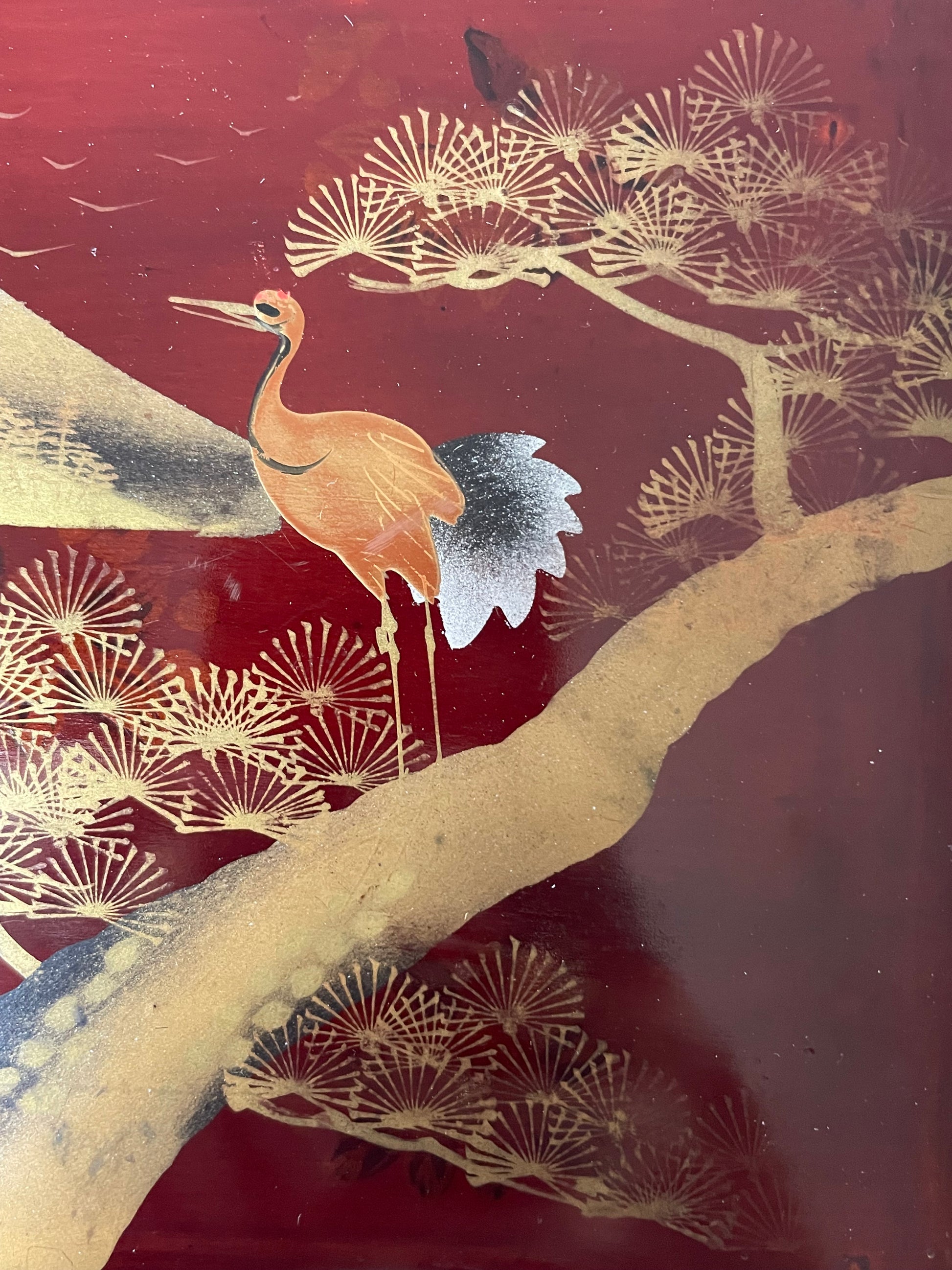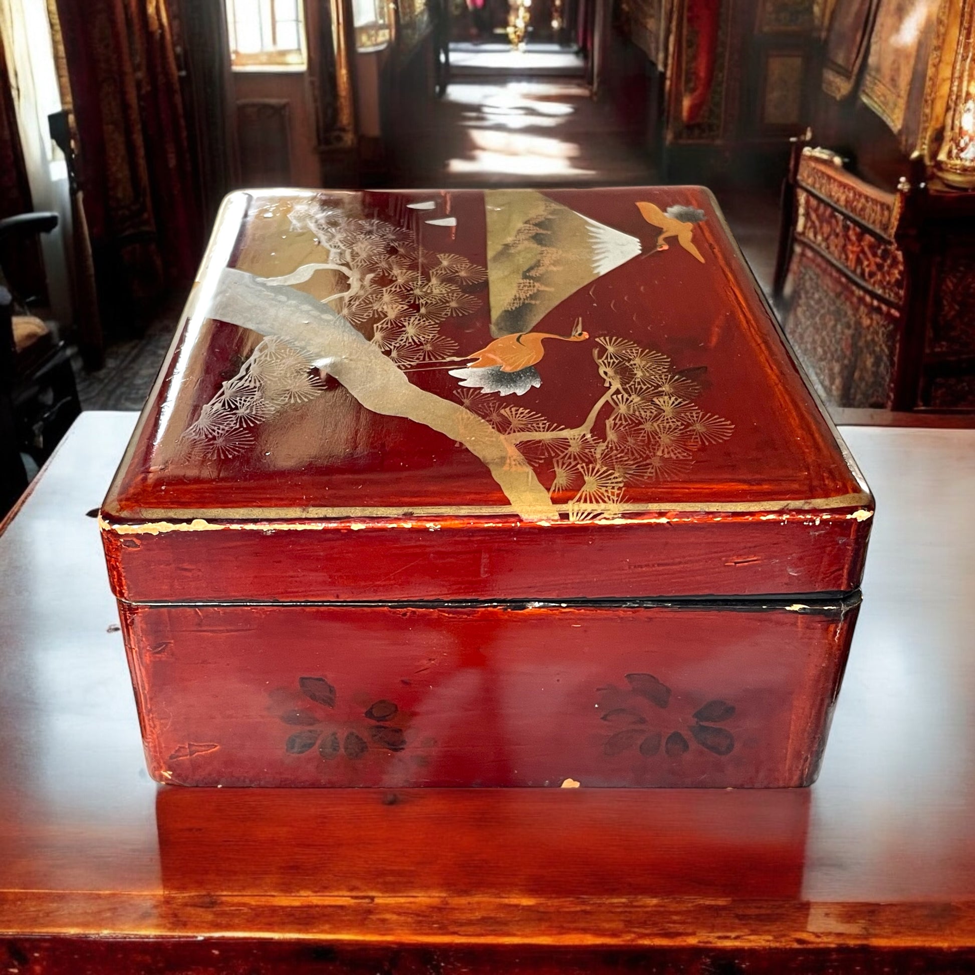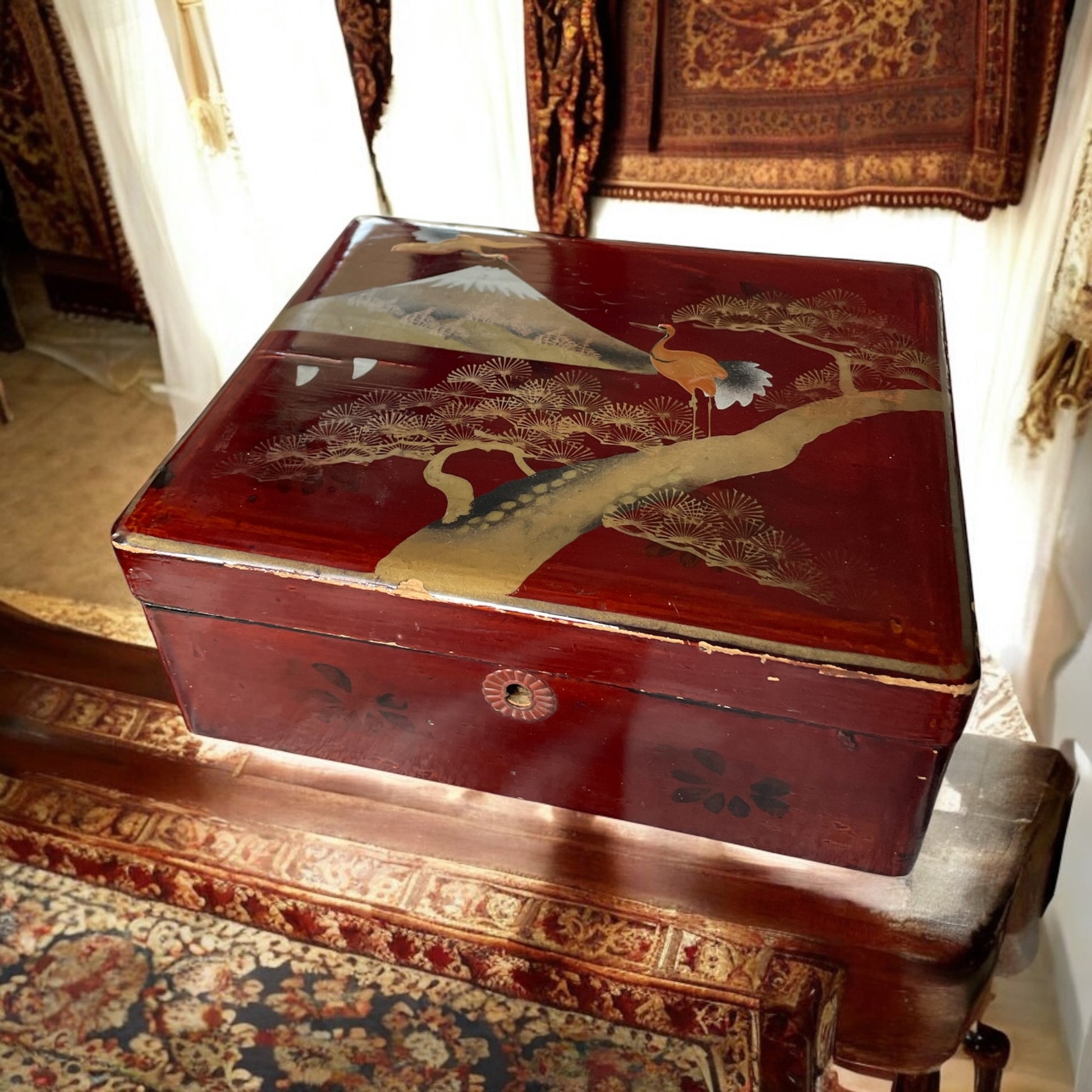 Sul coperchio di questa raffinata scatola laccata si dispiega una scena dall’eleganza eterea, in cui gli elementi della tradizione iconografica giapponese si intrecciano con l’abilità artistica degli artigiani dell’epoca Meiji. La superficie laccata in un profondo rosso scuro accoglie il fluire dorato di un paesaggio senza tempo, che trasporta lo sguardo in un Giappone idealizzato e simbolico. Al centro della composizione si erge la sagoma del Monte Fuji, il più iconico tra i simboli giapponesi. La sua vetta innevata si staglia sopra un paesaggio sereno, richiamando il concetto di permanenza e sacralità. Nella visione occidentale dell’epoca Meiji, il monte assume un carattere ancora più esotico, evocando un Oriente distante e affascinante, trasfigurato dall’immaginario romantico europeo. Accanto al Fuji, due gru si muovono nel paesaggio: una si posa su un ramo di pino, l’altra vola con ali leggere. Nel simbolismo giapponese, la gru (tsuru, 鶴) è considerata messaggera di prosperità e longevità. La delicatezza del suo profilo, con il capo coronato di rosso e la coda sfumata d’argento, esprime un senso di equilibrio e raffinatezza, tratti distintivi delle composizioni laccate destinate all’esportazione. A sorreggere la gru posata è un pino giapponese (matsu, 松), i cui rami si dispiegano in un intricato gioco di linee dorate. Il pino è un altro simbolo fortemente radicato nella cultura nipponica: la sua resistenza alle intemperie e la sua longevità lo rendono un emblema di forza, costanza e immortalità. La presenza di un’etichetta con la dicitura “Paris”, ormai quasi illeggibile, suggerisce che questa scatola fosse destinata al mercato europeo, probabilmente importata da una delle numerose gallerie parigine specializzate in art japonais. Nel tardo XIX secolo, con l’affermarsi del Japonisme, la passione per l’arte e l’estetica giapponese conquistò l’Europa, in particolare la Francia. Questa scatola è un esempio perfetto dell’incontro tra l’Oriente e l’Occidente: oggetto d’arte e di cultura, porta con sé un frammento di quell’epoca in cui il Giappone, pur aprendosi al mondo, riusciva a preservare la sua essenza nella bellezza senza tempo delle sue creazioni. Segni del tempo, serratura senza chiave. Le dimensioni: 22 x 16 cm.