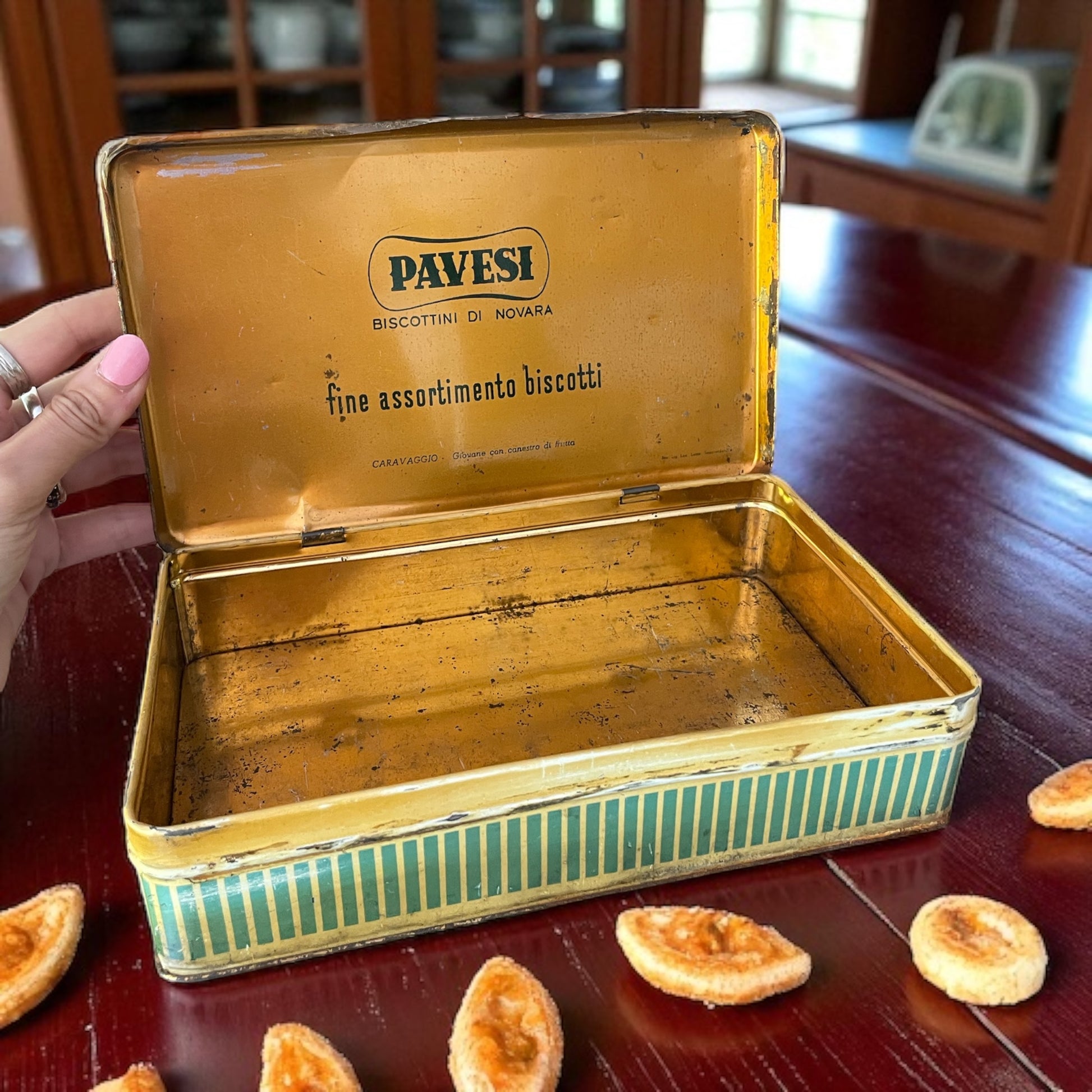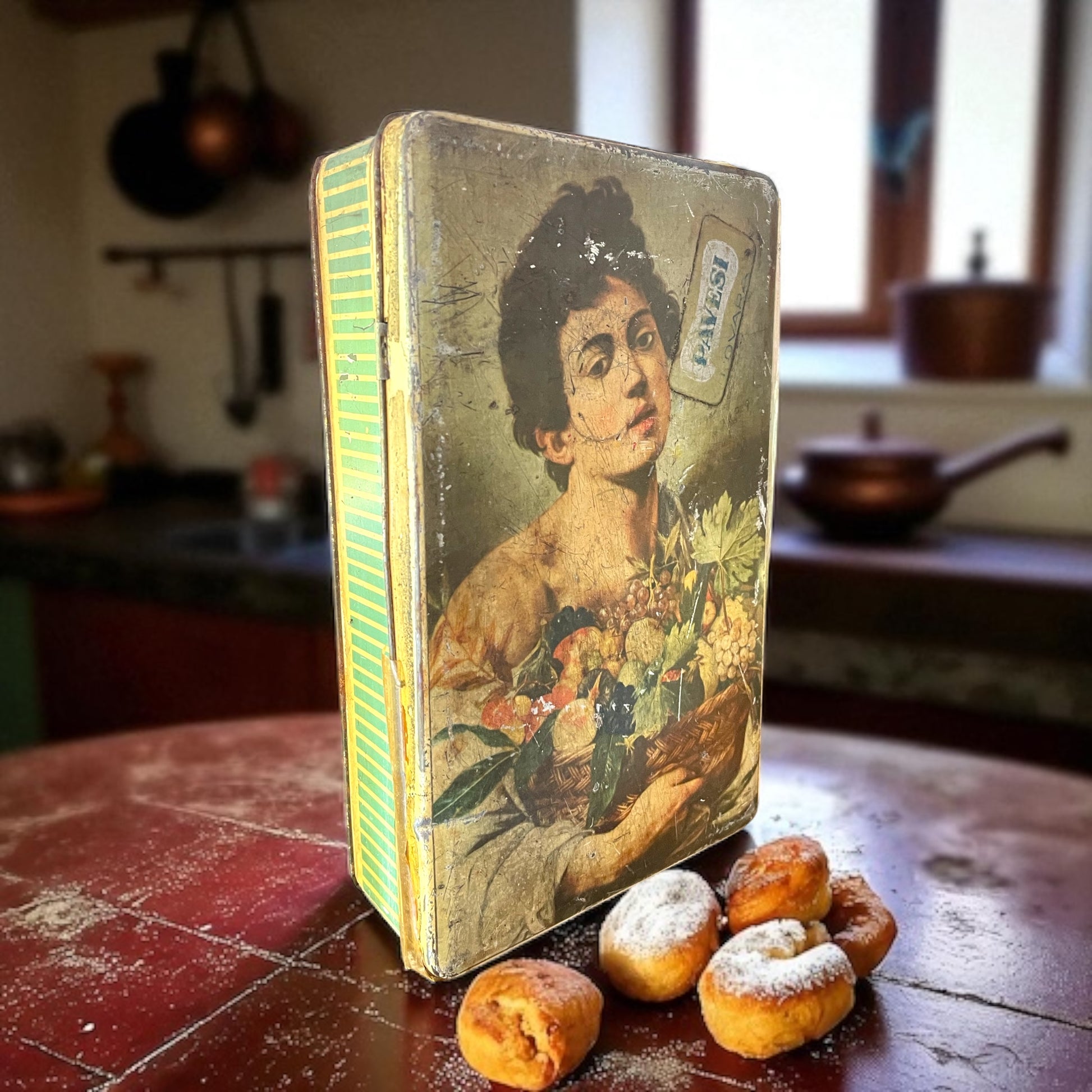 C’erano una volta cucine con il profumo di burro nell’aria e biscotti disposti su un vassoio buono solo per le occasioni speciali. Sopra il tavolo rosso, un po’ scrostato dal tempo, lei si faceva notare: una scatola di latta illustrata, vissuta ma ancora fiera, con lo sguardo intenso del ragazzo di Caravaggio che sembrava vegliare sui dolci della domenica. Questa latta Pavesi – fine assortimento biscotti, ispirata al “Fanciullo con canestro di frutta” di Caravaggio, è molto più che un contenitore: è una memoria tangibile degli anni ’30–’40, quando i biscotti erano un regalo e le confezioni erano fatte per durare, per restare nelle case a custodire aghi, bottoni o piccole foto. I graffi sul volto e le ammaccature lungo i bordi non tolgono fascino, ma anzi raccontano il passare degli anni come rughe di una storia vissuta davvero. Una latta che non ha paura di mostrarsi per com’è: imperfetta, resistente, unica. Oggi può tornare a vivere, su una credenza di legno o in una cucina dall’anima retrò, dove ogni dettaglio ha qualcosa da raccontare. Dimensioni: 21,5 x 13 h 5 cm.
