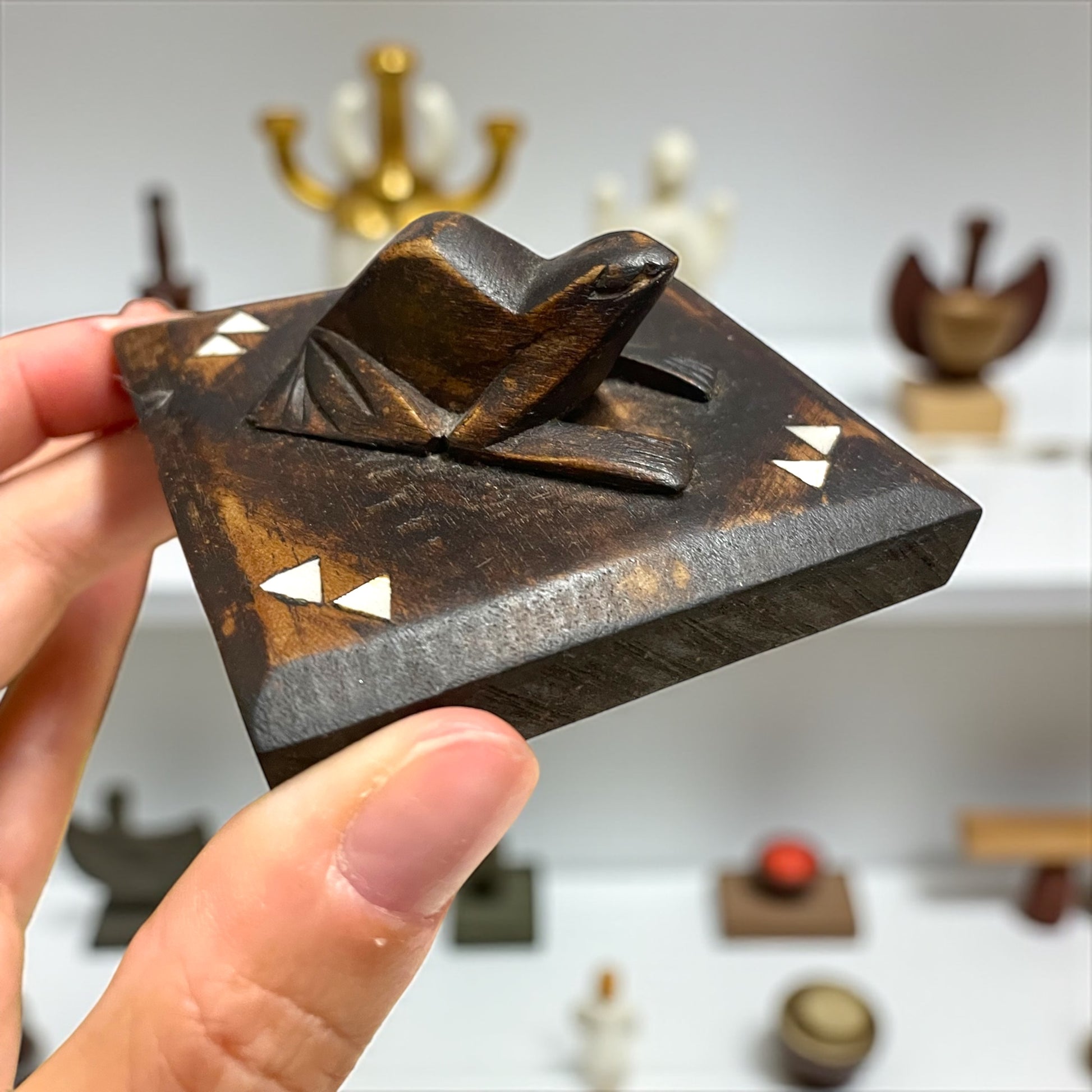 📍 Origine: India. 🕰 Epoca: Seconda metà del XX secolo (ca. 1950–1970). 🪵 Materiale: Legno scurito con intarsi in madreperla naturale. 🐸 Dettagli: Quattro rane scolpite sui coperchi, quattro scomparti interni. 📐 Misure: 19 x 19 altezza 13 cm. 🫖 Uso: Scatola da tè