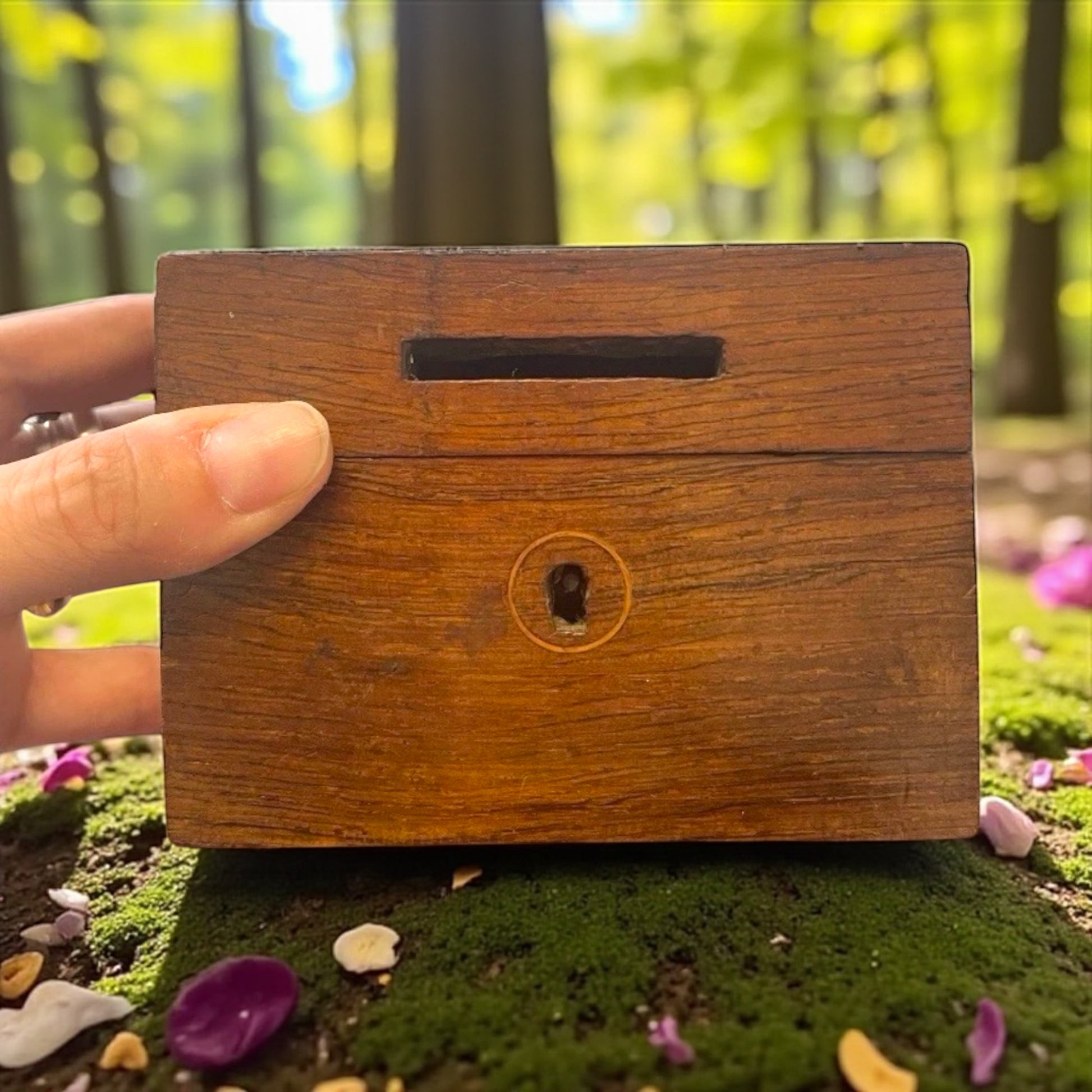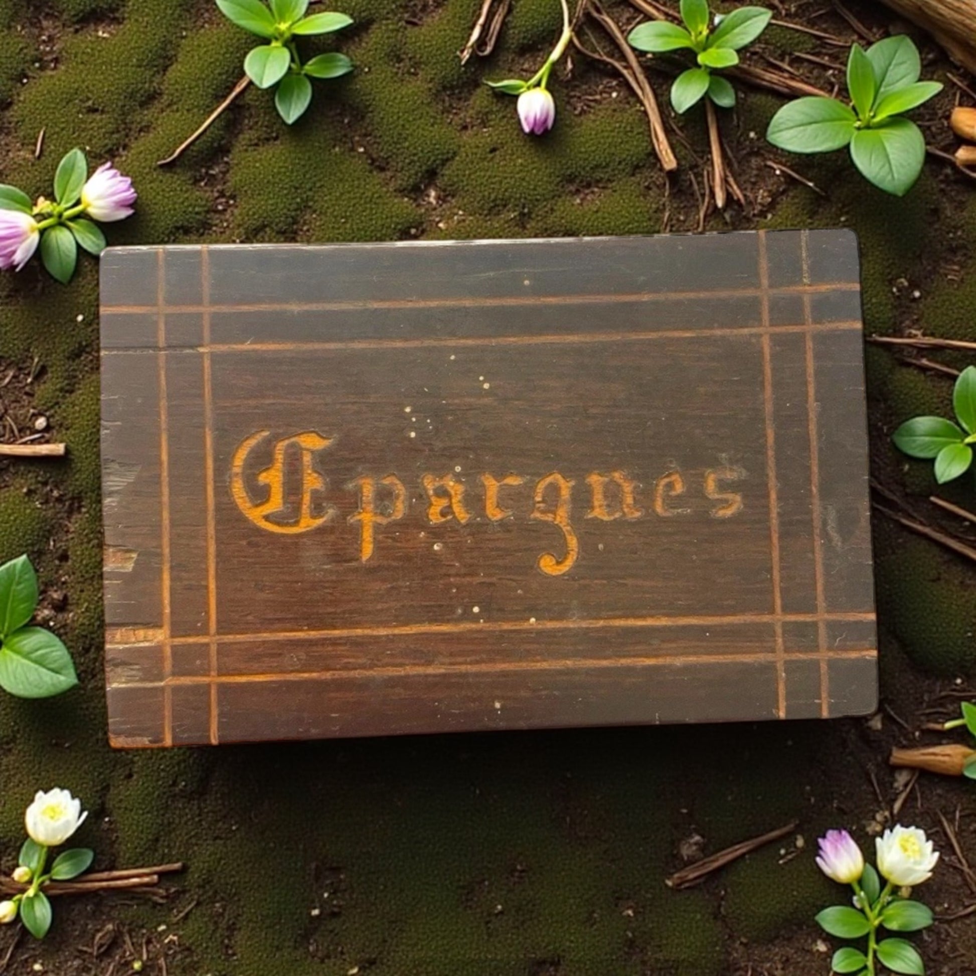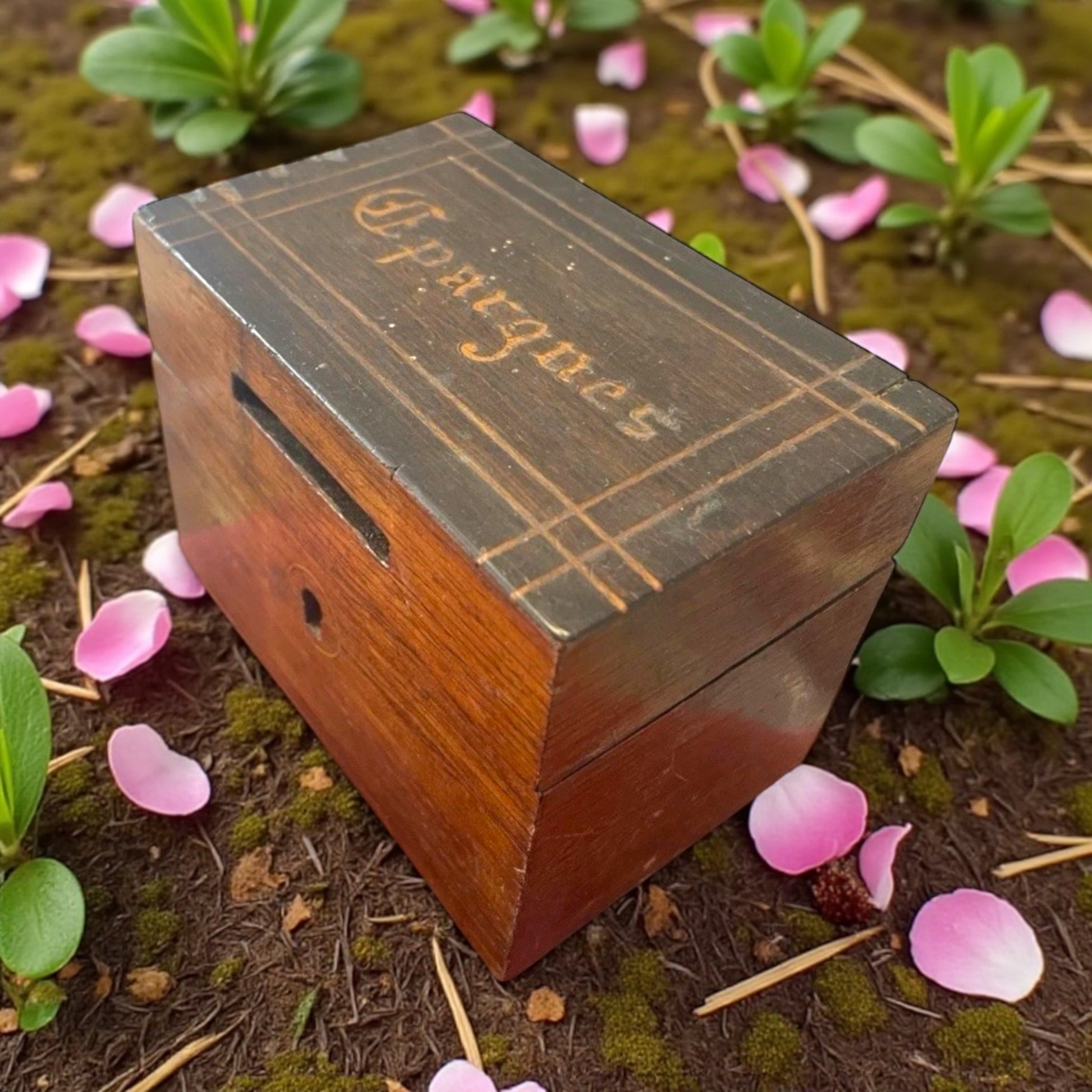 Antica scatola francese da risparmio, fine Ottocento / primissimi Novecento. Legno con scritta “Épargnes” dipinta a mano sul coperchio, fessura per monete sul fronte, interno in carta verde. Manca la chiave.
