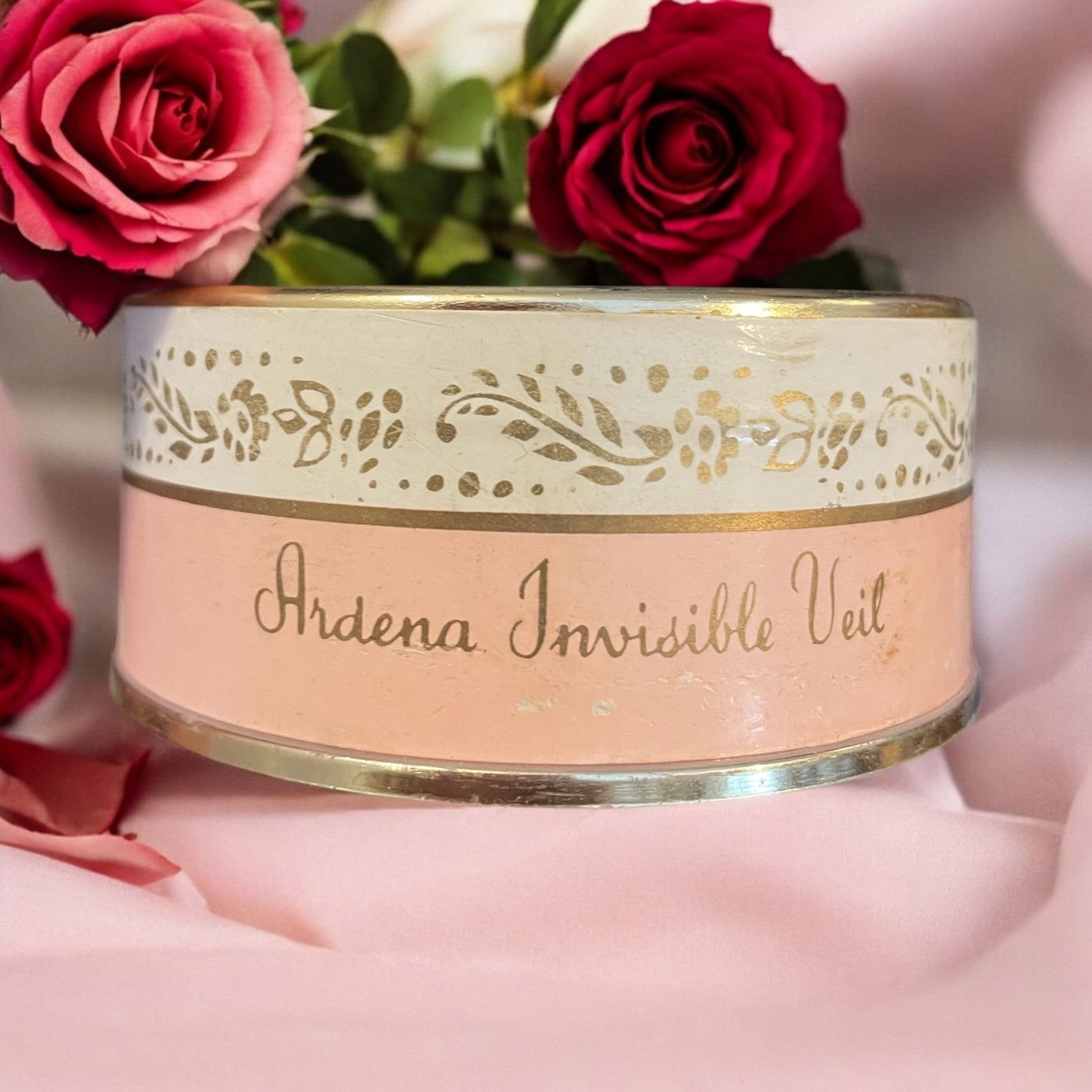 Una sofisticata scatola da cipria vintage firmata Elizabeth Arden, risalente agli anni ’40-’50. La scatola, impreziosita da un delicato bouquet floreale e dettagli dorati, racchiude la promessa di un incarnato perfetto e luminoso. Ardena Invisible Veil era un velo impalpabile di polvere, formulato in Francia con un ‘processo segreto’, per donare alla pelle una radiosità naturale e senza imperfezioni, incarnando il lusso e la femminilità del dopoguerra. La scatola profuma ancora di cipria.