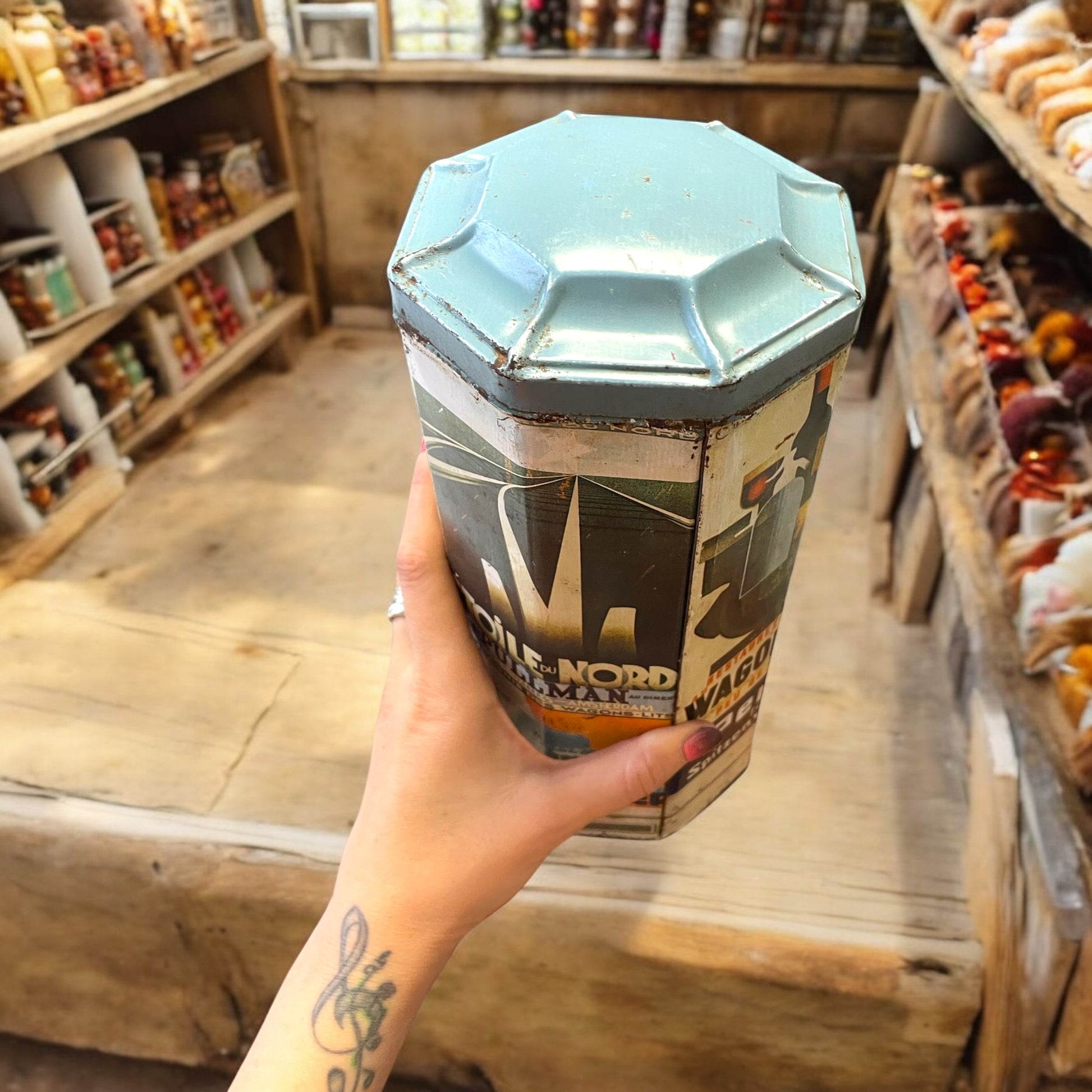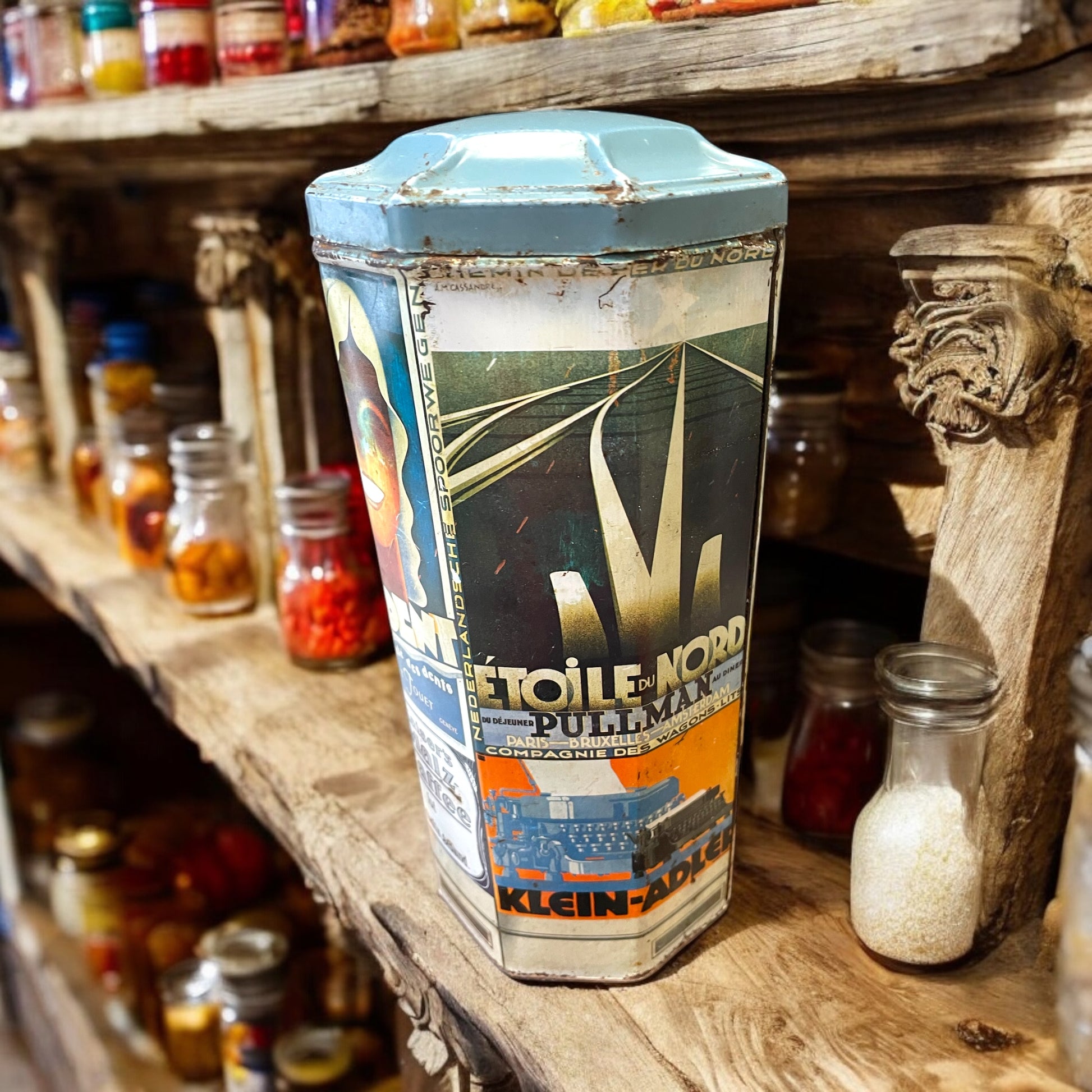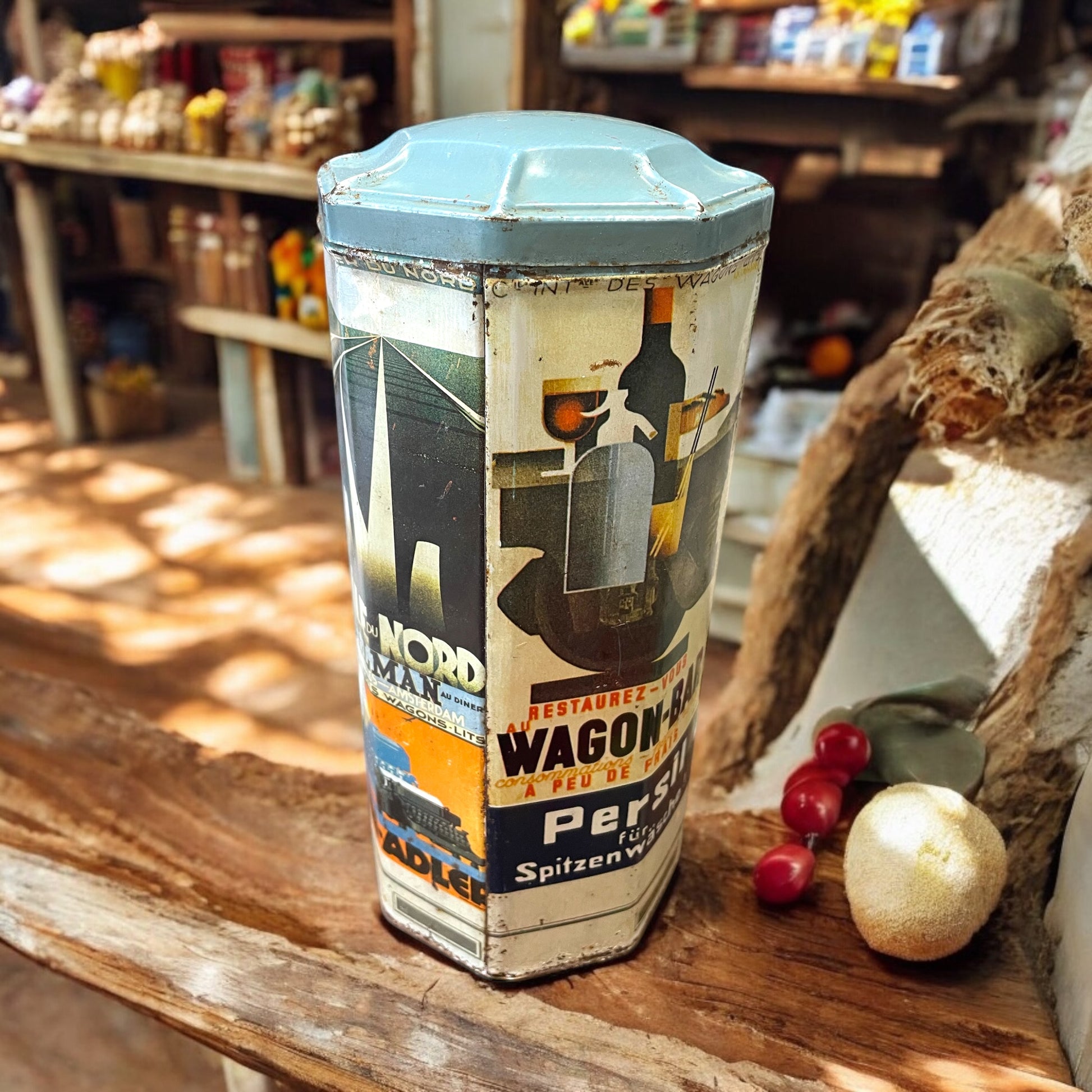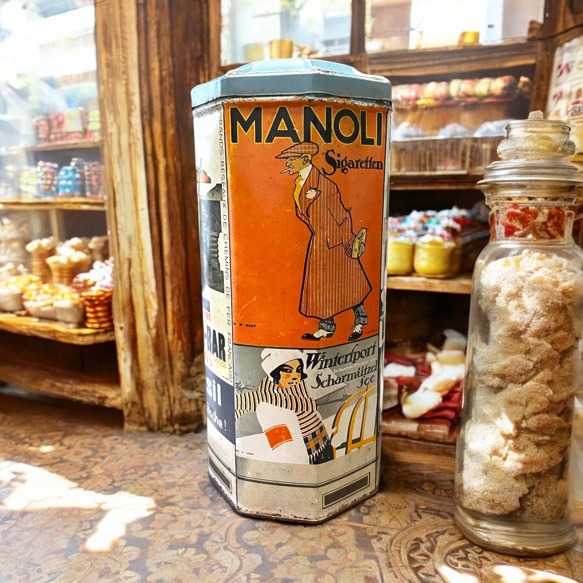 Questa straordinaria scatola di latta ottagonale ci trasporta direttamente nell’atmosfera vivace degli anni ’20 e ‘30, quando il design pubblicitario si intrecciava con l’arte, trasformando gli oggetti quotidiani in piccoli capolavori. La forma ottagonale richiama i chioschi dell’epoca, spesso utilizzati come spazi per l’esposizione di manifesti pubblicitari. Ogni lato della scatola racconta una storia, incorniciata dal fascino inconfondibile dello stile Art Déco e del Plakatstil, che dominavano la comunicazione visiva del tempo: