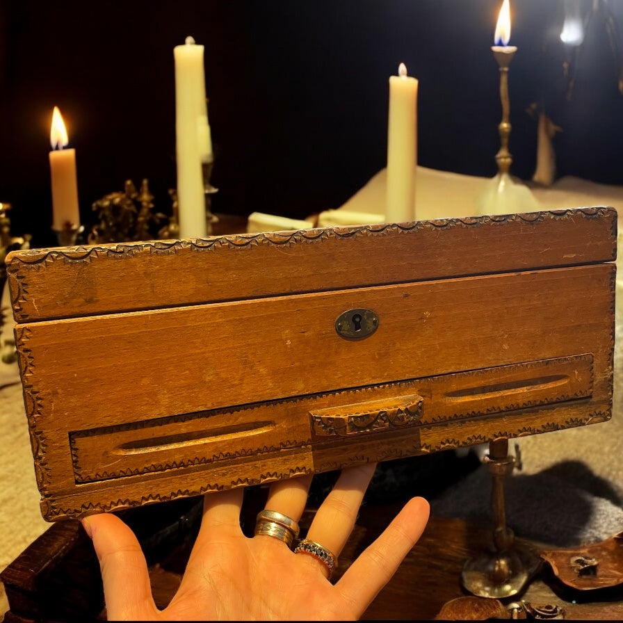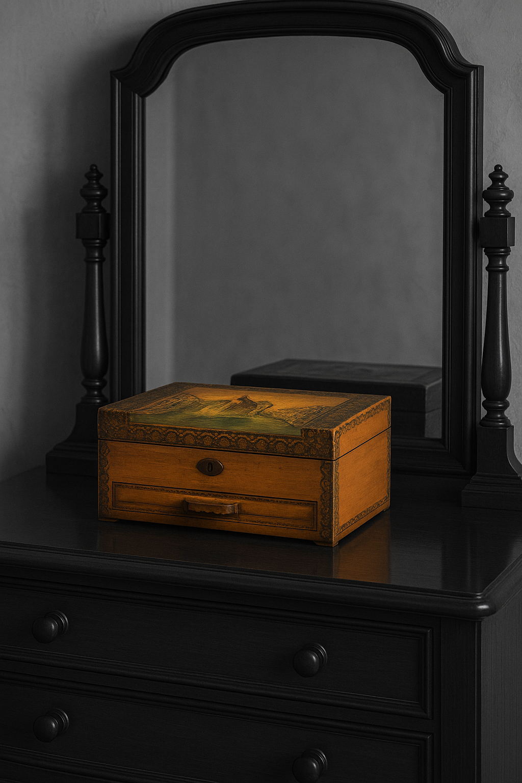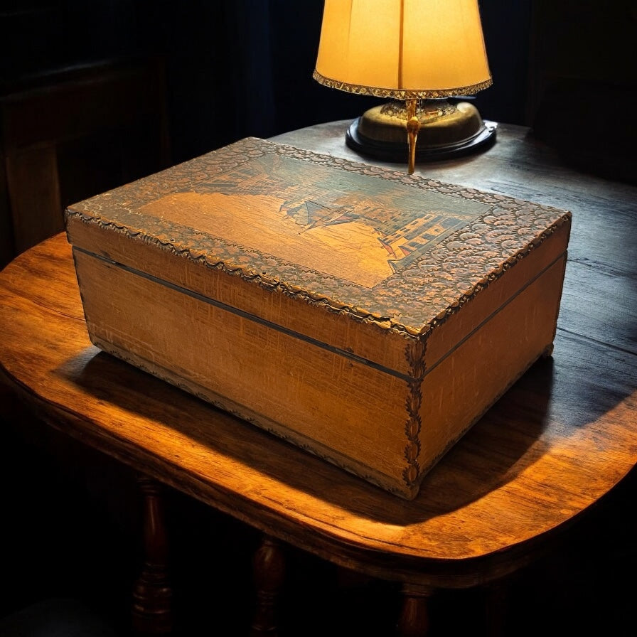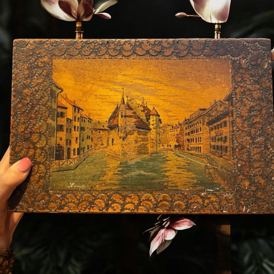 C’è una scatola che non era solo una scatola. Era un rifugio. Un confine sottile tra il mondo esterno e ciò che non doveva essere detto. Sul coperchio, inciso e poi dipinto a mano, il Palais de l’Isle di Annecy galleggia come un’isola incantata tra le acque calme e le case strette l’una all’altra. Lo sguardo oggi si perde nella luce calda del tramonto dipinto, ma chi la possedeva un tempo sapeva bene cosa custodiva. Era l’eco di un incontro proibito, di un amore rimasto a metà tra le strade acciottolate e le stanze in affitto con le imposte chiuse. Annecy, primavera del 1933. Lei aveva indossato un cappello color avorio, lui aveva in tasca un taccuino pieno di versi. Si erano incontrati sotto la pioggia… e poi ogni giorno alla stessa ora. Nessuna promessa, nessun domani. E quando il viaggio finì, restò solo questa scatola. Una serratura senza chiave, un piccolo cassetto con scomparti, perfetti per ordinare ciò che non si poteva dimenticare: una lettera mai inviata, un nastrino di velluto, una ciocca di capelli forse. La scatola è ancora qui. Il tempo l’ha accarezzata con dita leggere, lasciando segni che parlano più delle parole. E chissà, forse, aprendola oggi, si può ancora sentire il battito trattenuto di quell’amore che non poteva esistere, ma che nessuno ha mai avuto il coraggio di cancellare.