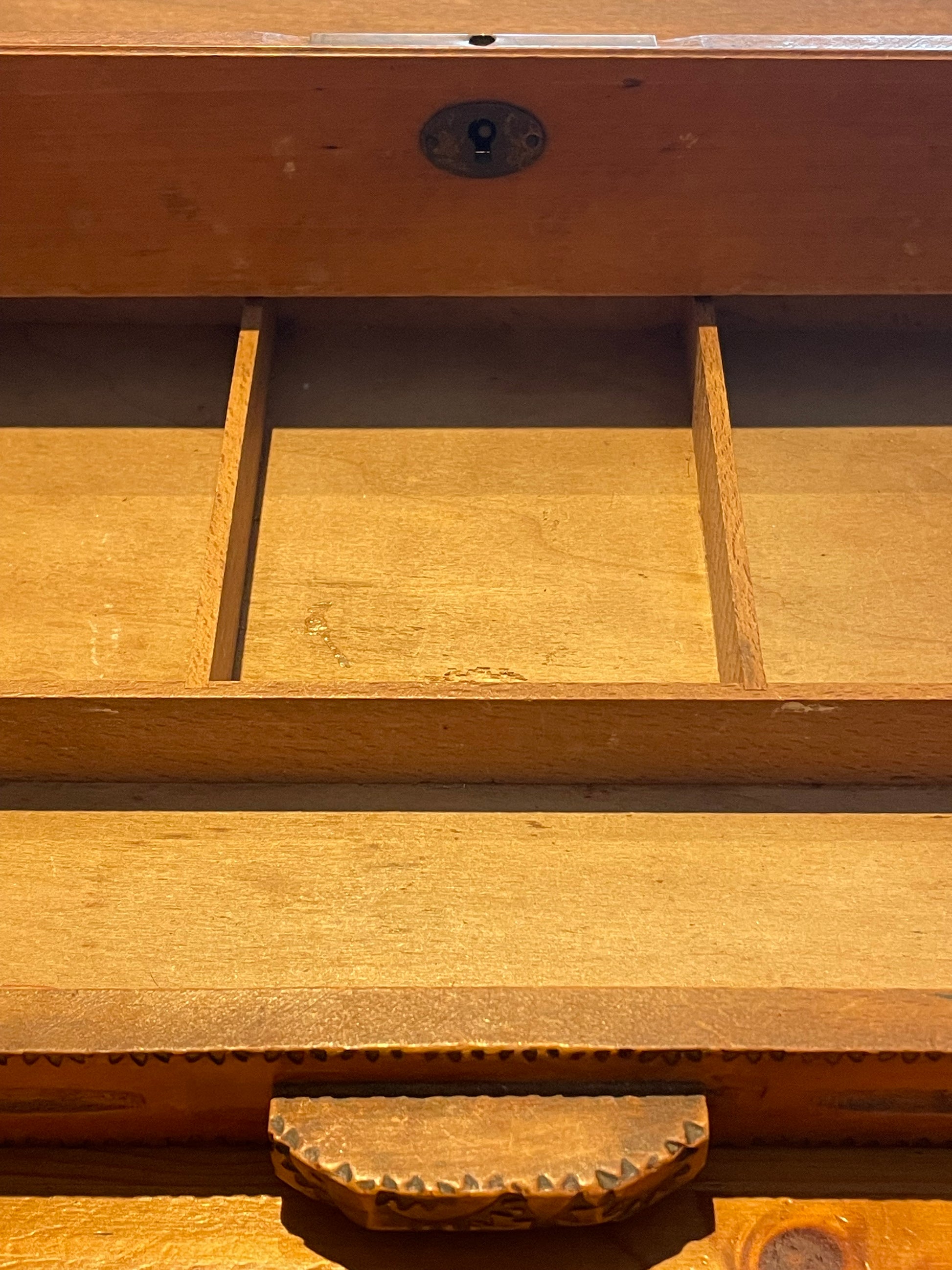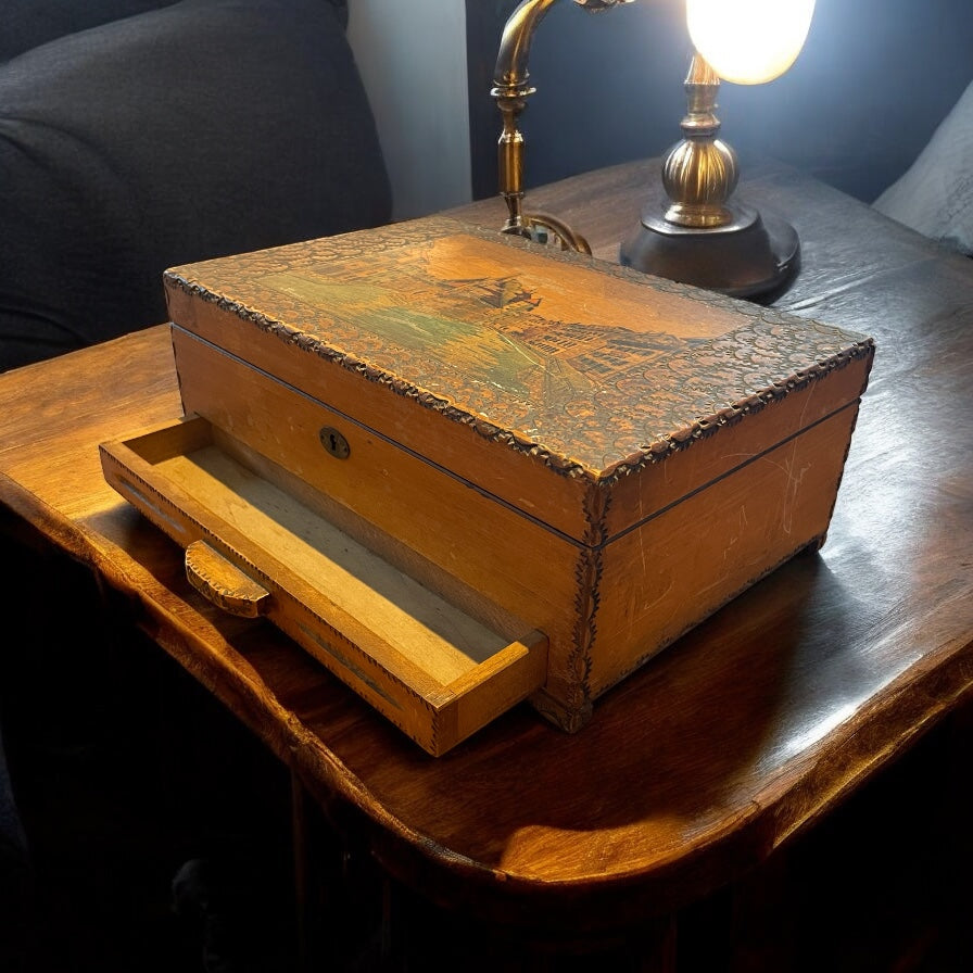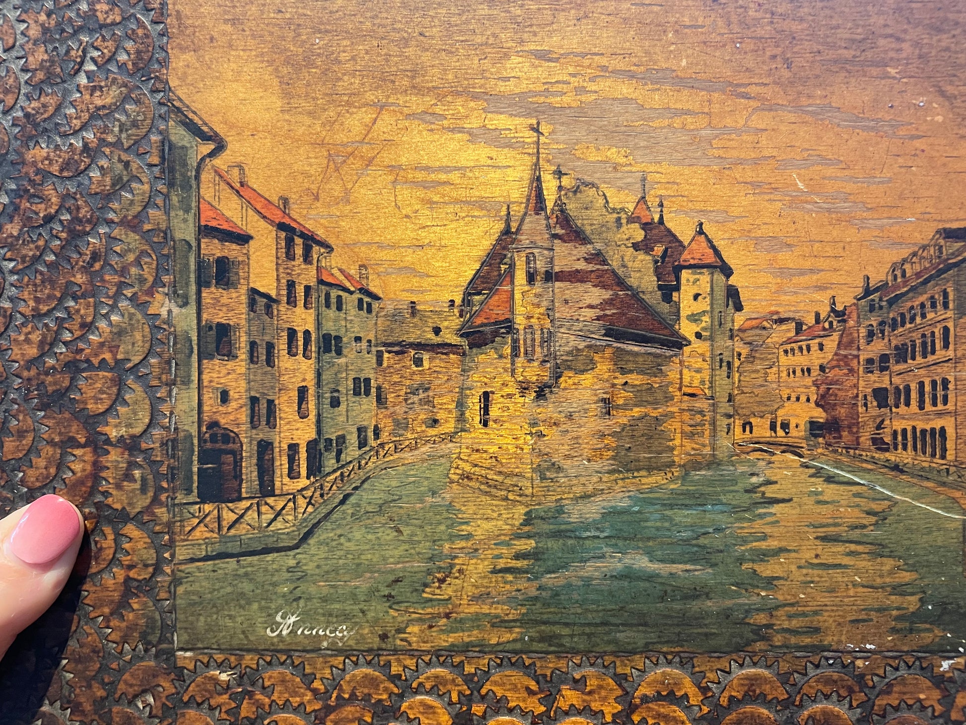 Scatola portaoggetti e gioielli in legno decorato a mano, con contorni incisi e pittura su coperchio raffigurante il Palais de l’Isle ad Annecy. Dotata di serratura (senza chiave) e cassetto frontale a scomparti. Dimensioni: 30,3 x 20,3 cm, altezza 12 cm. Ca anni ‘30.
