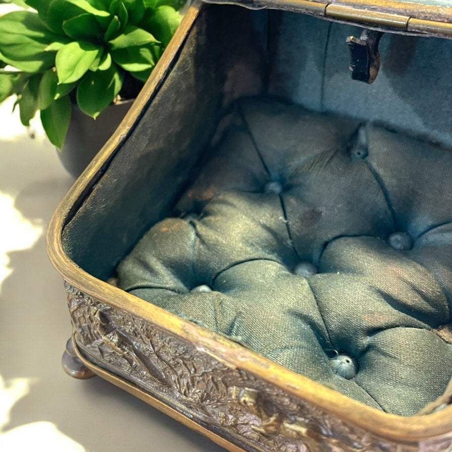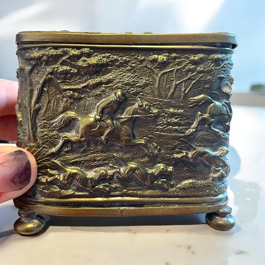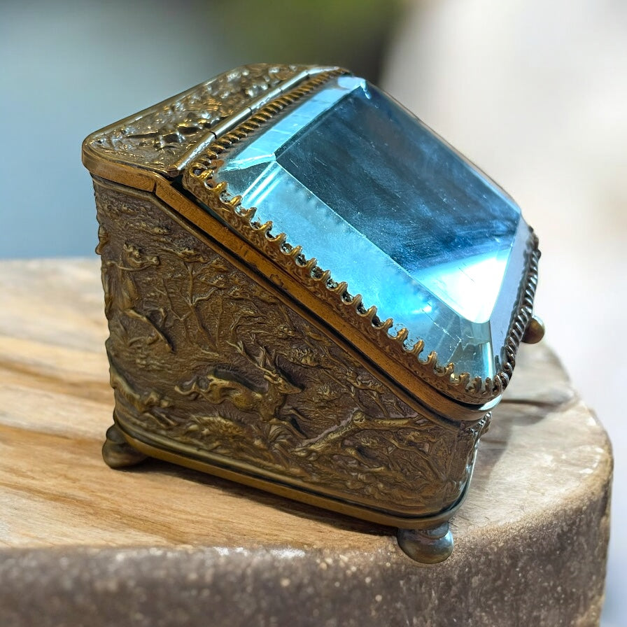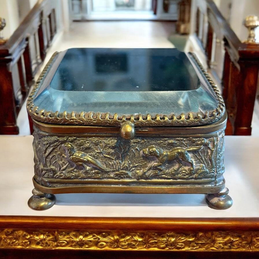 Scrigno porte montre in ottone e vetro molato con scene di caccia, anni ‘10