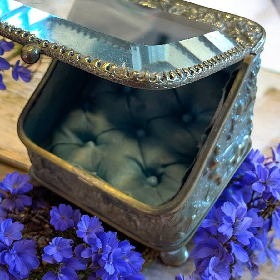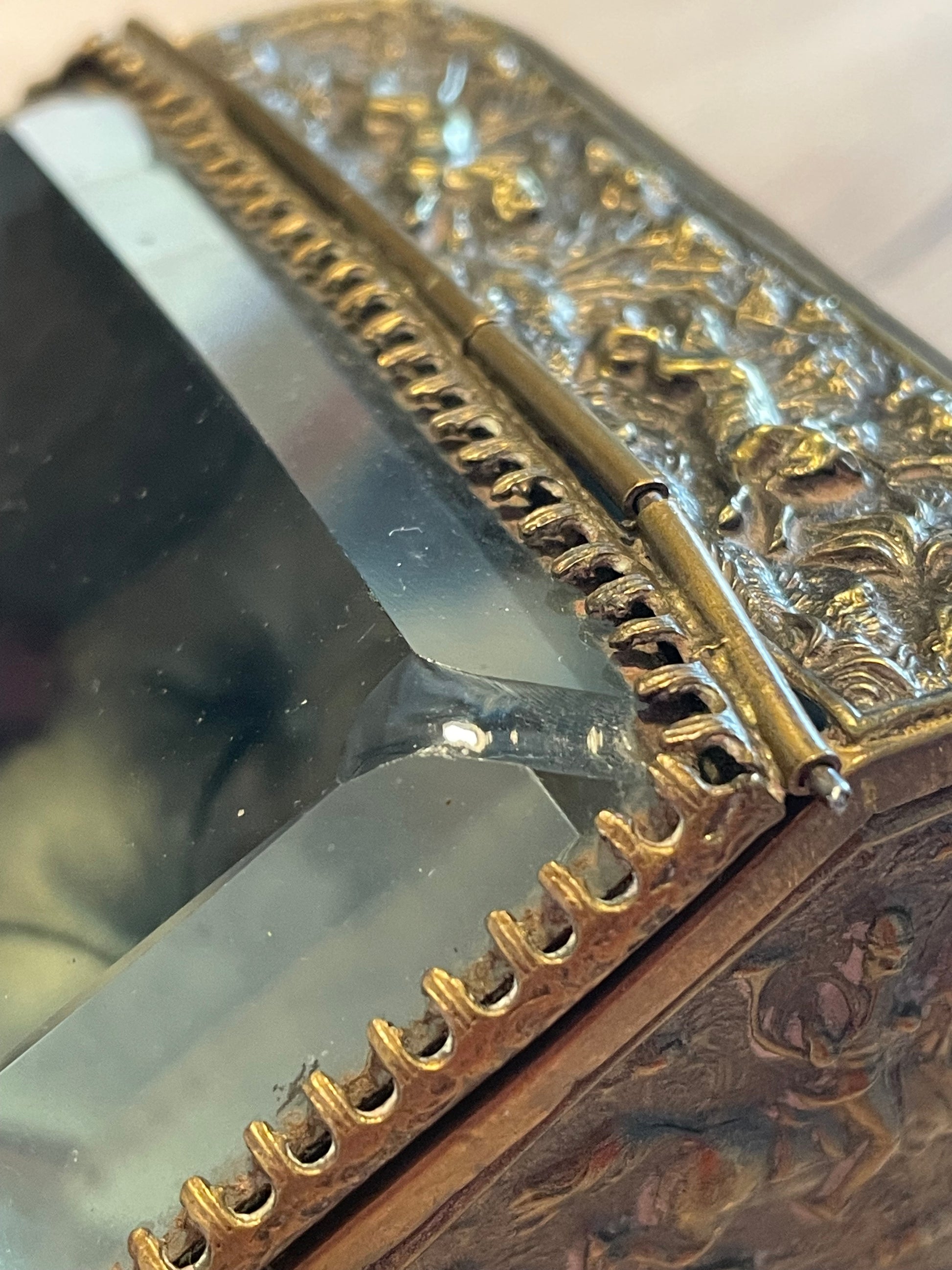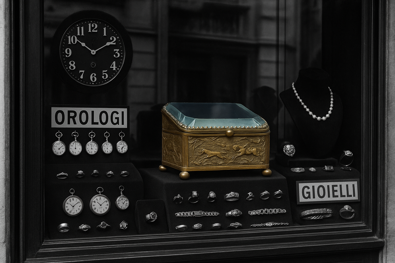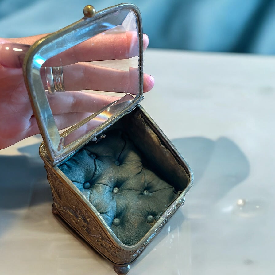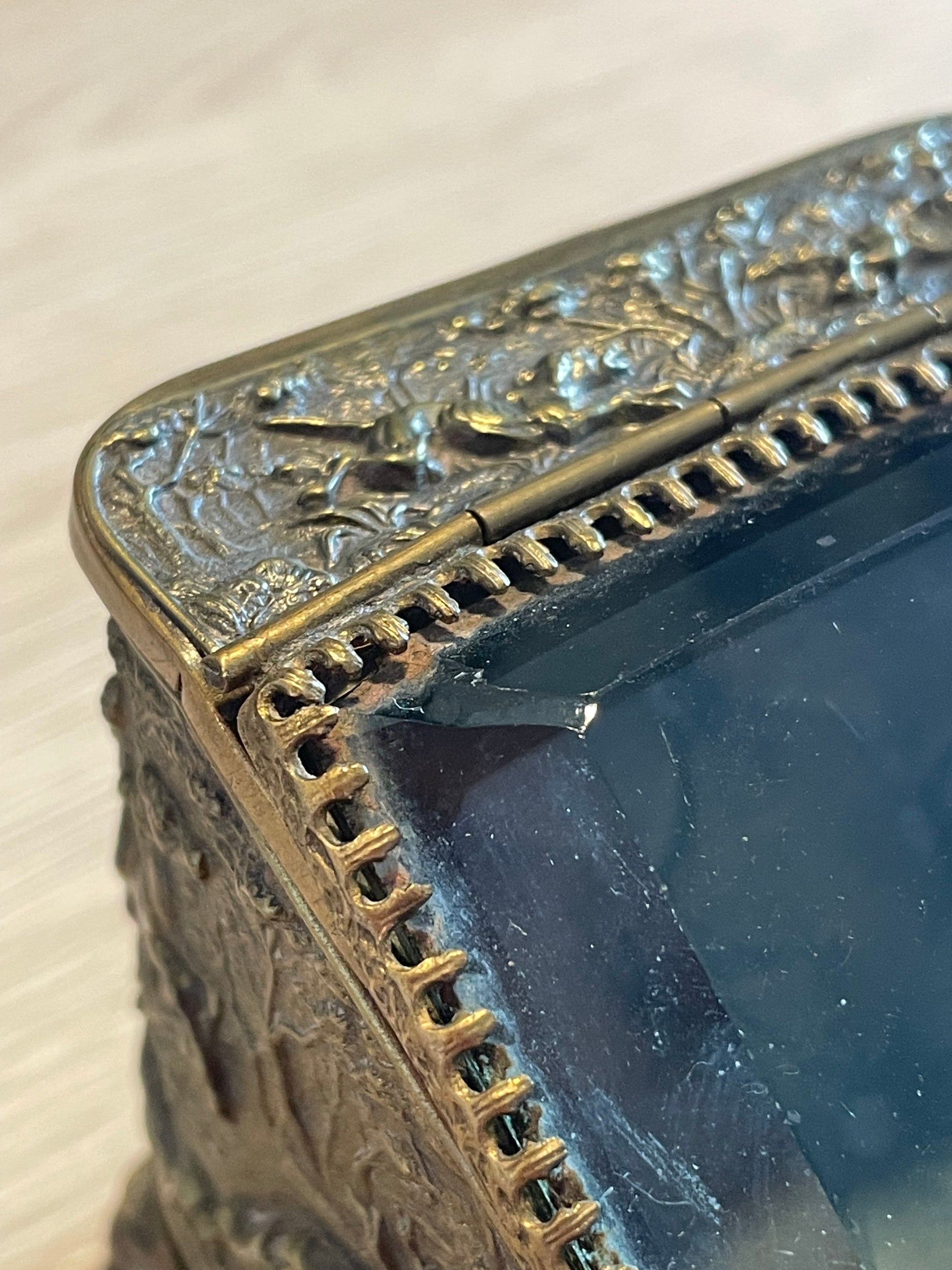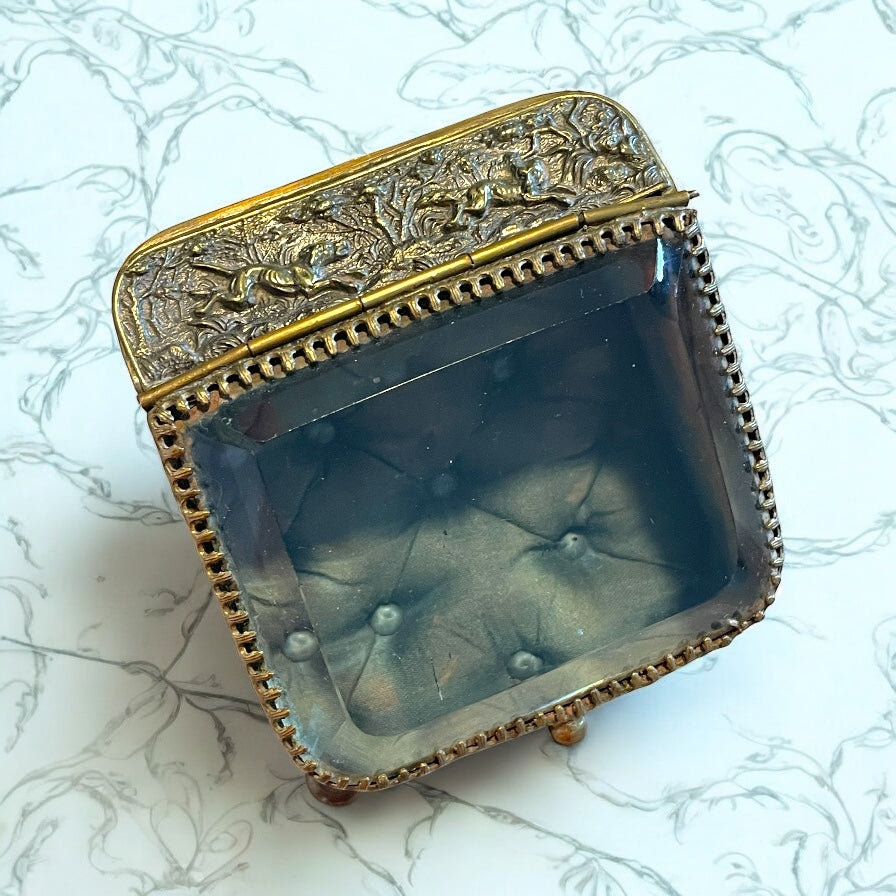 Parigi, inverno del 1912. Dietro la vetrina illuminata della sua gioielleria sulla Rive Droite, monsieur Delacour osservava il lento fluire dei passanti, ognuno un riflesso sfuggente nei cristalli tagliati a mano del suo piccolo scrigno da esposizione. Lo aveva fatto realizzare su misura da un artigiano di Lione: vetro spesso, molato con cura per catturare la luce, montatura in metallo dorato e una scena a rilievo che raccontava, su ogni lato, una caccia nobiliare senza tempo. All’interno, sul fondo imbottito di seta trapuntata color ottanio, poggiava l’orologio più prezioso della sua collezione. Un pezzo da tasca in oro bianco, firmato e numerato, che monsieur Delacour custodiva con molta discrezione. Per lui, non era solo un orologio: era il simbolo dell’eleganza maschile, della puntualità intesa come virtù, e anche del ricordo — perché quel modello era stato indossato da suo padre nel giorno dell’inaugurazione del negozio, anni prima. Il piccolo gancio interno serviva proprio a questo: sospendere l’orologio in verticale, affinché il cliente potesse ammirarlo senza toccarlo, come una reliquia. La luce entrava da sopra, rifrangendosi sul vetro molato, e tutto sembrava sospeso tra tempo e memoria. Oggi questo cofanetto conserva intatto il suo potere scenico. Ci sono due scheggiature dove il vetro è stato tagliato (ultime 2 foto) che a prima vista erano sfuggite persino a me nella complessiva bellezza… raccontano il suo lungo viaggio, ma non ne compromettono l’eleganza. È pronto per accogliere ancora un segreto. Dim. 8x7.5xh7cm.