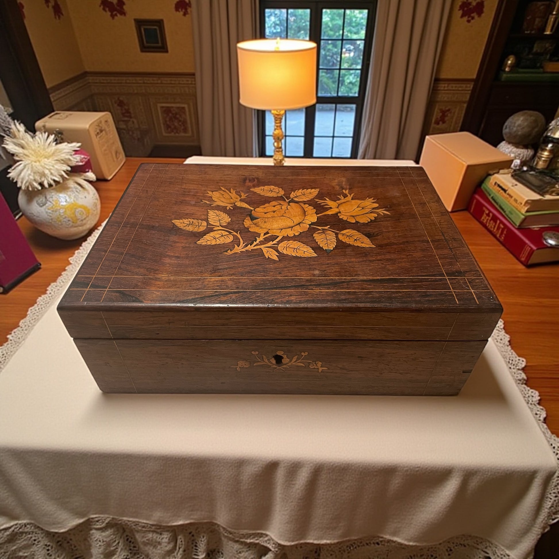 Scrigno scatola vittoriana con tarsia floreale, doppio scomparto e medaglia Giubileo Regina Vittoria