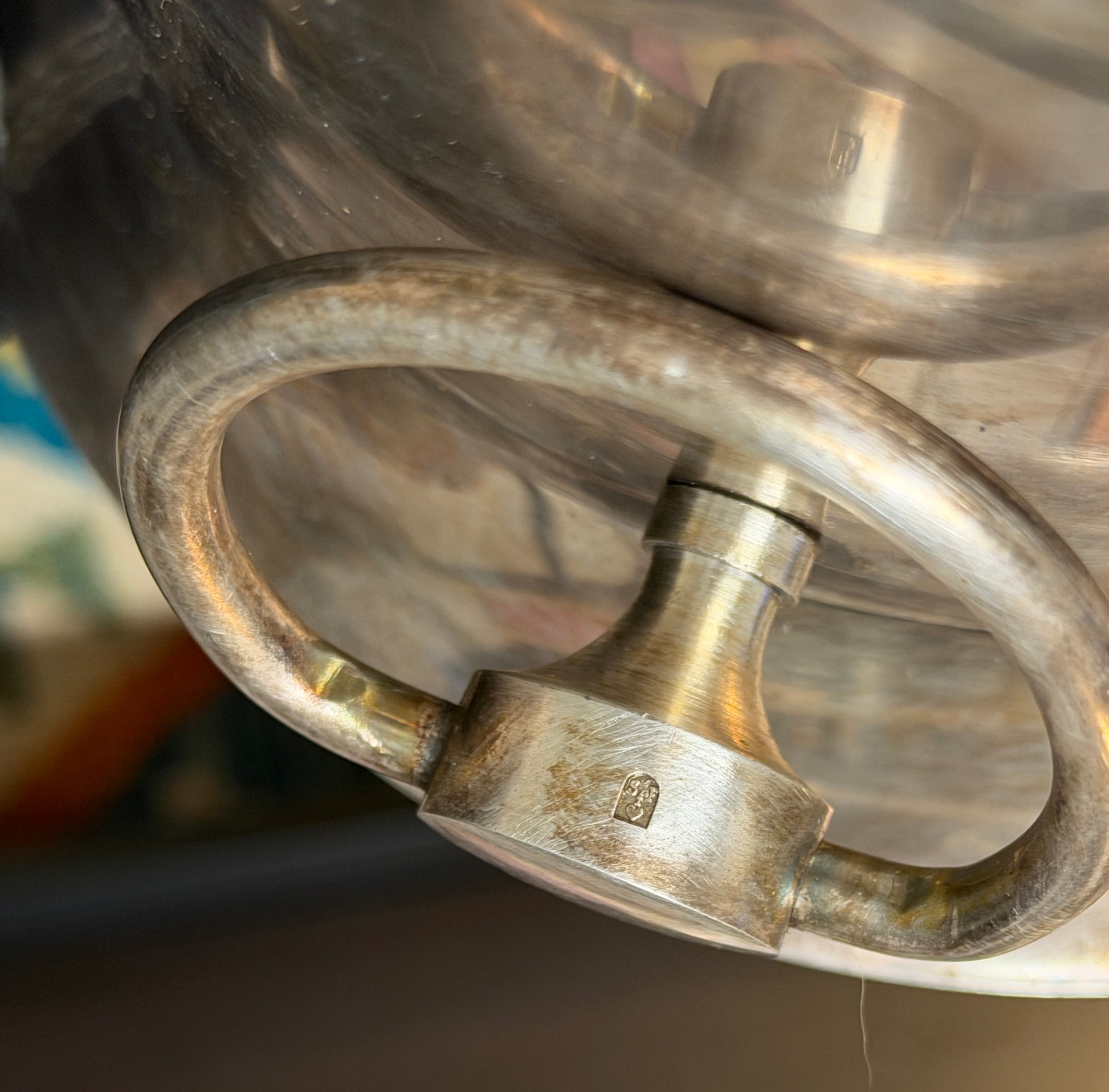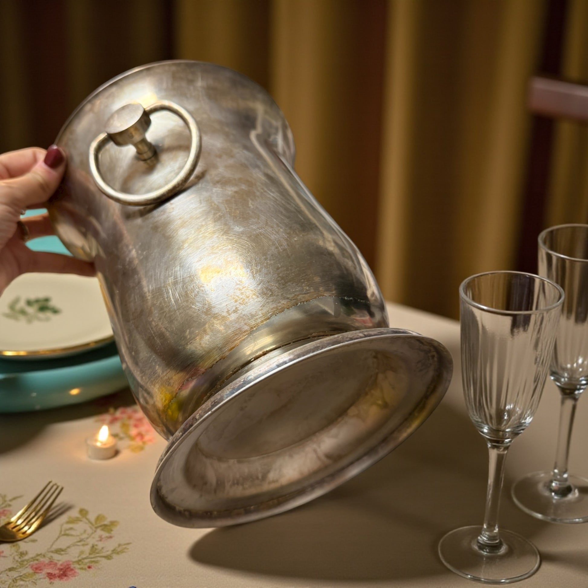 Ci sono oggetti che nascono per servire, e altri che sembrano custodire un segreto. Questo secchiello da champagne, plasmato in Francia tra la fine degli anni Quaranta e i primi Cinquanta, appartiene a entrambe le categorie. Realizzato dalla Société d’Orfèvrerie de Fontenay, il suo punzone racconta già una storia: una chiave che termina in un cuore, sormontata dalle iniziali S·F, sigla di una delle manifatture più raffinate della tradizione argentiera francese. Nata alle porte di Parigi, la Société d’Orfèvrerie de Fontenay produceva argenteria di alta gamma destinata agli hotel e ai ristoranti di lusso, ma anche alle dimore borghesi che volevano portare in tavola un riflesso della vie parisienne. Il simbolo della chiave — elegante, preciso, quasi araldico — era un emblema di distinzione: la “chiave del gusto francese”, come amavano definirla nei cataloghi dell’epoca. E il cuore che ne orna la punta non era solo un vezzo decorativo: rappresentava la passione e la dedizione per un mestiere antico, quello dell’argentatura, esercitato con la stessa cura con cui si modella un gioiello. Nel disegno di questo secchiello si riconosce l’equilibrio perfetto tra funzione e stile: le linee svasate, i manici ad anello massicci ma armoniosi, il piede ampio che lo ancora alla tavola. Immaginalo in un bistrot parigino del 1952, tra il tintinnio dei bicchieri e il profumo di tabacco e champagne. O su una tavola domestica, in una sera d’estate, mentre un gesto lento solleva gli anelli laterali e un secchio di ghiaccio scioglie la luce in mille riflessi d’argento.