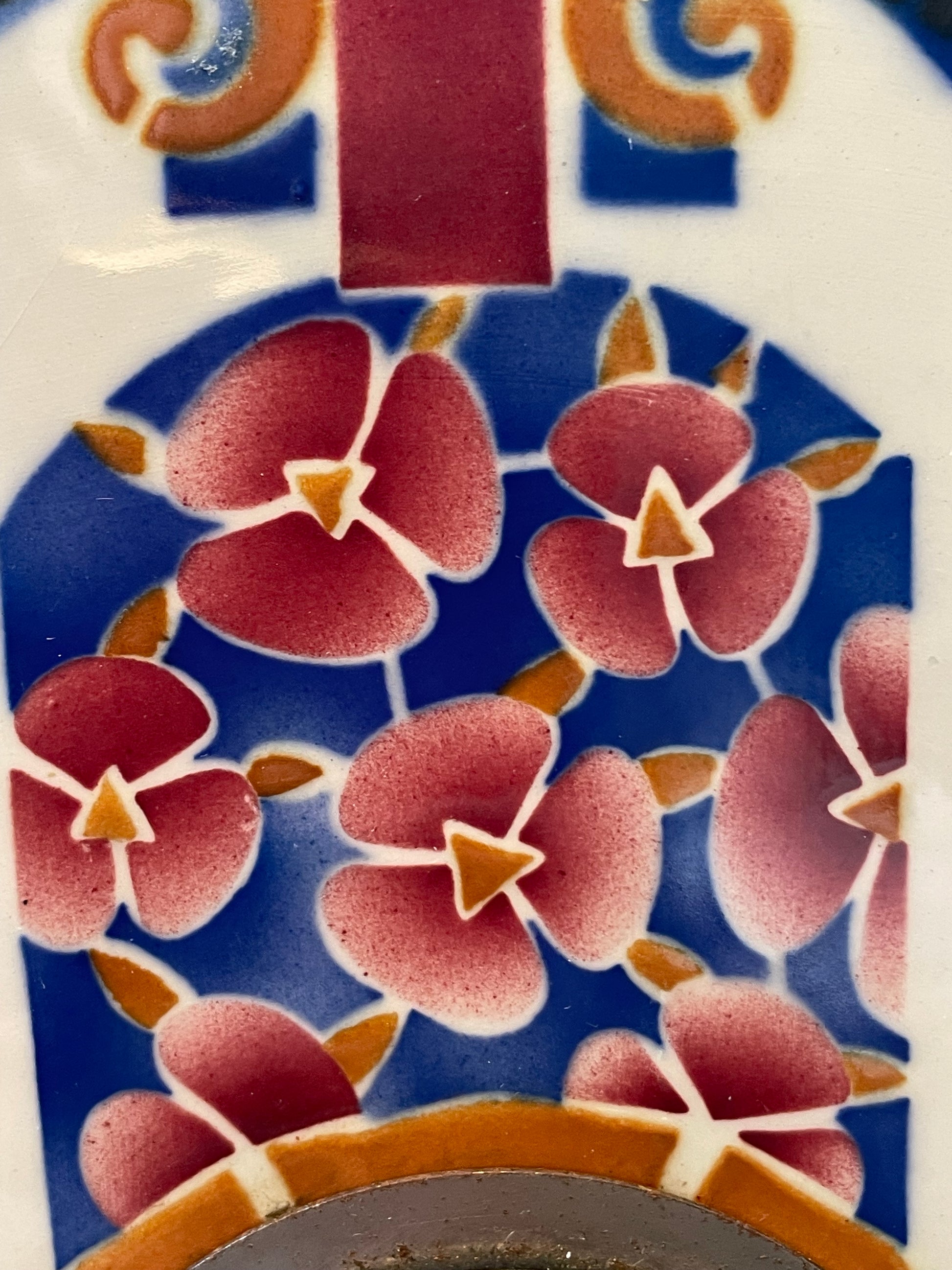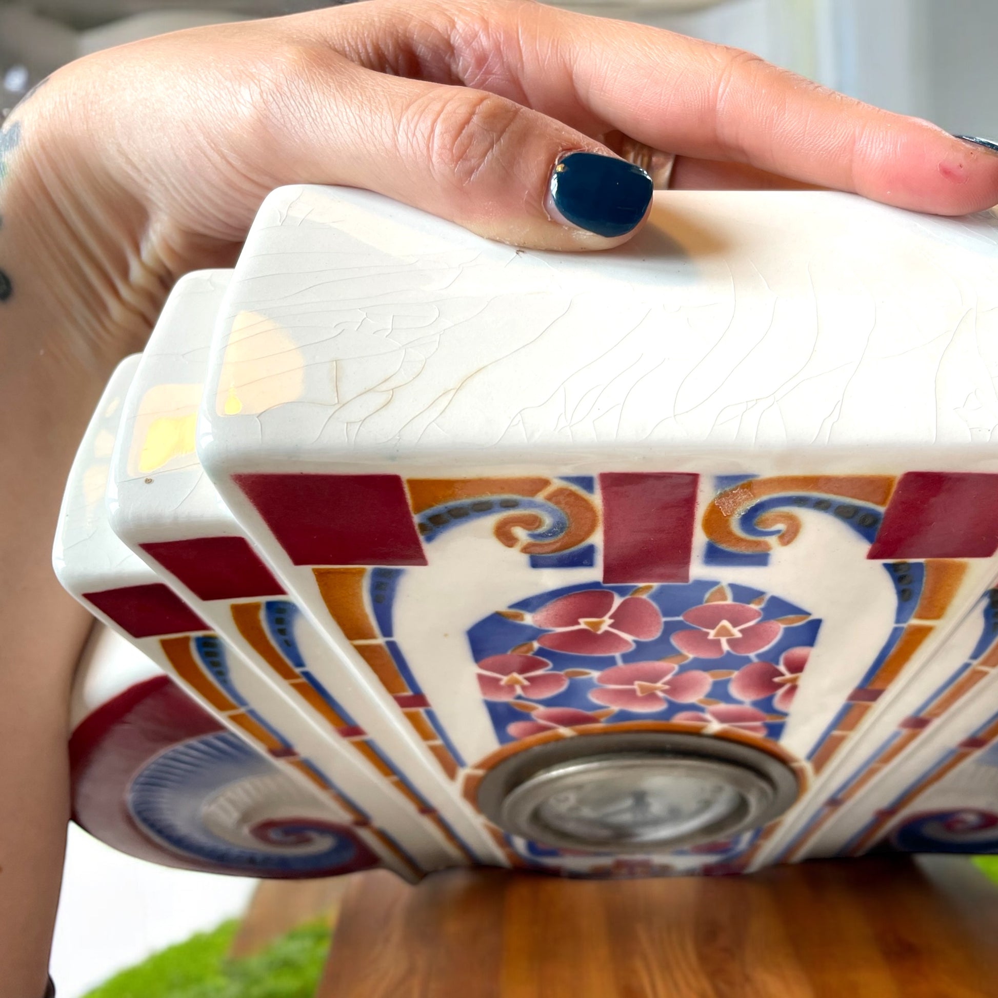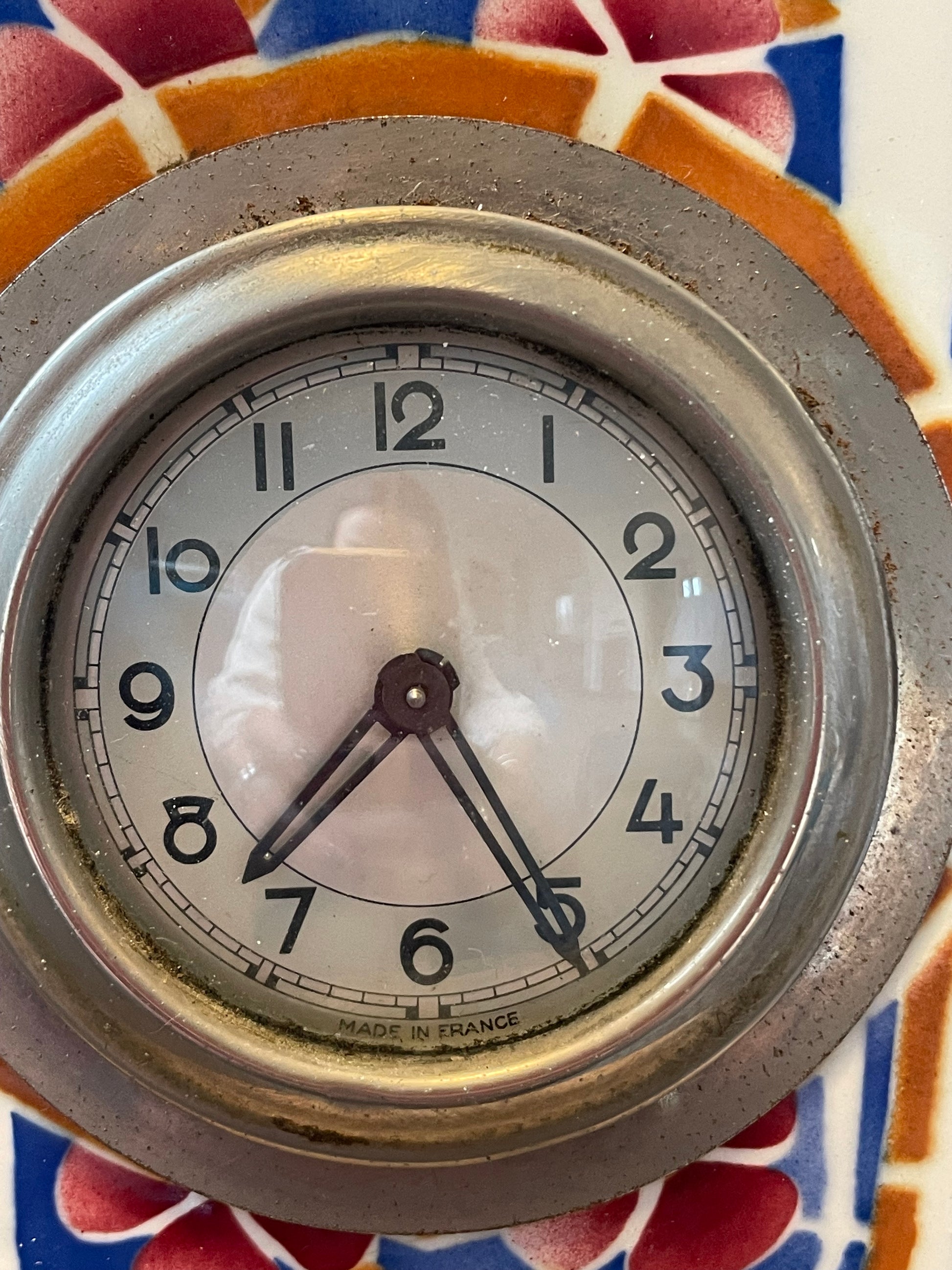 Un’eleganza senza tempo si sprigiona da questo raffinato orologio da camino in ceramica, un autentico esempio di stile Art Deco risalente agli anni ‘30 - ‘40. La sua struttura scalare e le linee geometriche si fondono con l’intensità cromatica dei motivi floreali, creando un perfetto equilibrio tra rigore architettonico e delicatezza decorativa. Prodotto in Francia, come confermato dalla dicitura “Made in France” sia sulla scocca che sul quadrante, questo orologio rappresenta il gusto innovativo dell’epoca, dove materiali moderni e design audaci trovavano spazio nelle case borghesi. Il meccanismo, completo di chiave di ricarica integrata, è stato testato ed è funzionante. Le lancette sono in materiale plastico d’epoca (probabilmente bachelite). La parte superiore presenta un sottile effetto craquelé, una caratteristica tipica delle ceramiche esposte al calore, che non compromette in alcun modo la solidità della struttura, ma racconta piuttosto la storia e l’età dell’oggetto (visibili ultima foto). Un bellissimo pezzo decorativo, una finestra aperta su un’epoca che ha saputo mescolare arte e design in modo straordinario. Perfetto per arricchire una mensola, un mobile antico o il ripiano di un camino, porta con sé il fascino delle forme e dei colori tipici dell’Art Deco francese. Le dimensioni: cm 30 x 22.