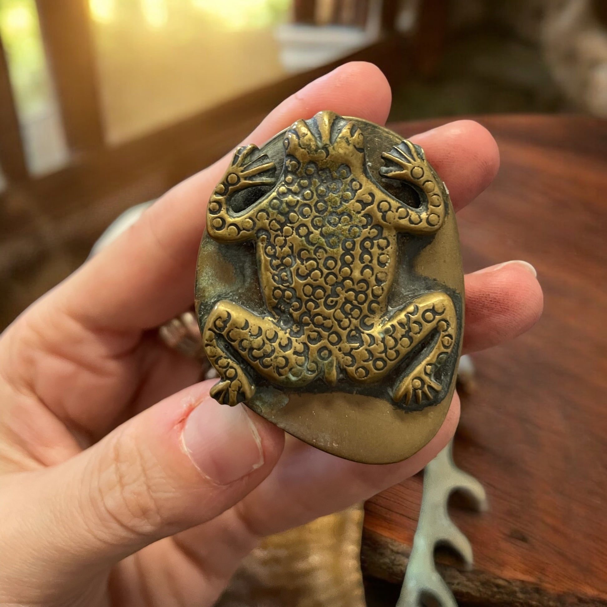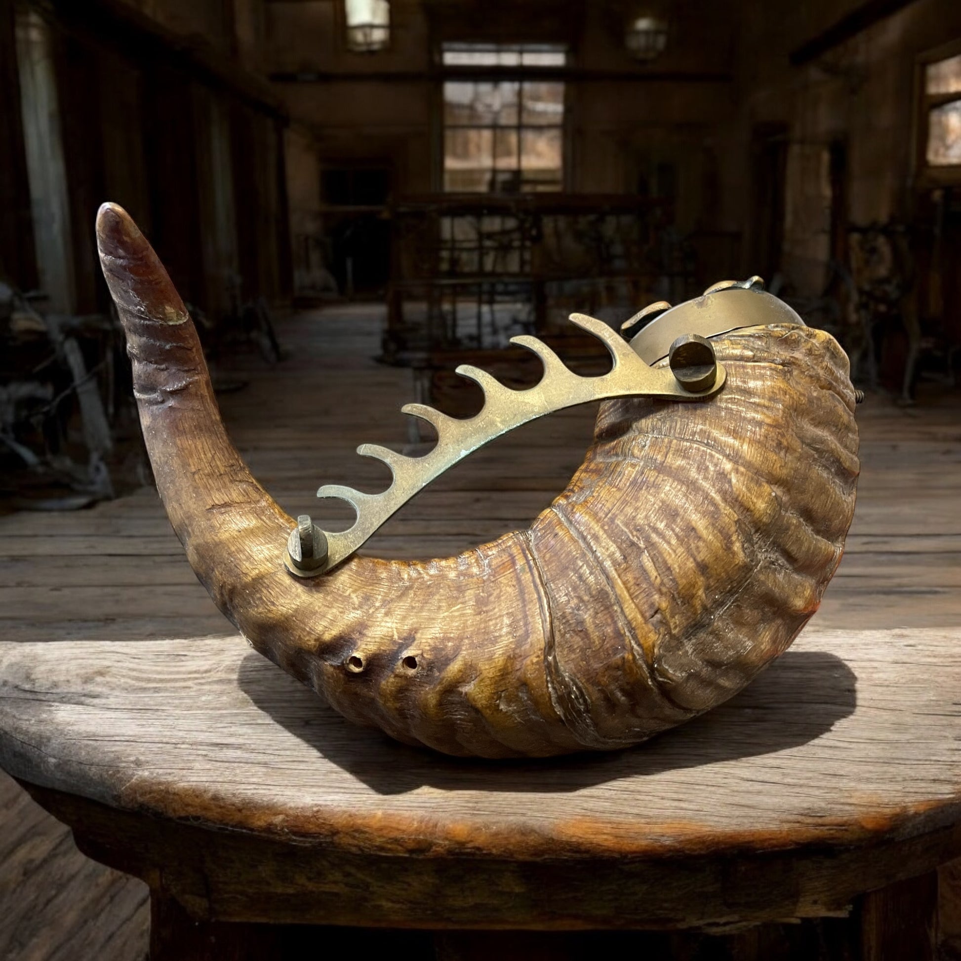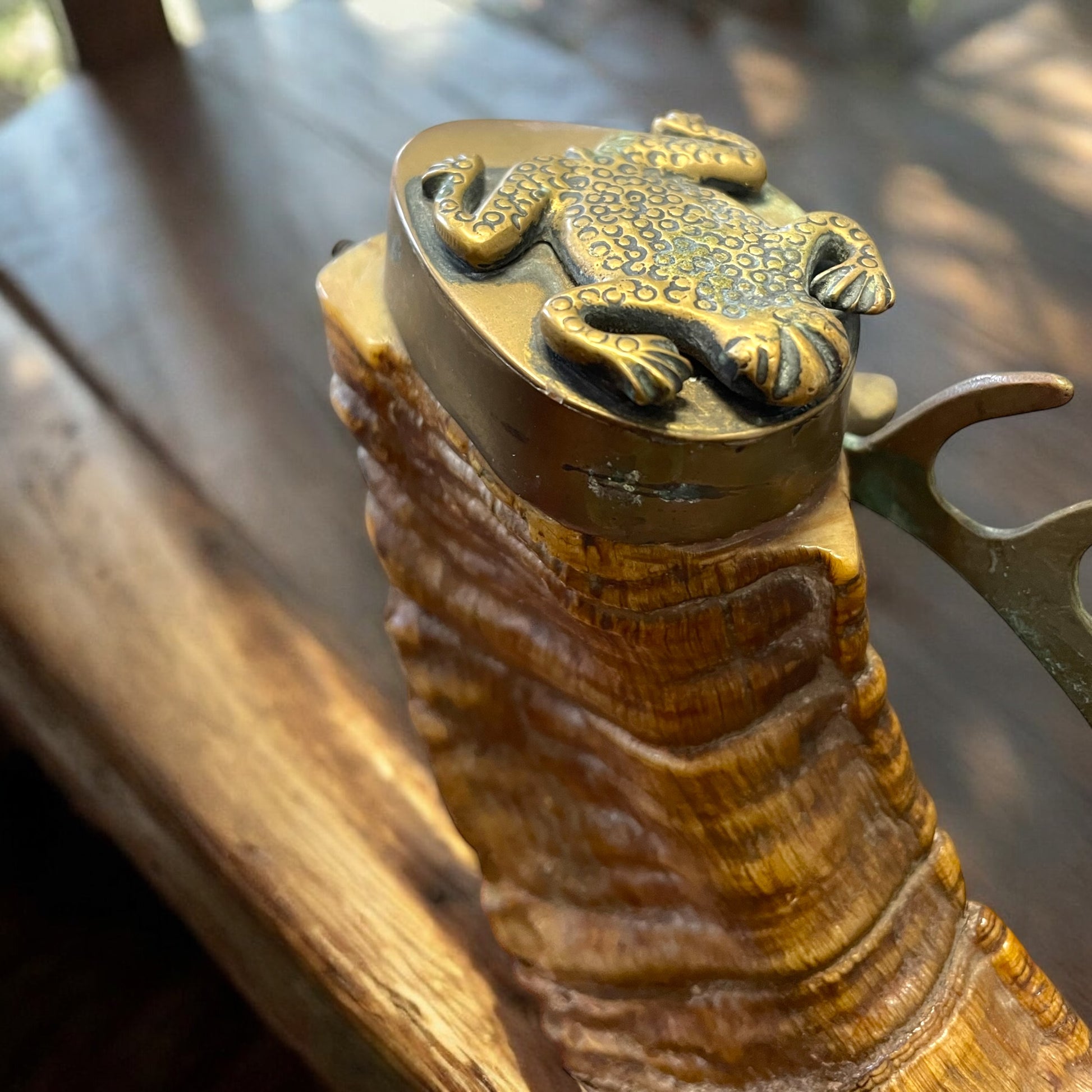 Sul legno vissuto di un antico tavolo, all’interno di un vecchio casino di caccia, giace questa straordinaria fiaschetta in corno, forse testimone silenziosa di epoche in cui il tempo era scandito dal suono dei passi tra le foglie e dall’eco lontana di spari nel bosco. Il corno naturale di montone, levigato dal tempo e dalla mano esperta di un artigiano, si incurva con eleganza primitiva, accogliendo una montatura in ottone finemente lavorata. Il tappo, impreziosito da una rana in rilievo, custodisce il ricordo di mani che un tempo ne sollevavano il coperchio per versare la preziosa polvere da sparo, essenziale compagna di ogni battuta di caccia. O forse… forse il tavolo antico è una antica scrivania: il corno è parte di un set con calamaio per scrittura di epoca liberty, primissimo ‘900, un oggetto raro ed estremamente decorativo, che porta con sè un’eleganza dimenticata. Rimarrà un oggetto misterioso?