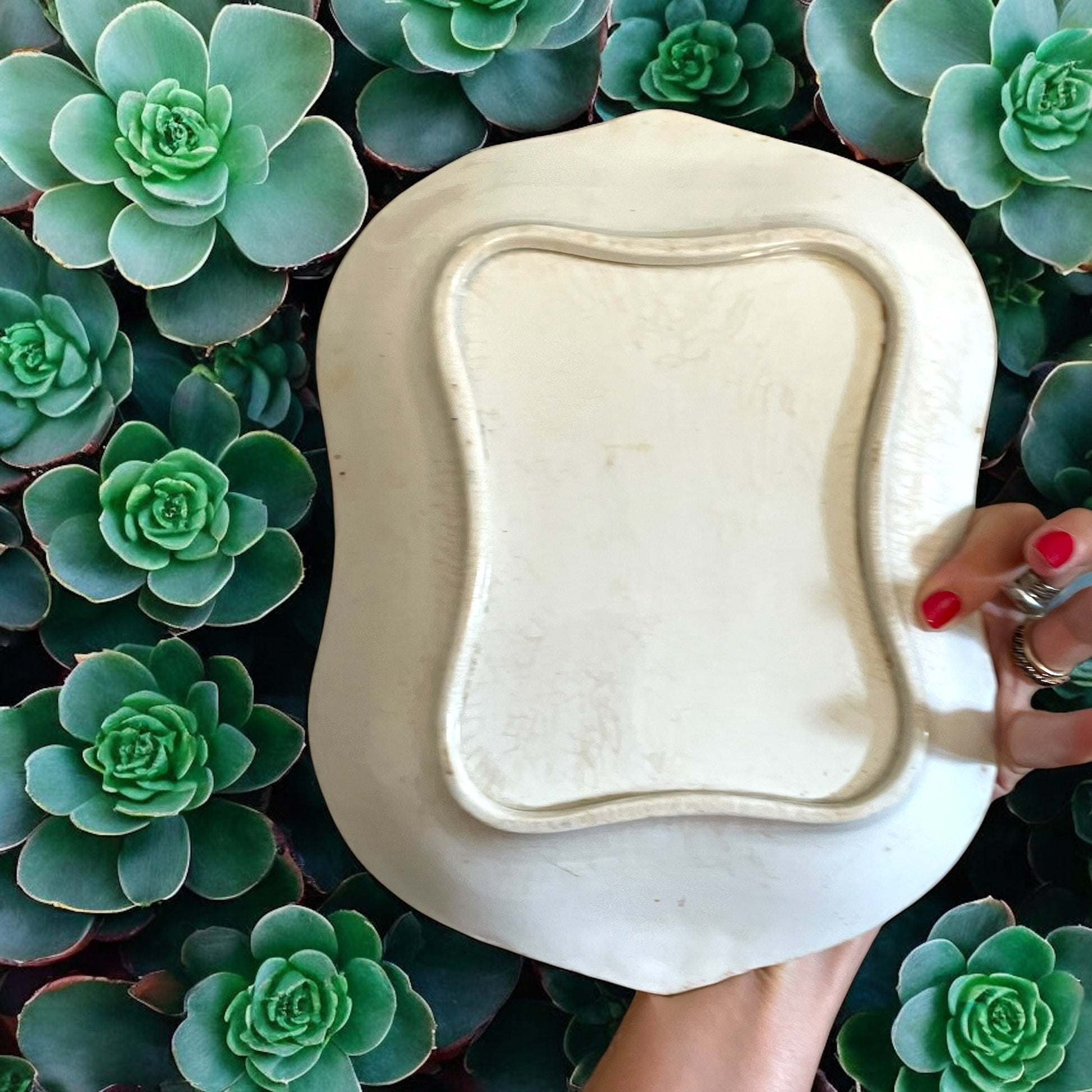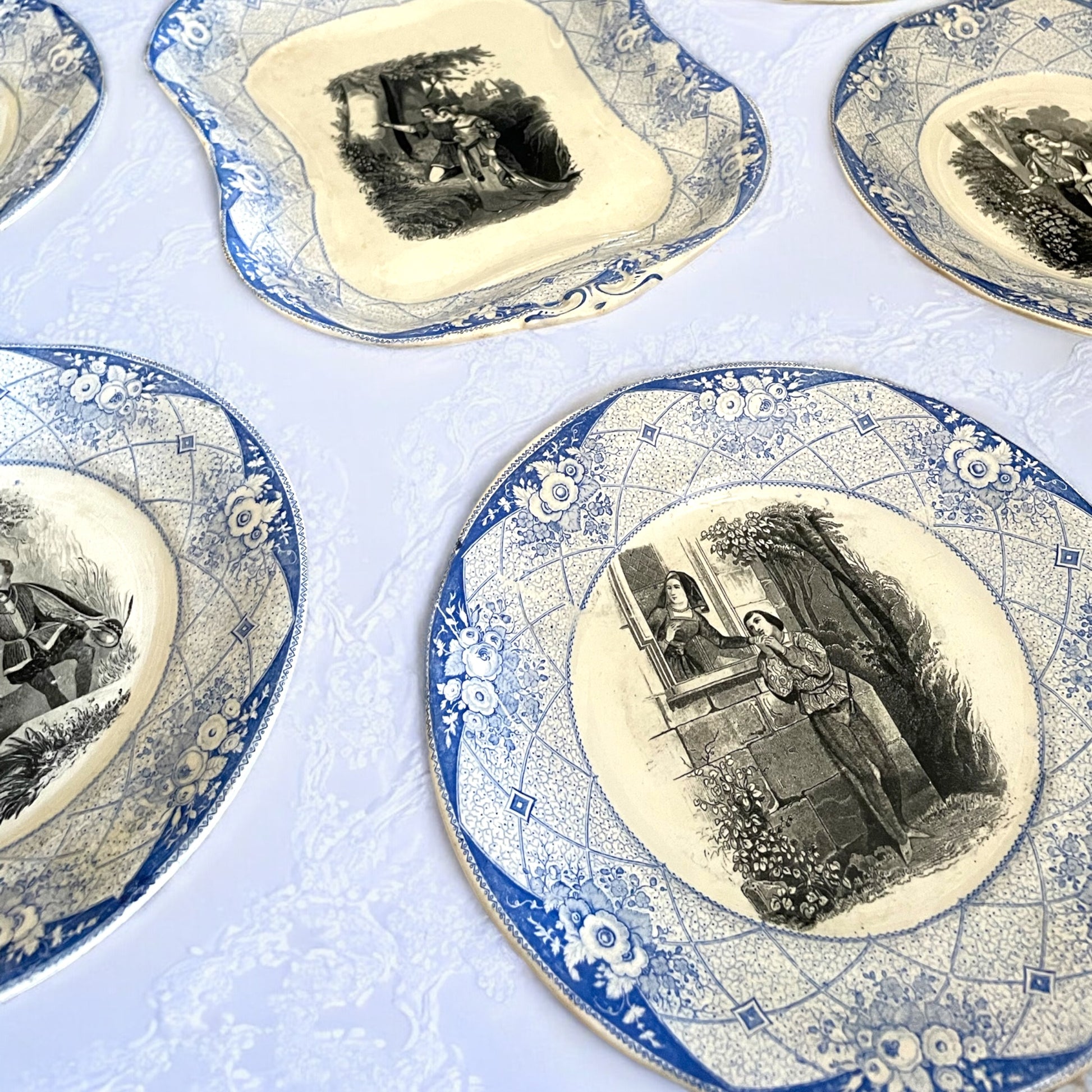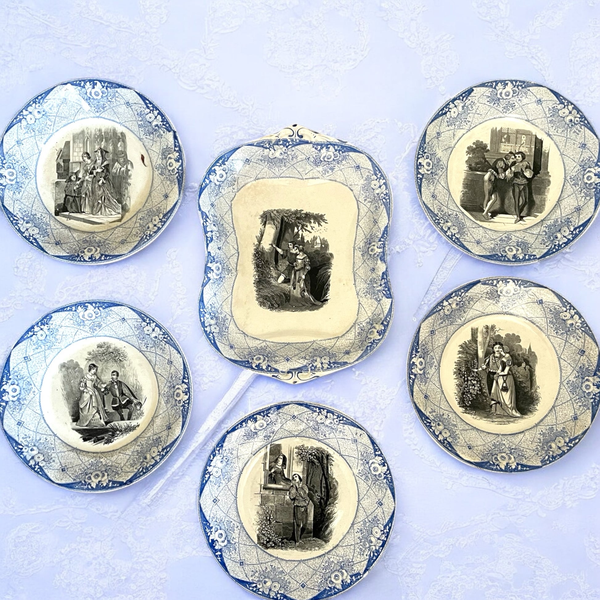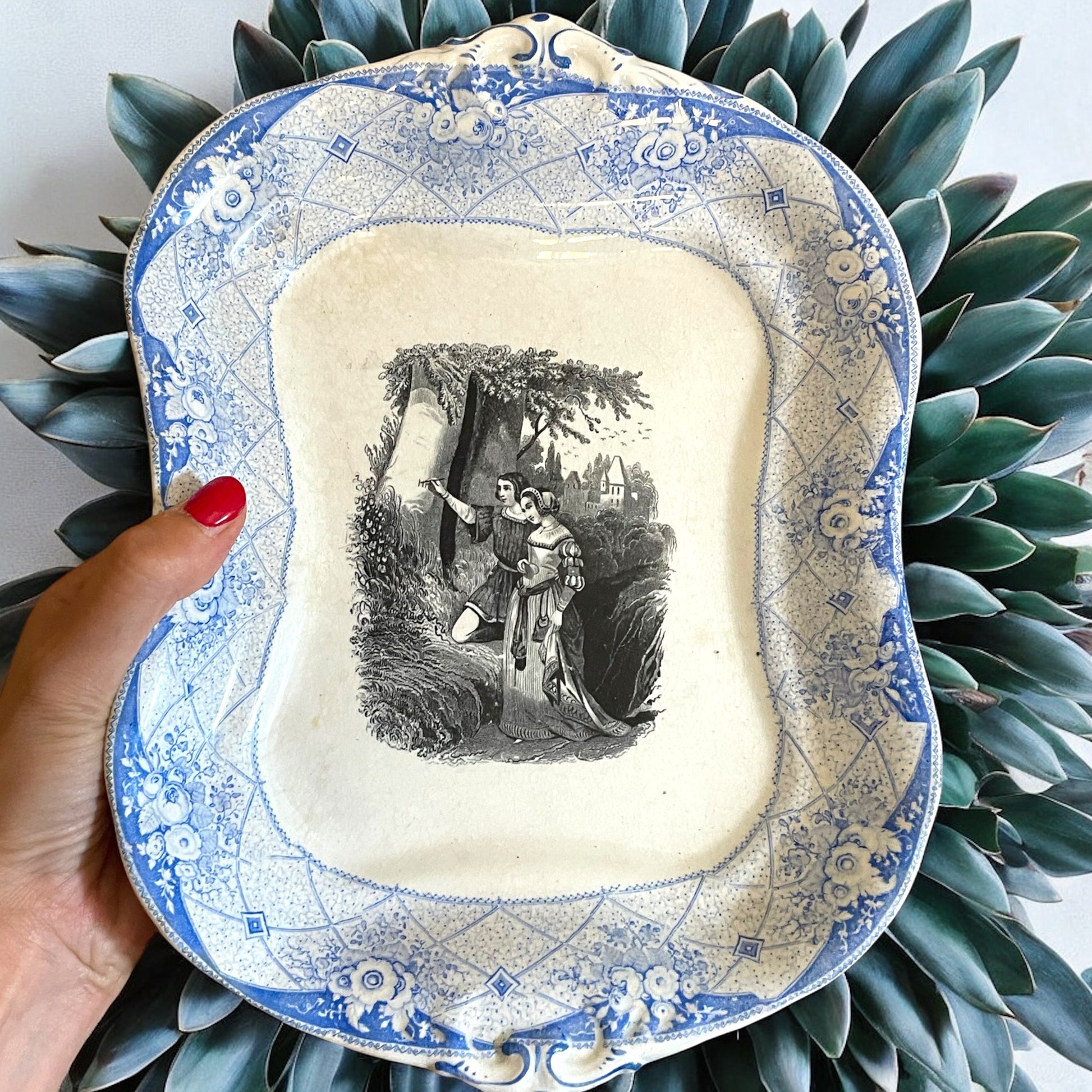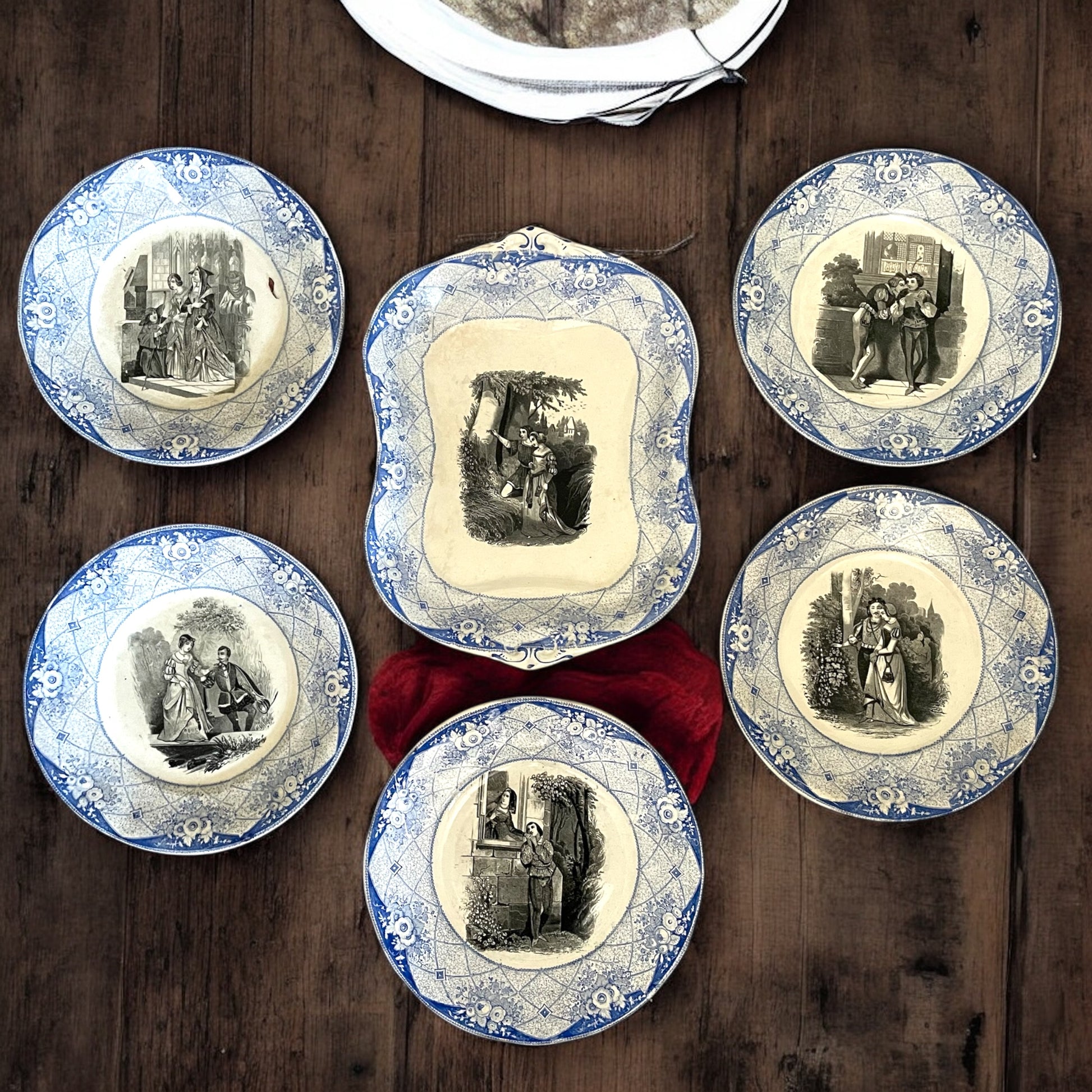 C’è una storia d’amore sospesa in ogni piatto, un incontro sussurrato tra le pieghe del tempo. Questo servizio in terraglia fine, composto da cinque piatti tondi e un elegante piatto rettangolare da portata, proviene con ogni probabilità da una manifattura francese della fine del XIX secolo. Il bordo, decorato da un motivo floreale blu intenso, incornicia delicate scene romantiche impresse con la tecnica del transferware: coppie in abiti d’epoca, dialoghi rubati, atmosfere teatrali che sembrano uscire da un romanzo illustrato del tempo. Colpisce la leggerezza insospettata di questi piatti, che a dispetto dello spessore conservano un equilibrio raffinato tra estetica e funzionalità, come era tipico delle ceramiche francesi tardo-ottocentesche pensate per la tavola borghese. Nessuna crepa né sbeccatura: solo una patina del tempo che aggiunge fascino e autenticità. Ideale per collezionisti, mise en place poetiche, ambientazioni scenografiche o semplicemente per chi sa riconoscere la bellezza che sopravvive al tempo. Le dimensioni: il rettangolare 27 x 21 cm, diametro dei tondi 20 cm.