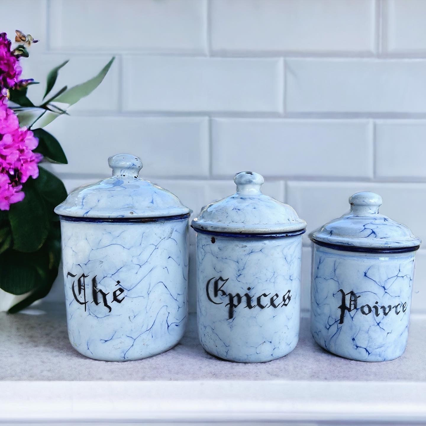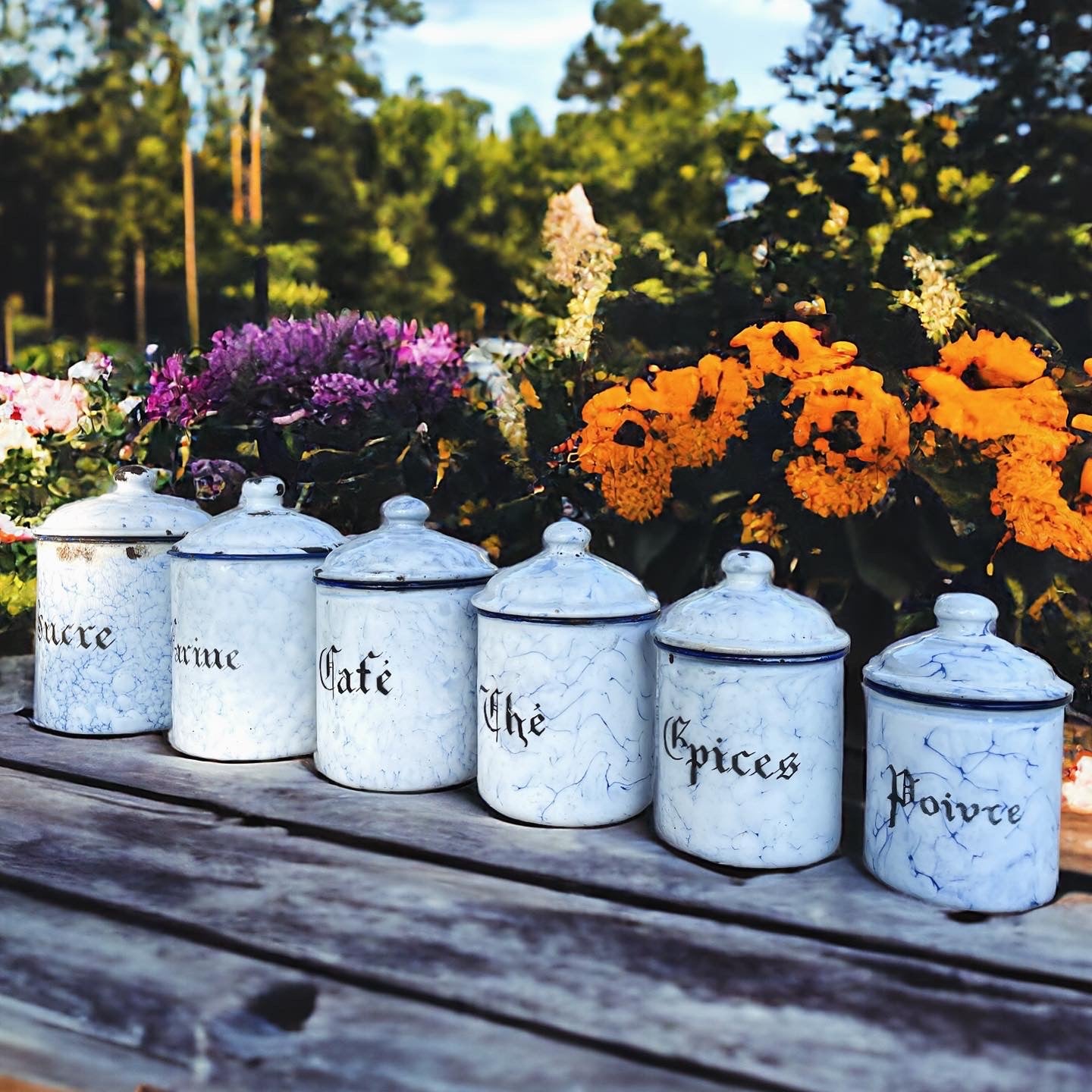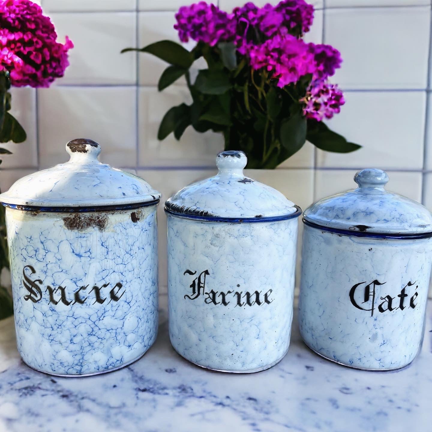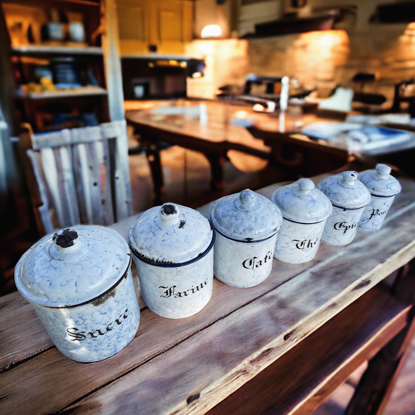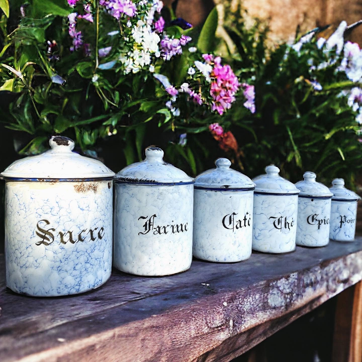 Back from the Dutch and Belgian countryside! Sought after, indeed very sought after, are they… the antique apothecary vases from the 20s! Set of 6, white-blue with more detailed edges and writing, respectively from largest to smallest for: sugar - flour - coffee - tea - spices - pepper. With defects in the enamel that make them very second-rate; wonderful patina of time, they are very rare so old (usually you find enamelled ones but more recent and in other colours). Not to be missed.