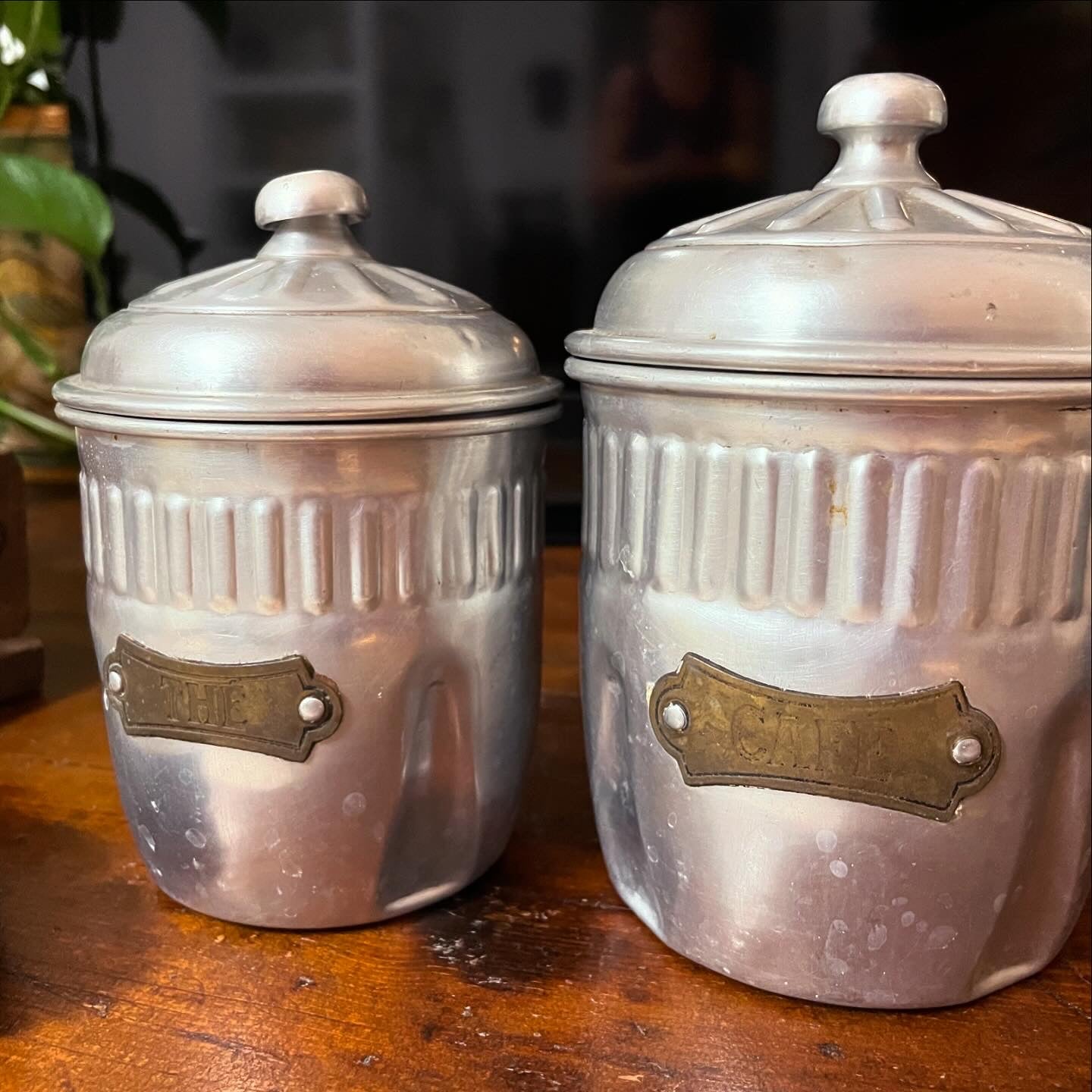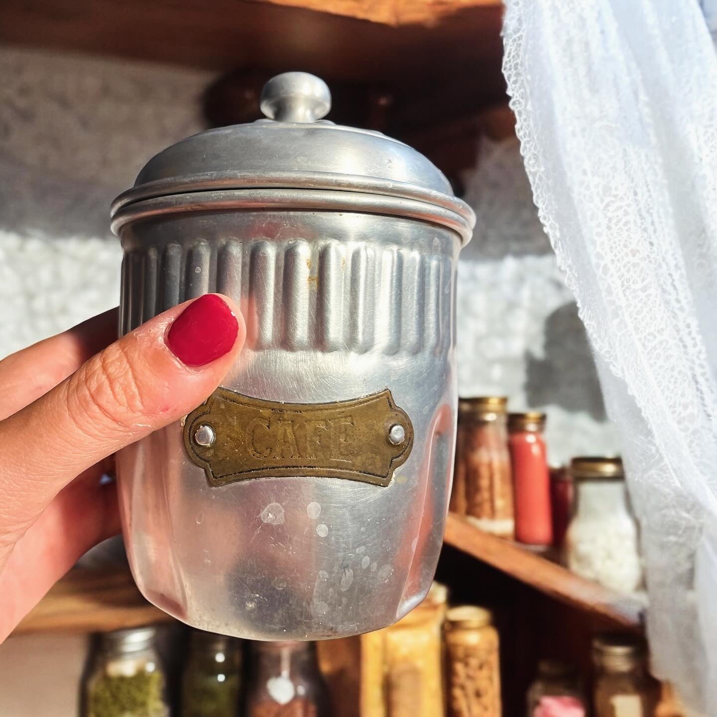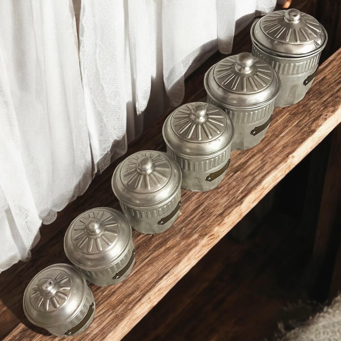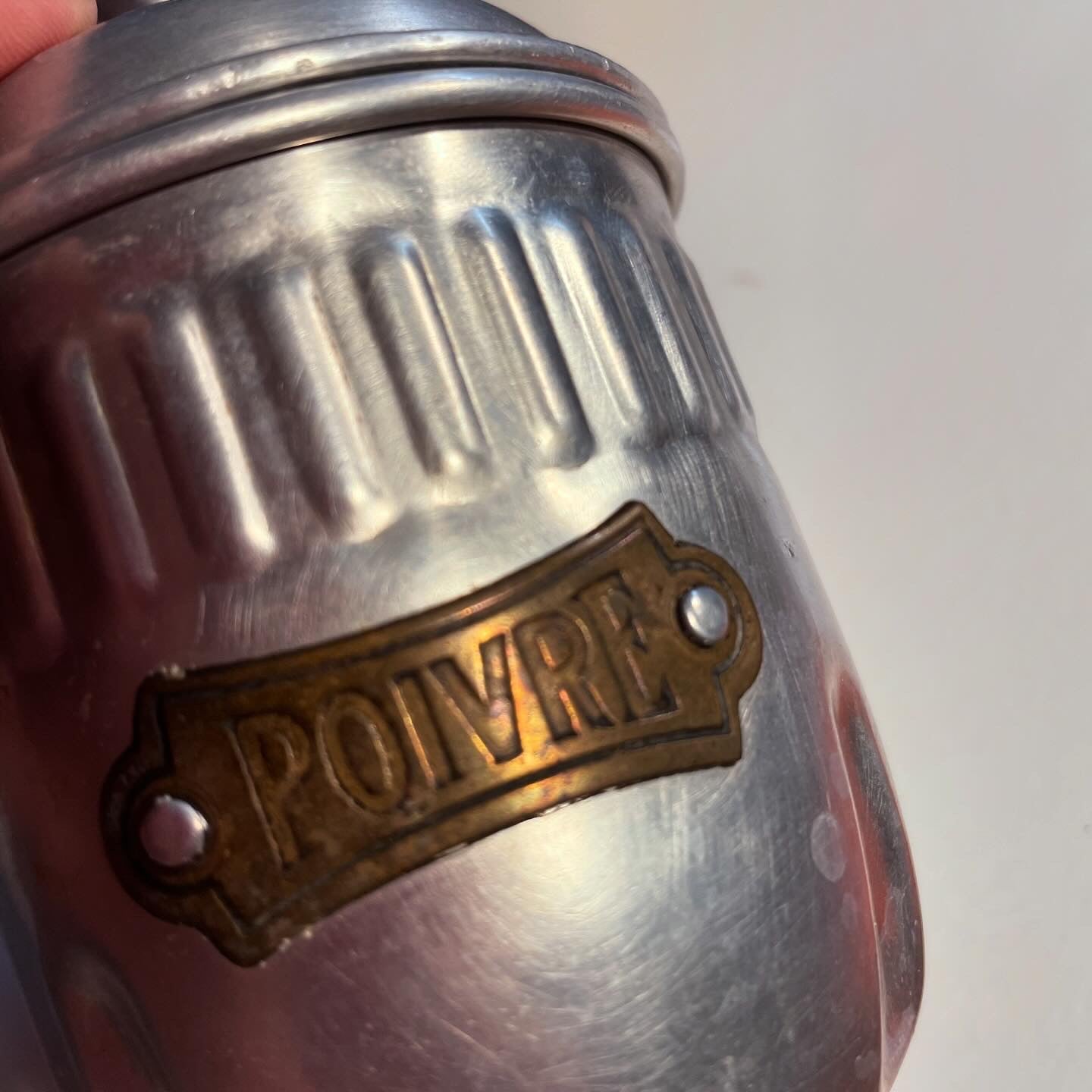 Fantastic set of old aluminum kitchen jars with French labels to contain various spices, each labeled with its own brass label and the name of the Spice. These are containers collected in a Provencal country house. We had a similar set, less complete, sold immediately. These are all in scale and there are 6. They show some signs of time and a beautiful patina brocante.