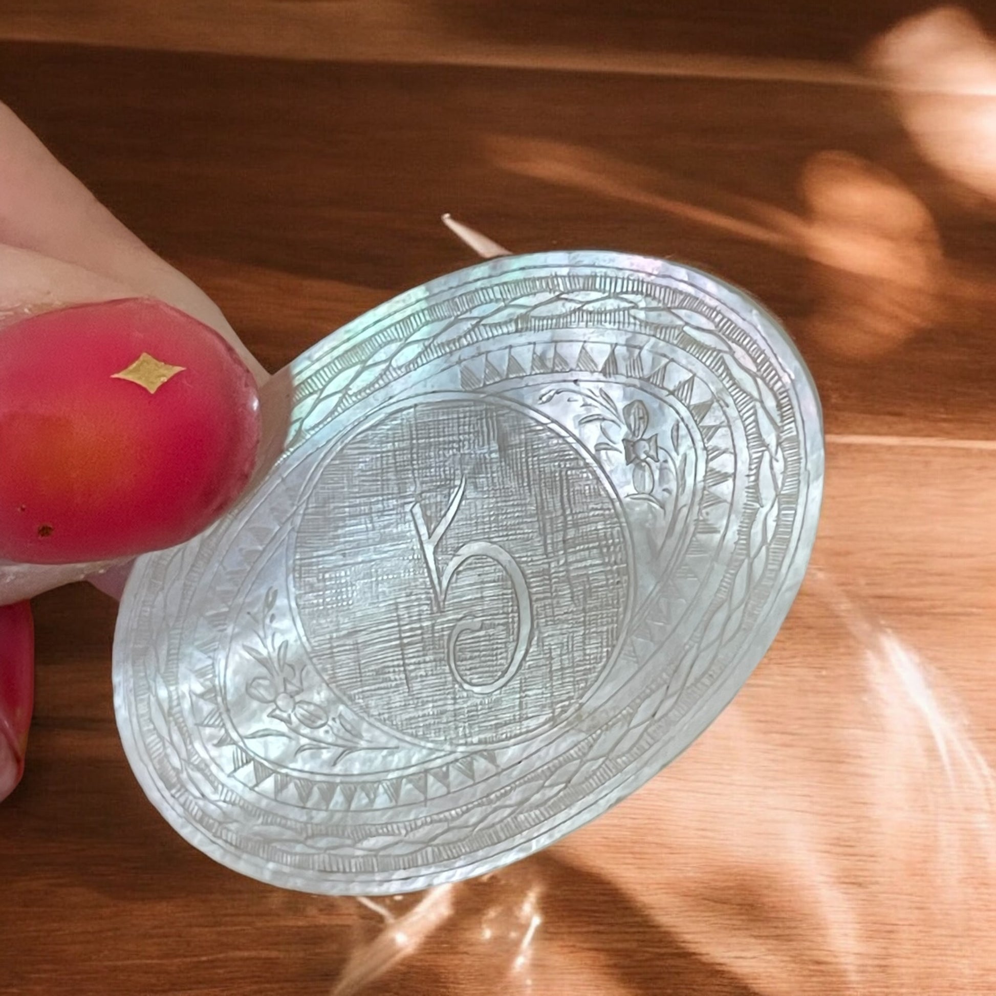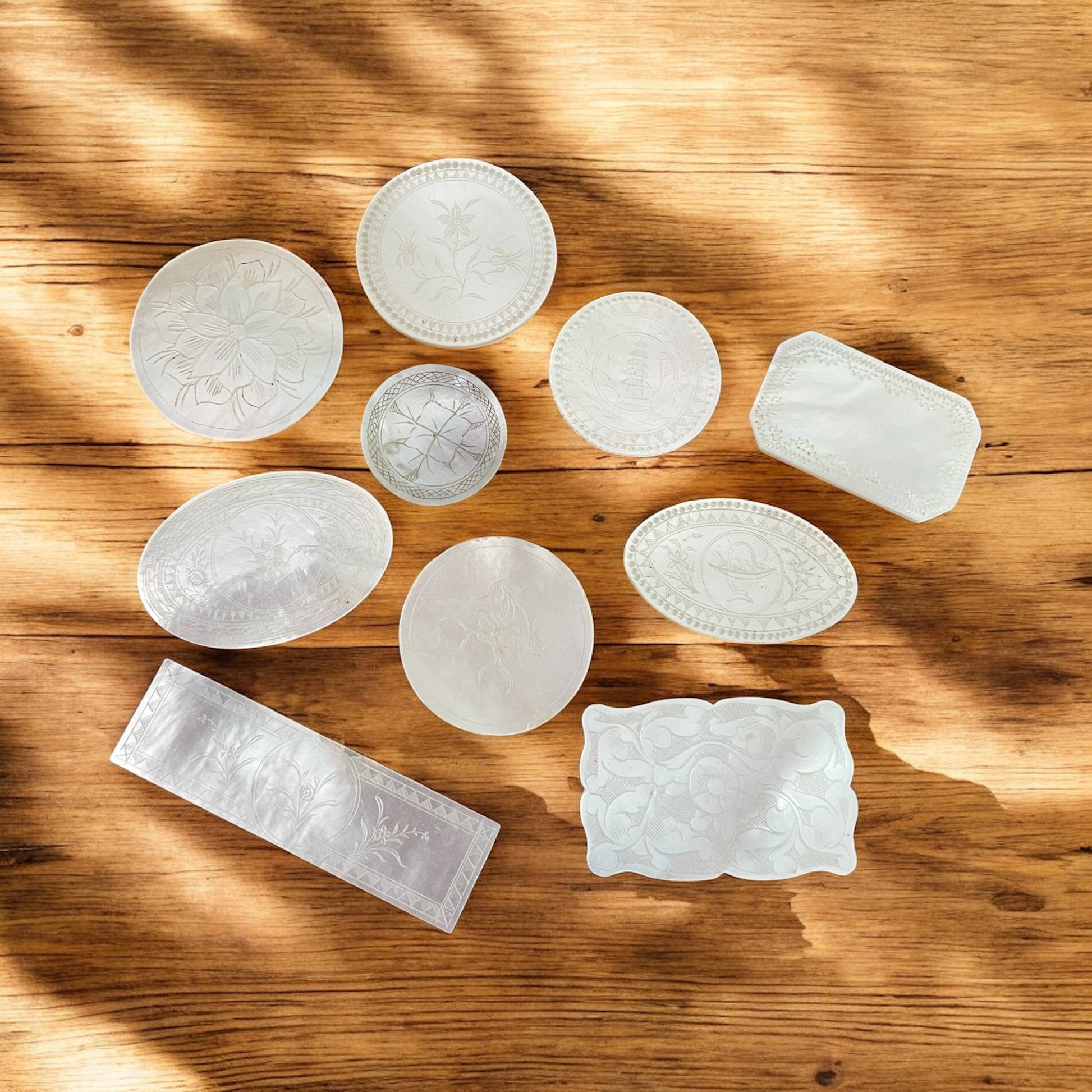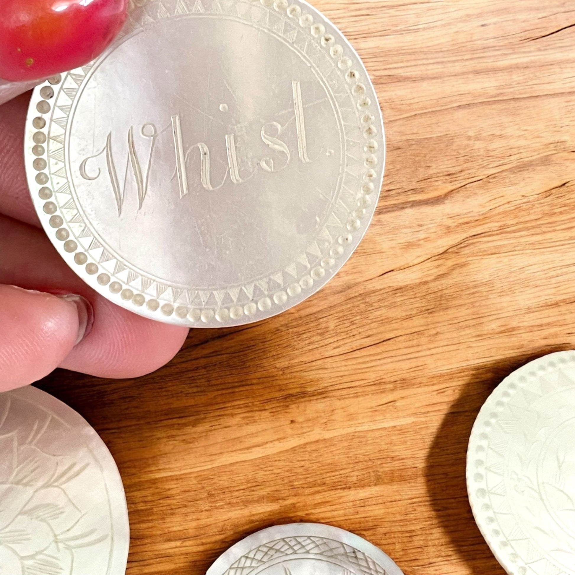 Set di 10 gettoni da gioco antichi, madreperla naturale incisa. Epoca: ca. 1820–1860. Provenienza: produzione cantonese (Cina), esportazione per l’Europa. Destinazione d’uso: Whist / giochi di società / segnapunti. Rari.