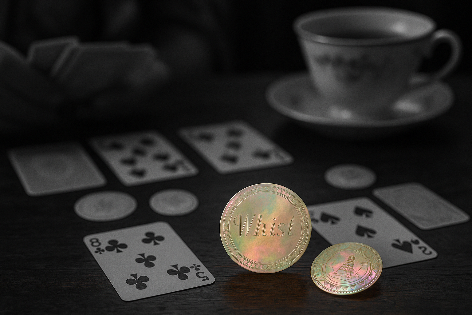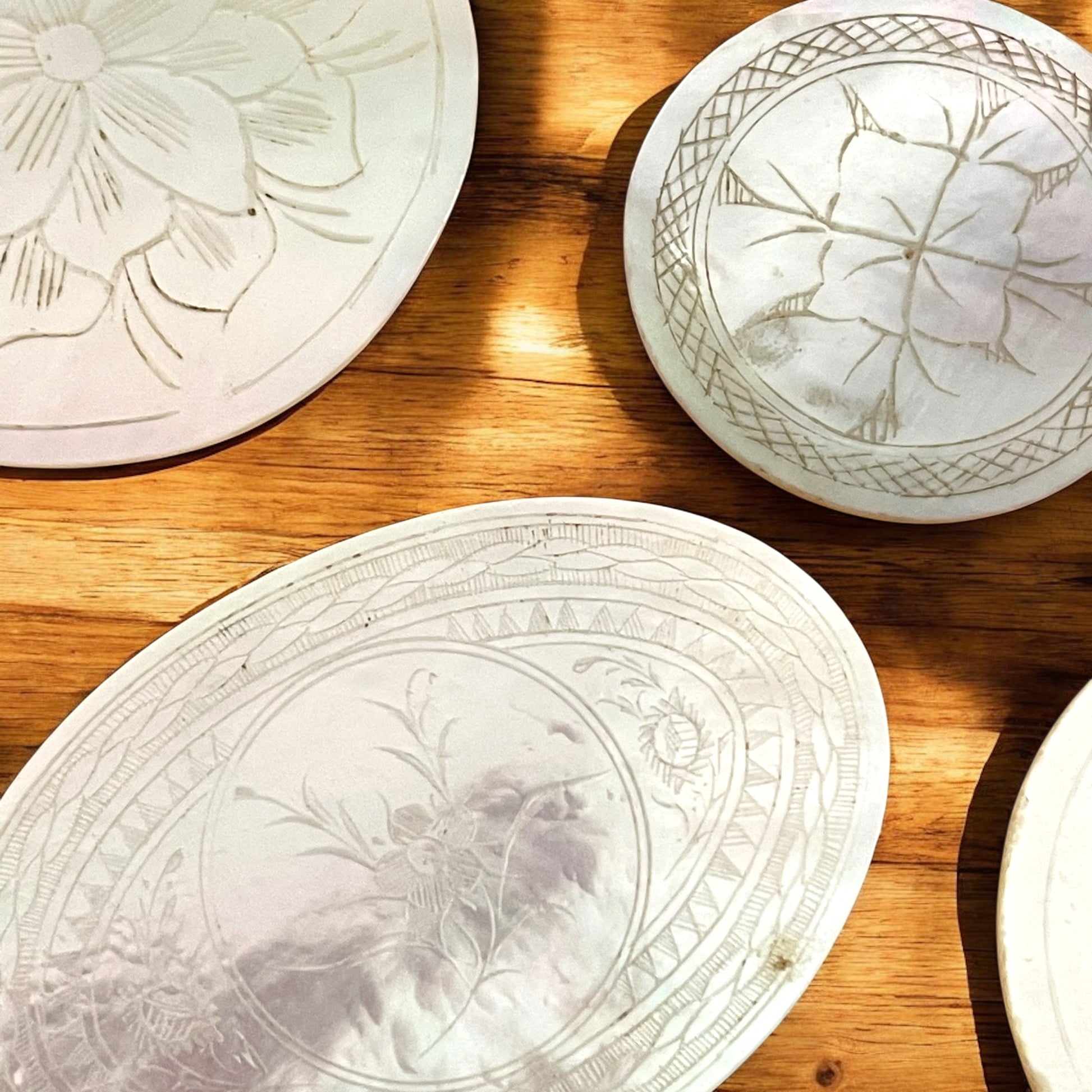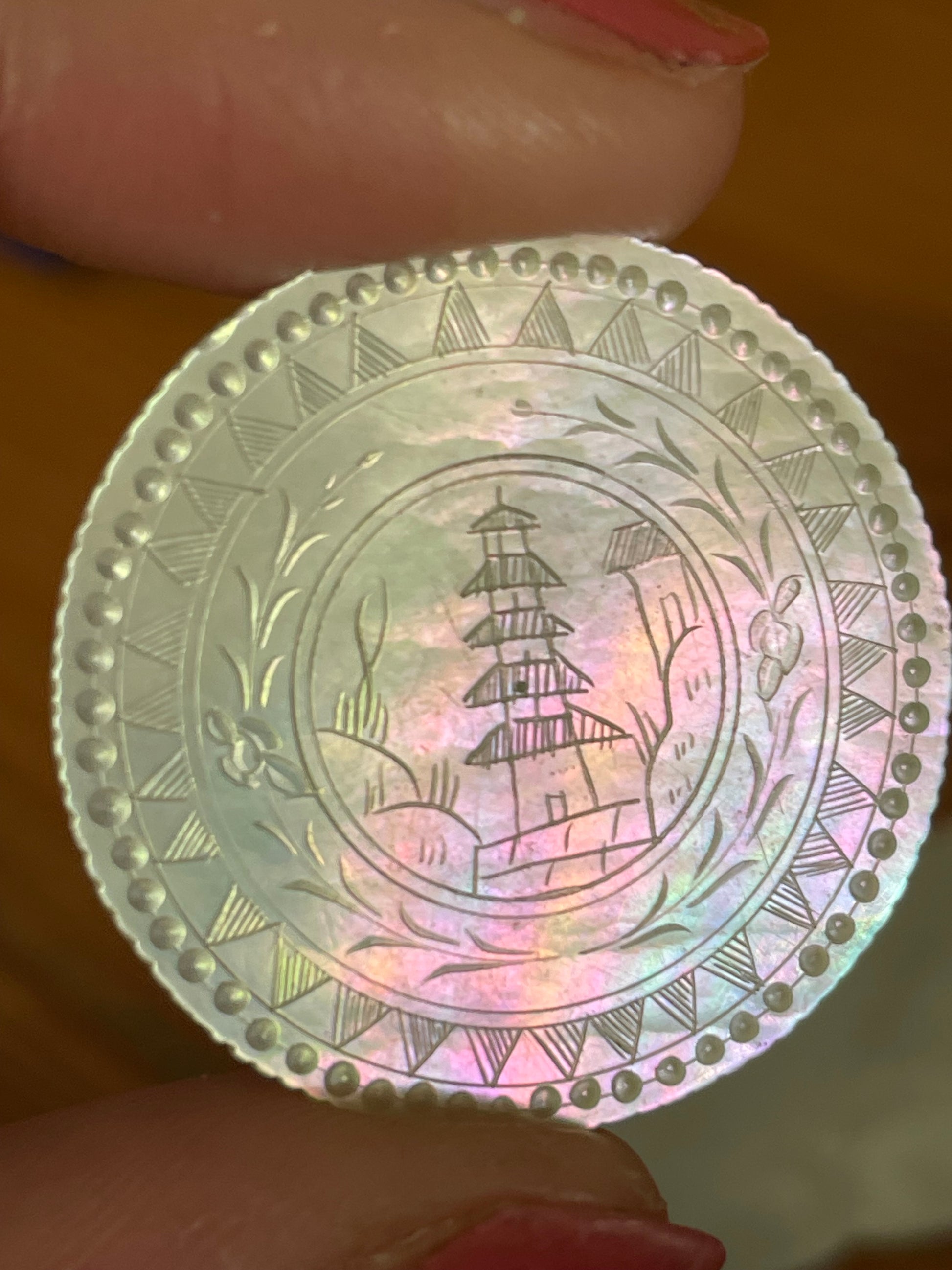 Set di 10 gettoni da gioco antichi, madreperla naturale incisa. Epoca: ca. 1820–1860. Provenienza: produzione cantonese (Cina), esportazione per l’Europa. Destinazione d’uso: Whist / giochi di società / segnapunti. Rari.