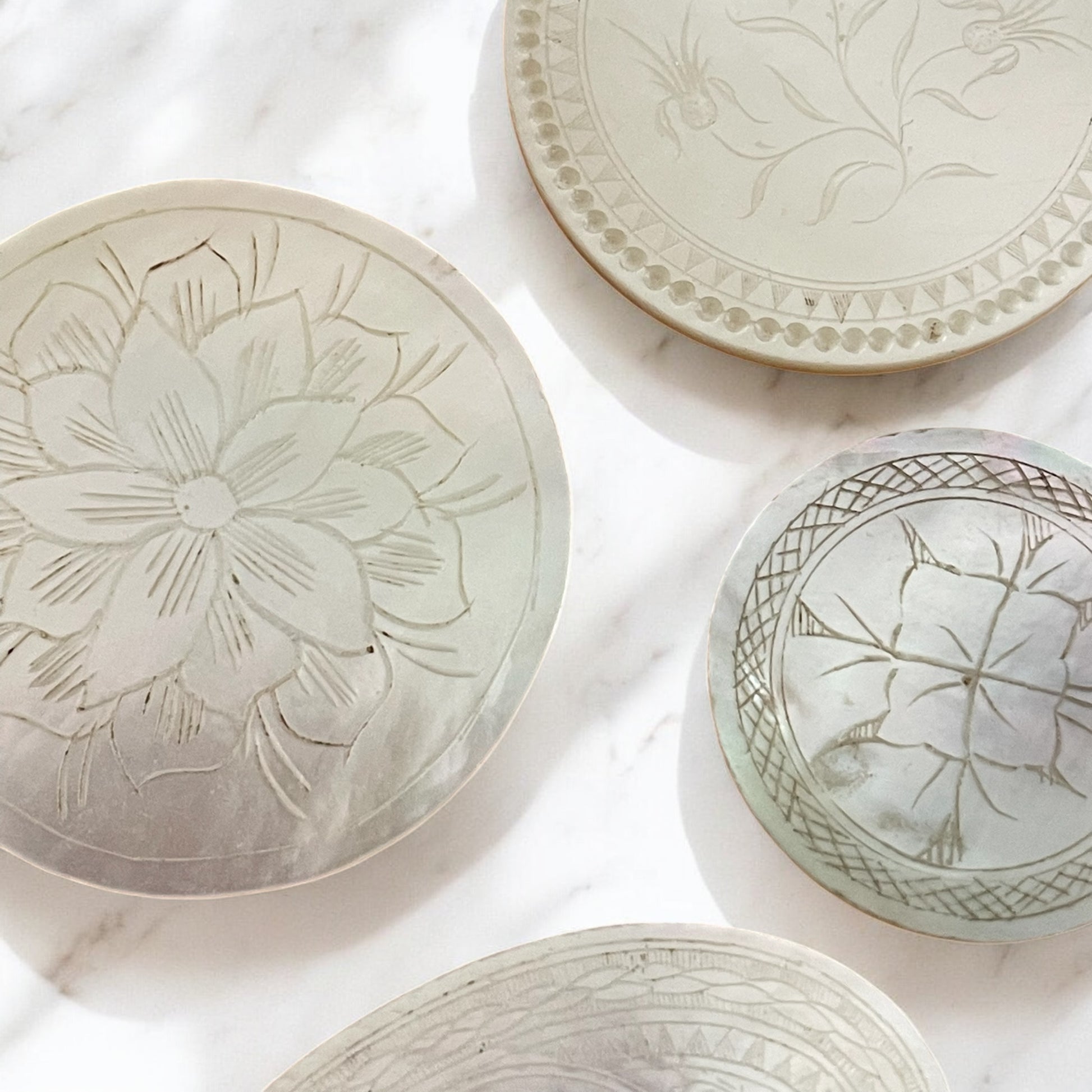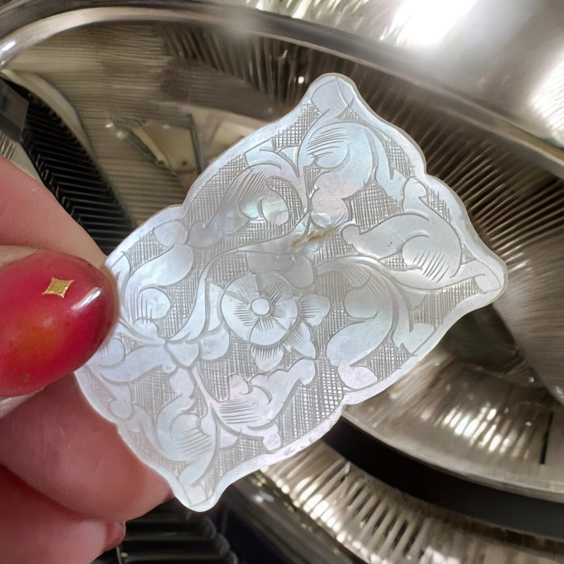 Immagina un pomeriggio silenzioso in un salotto vittoriano. Le tazze di tè riposano su piattini di porcellana finissima, mentre le mani guantate delle signore muovono con grazia questi sottili gettoni iridescenti. Ogni pezzo è unico, inciso finemente su madreperla naturale con motivi che sembrano raccontare una storia diversa: fiori delicati, monogrammi misteriosi, architetture lontane come la pagoda cinese visibile su uno di essi. Questo set di 10 gettoni da gioco in madreperla, tutti diversi per forma e decorazione, risale con ogni probabilità alla prima metà del XIX secolo. La presenza di incisioni floreali finissime su entrambi i lati e di una scena orientale con pagoda testimonia l’origine cantonese, ovvero la produzione artigianale cinese destinata al mercato europeo, in particolare per il gioco del Whist e altri passatempi dell’élite. Alcuni gettoni riportano numeri, altri ancora splendide decorazioni floreali o tralci vegetali. Le incisioni, a doppia faccia, sono così raffinate da sembrare disegnate con un solo respiro. Solo su due pezzi si notano minime scheggiature, irrilevanti dal punto di vista estetico o collezionistico. Oggetti affascinanti e poetici, ideali per i collezionisti di curiosità d’epoca, per chi ama i materiali naturali o per chi desidera donare una nuova vita a oggetti antichi, trasformandoli in gioielli preziosi, segnalibri d’artista o pezzi da esposizione.