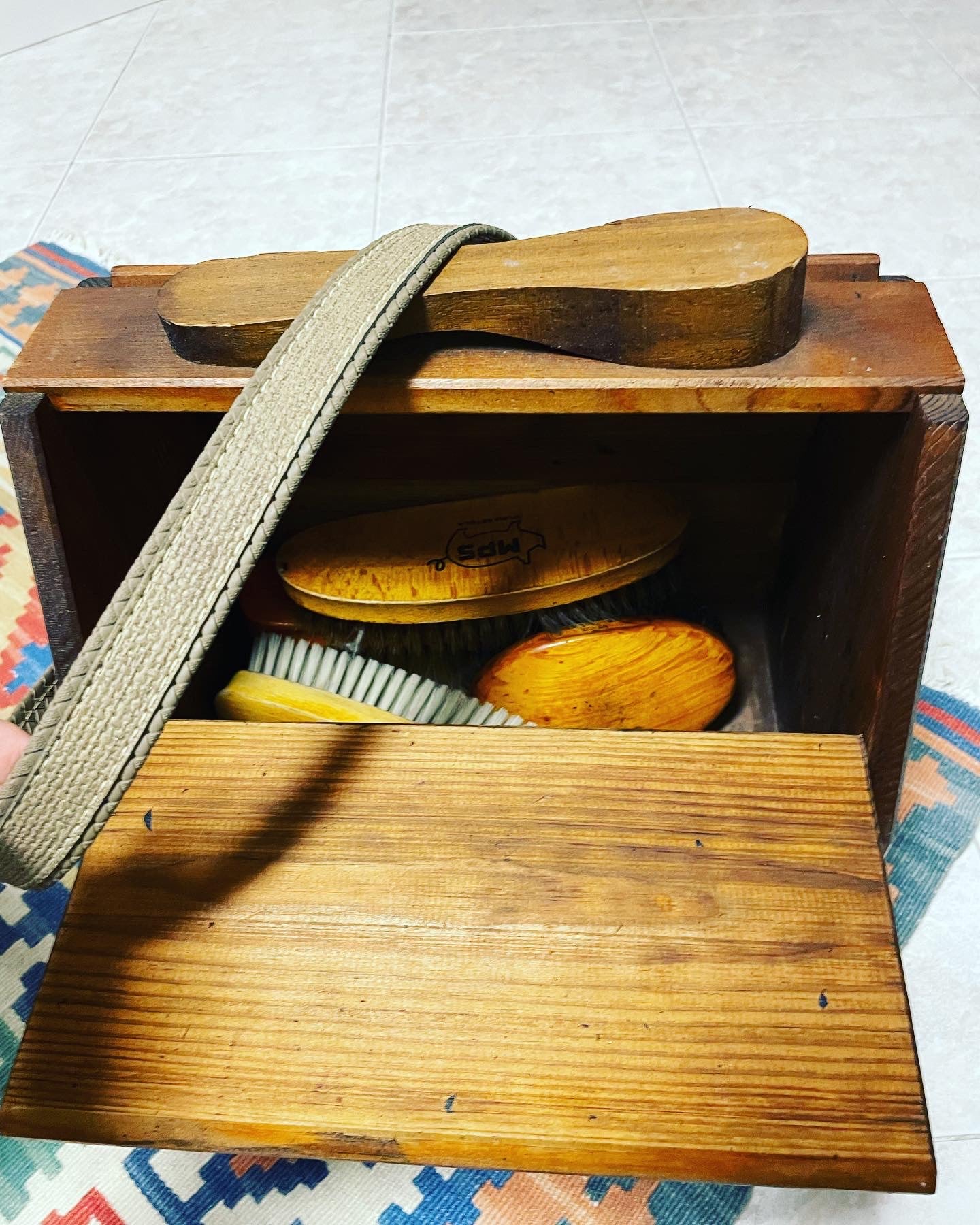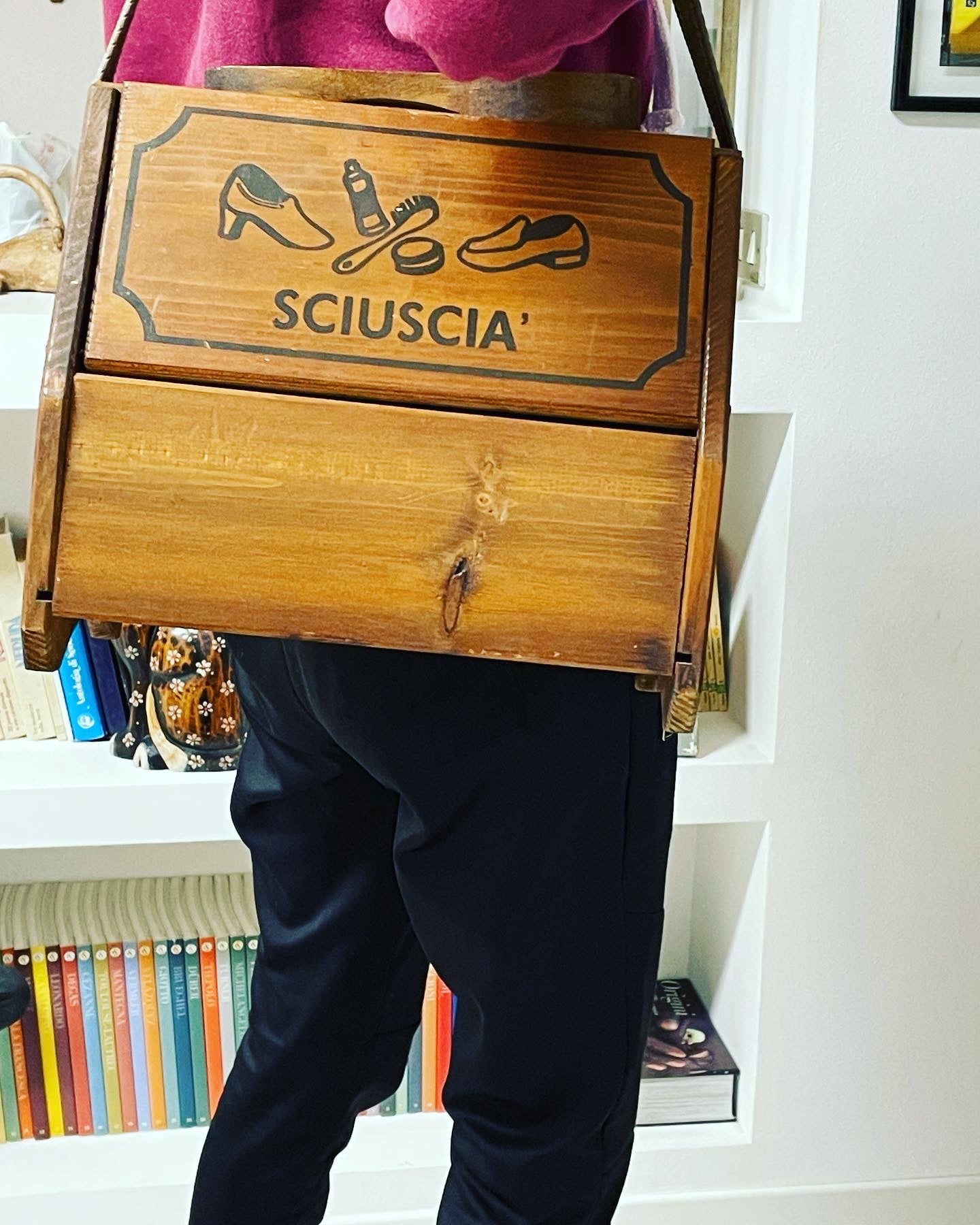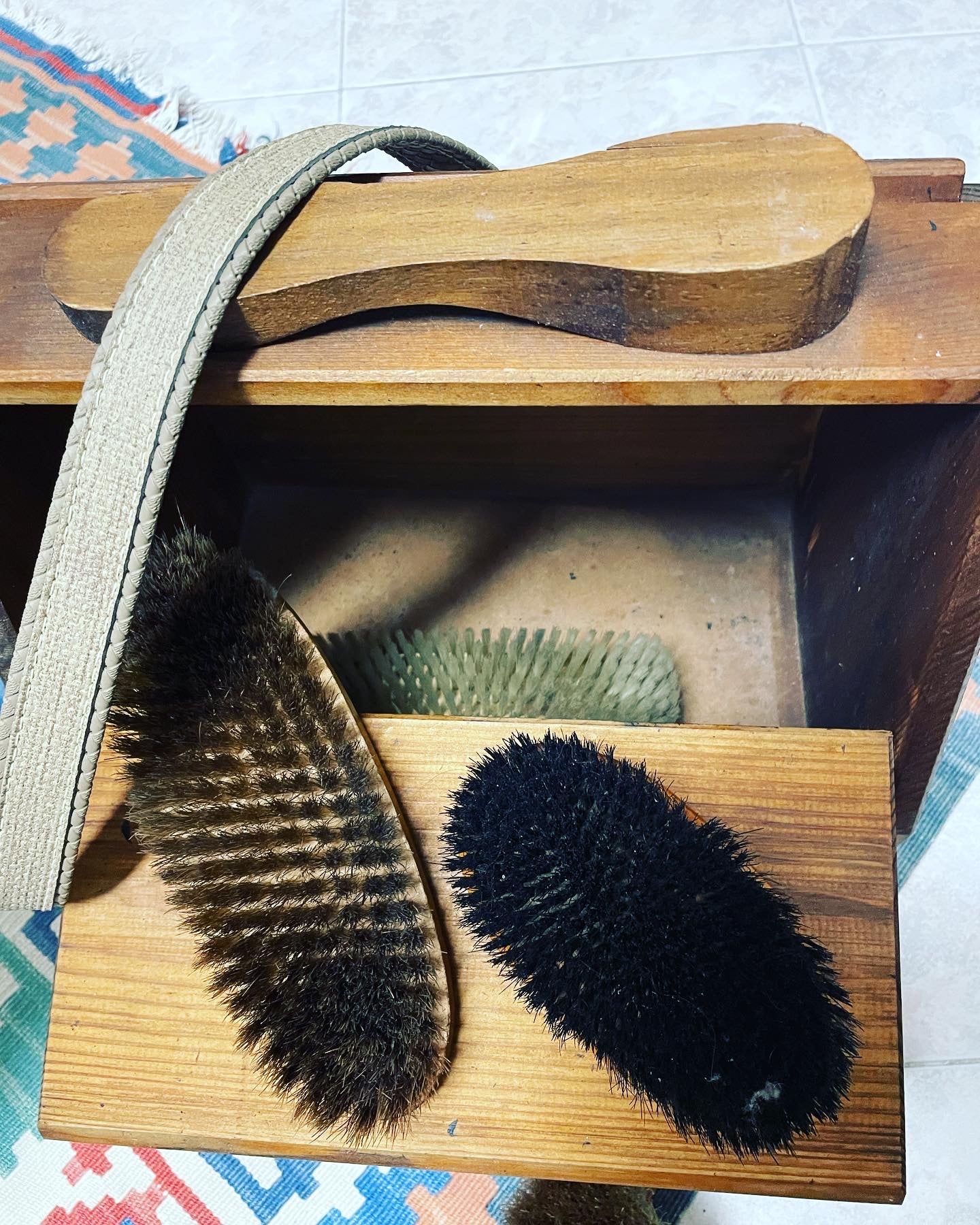 Beautiful #vintage #portable #shoeshine #set with #strap; complete with #antiquebrushes inside, made of wood, excellent condition, beautiful #furnishing accessory also in a #receptive structure with #antiquefurnishings dimensions see last photo