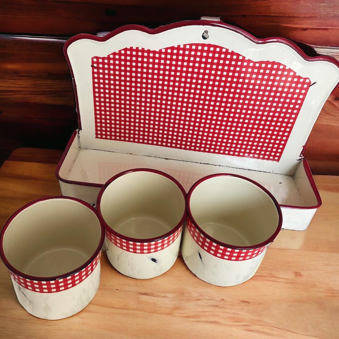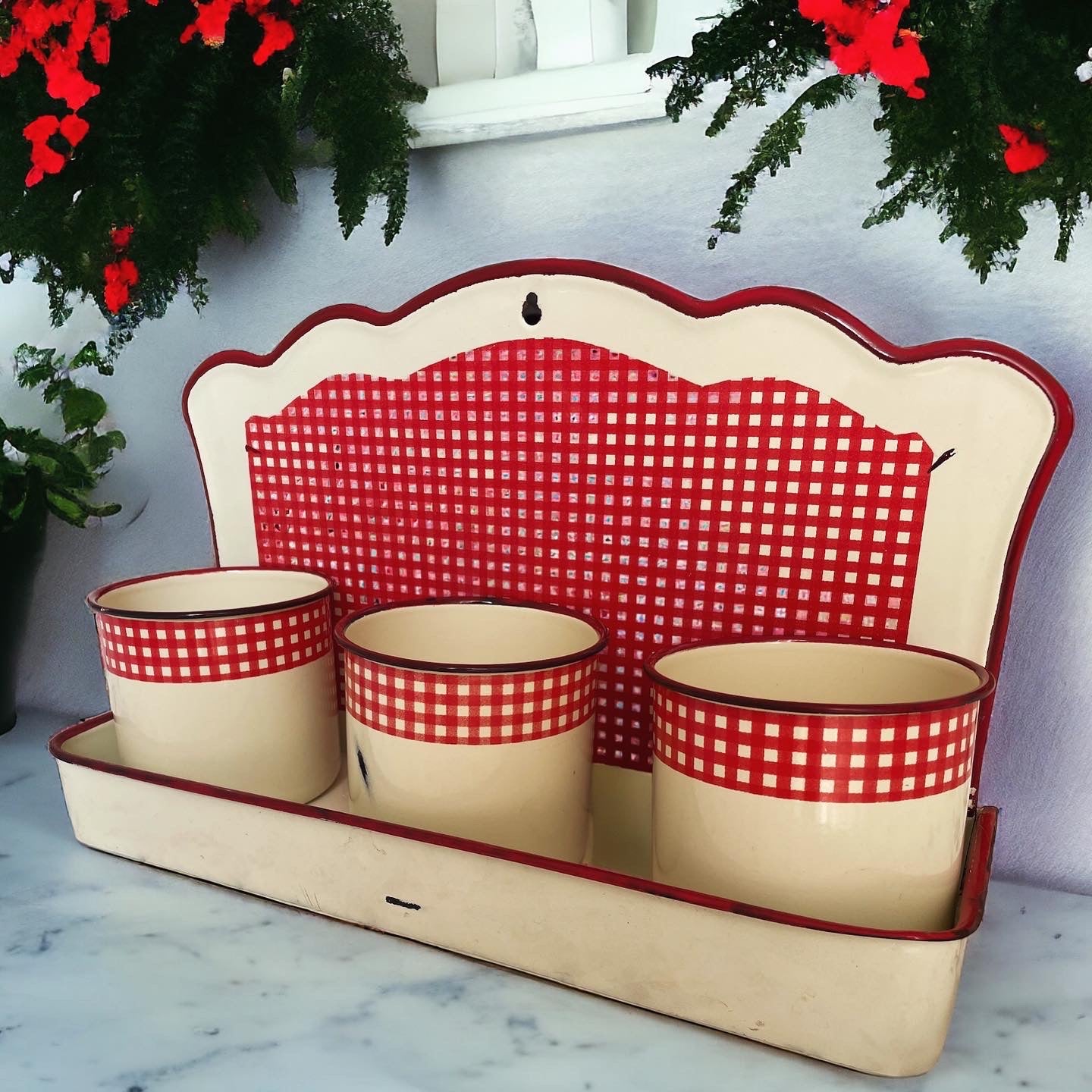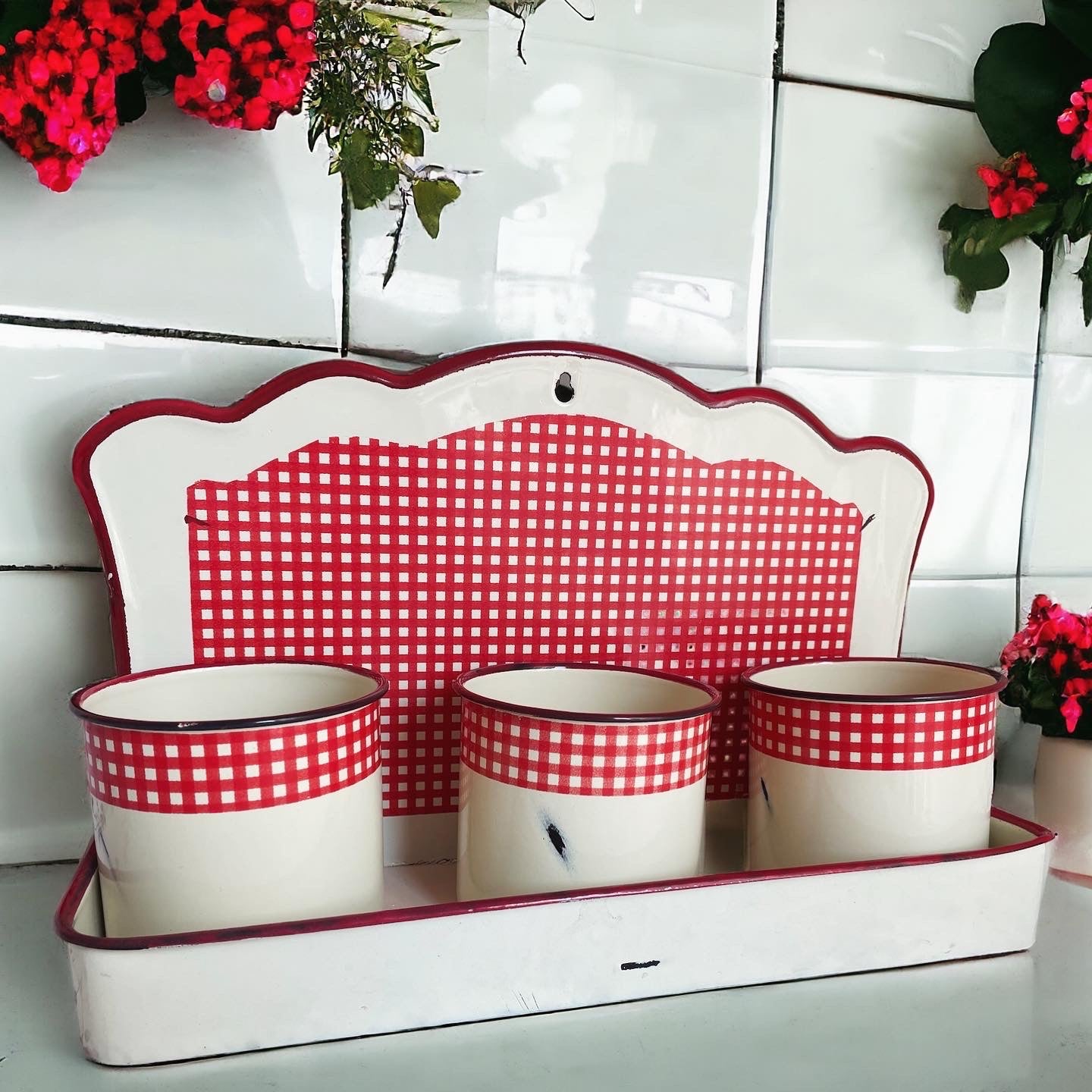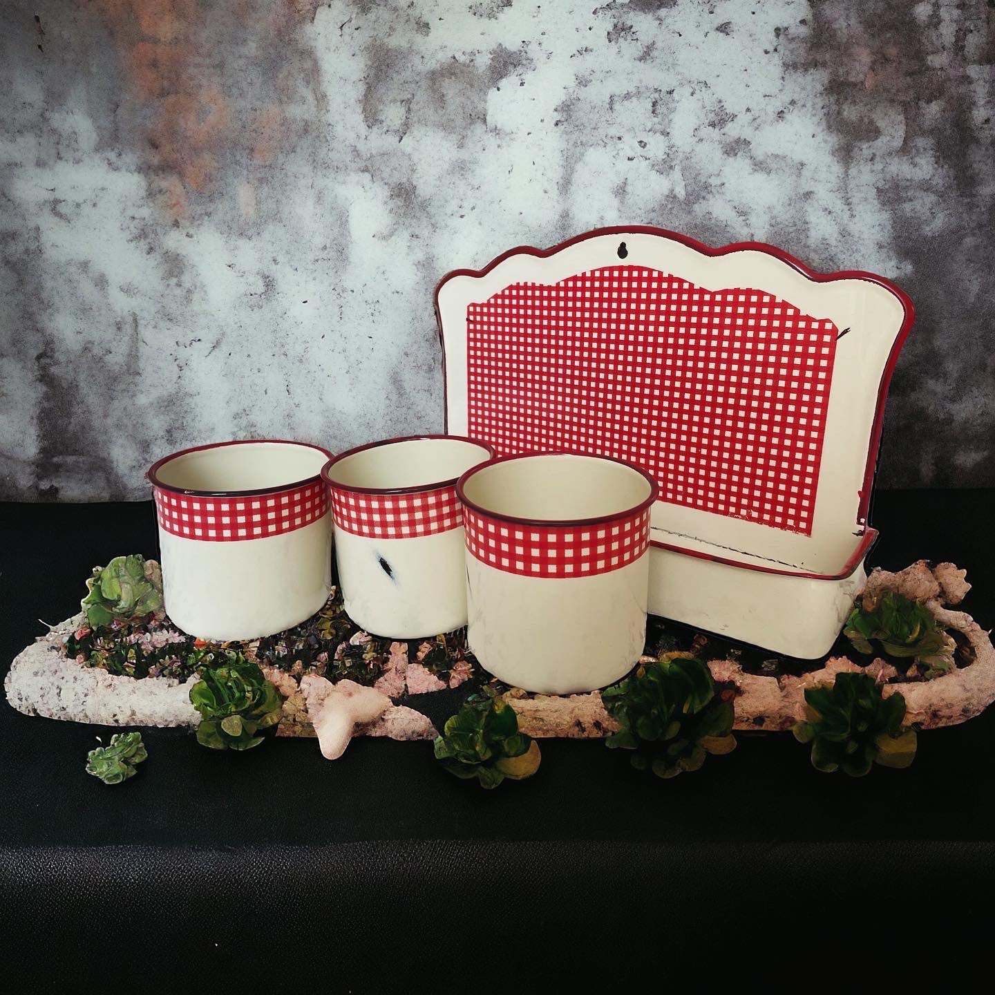 Beautiful vintage style set in enameled iron, cream colored and with a red checked pattern, including a small shelf to hang or rest on a shelf and n. 3 jars that can be used both in the kitchen for a country setting and in an indoor/outdoor setting such as a veranda, revisited as flowerpots. The dimensions: 39 x 24 the shelf, the jars have a diameter of 11 and a height of 10 cm.