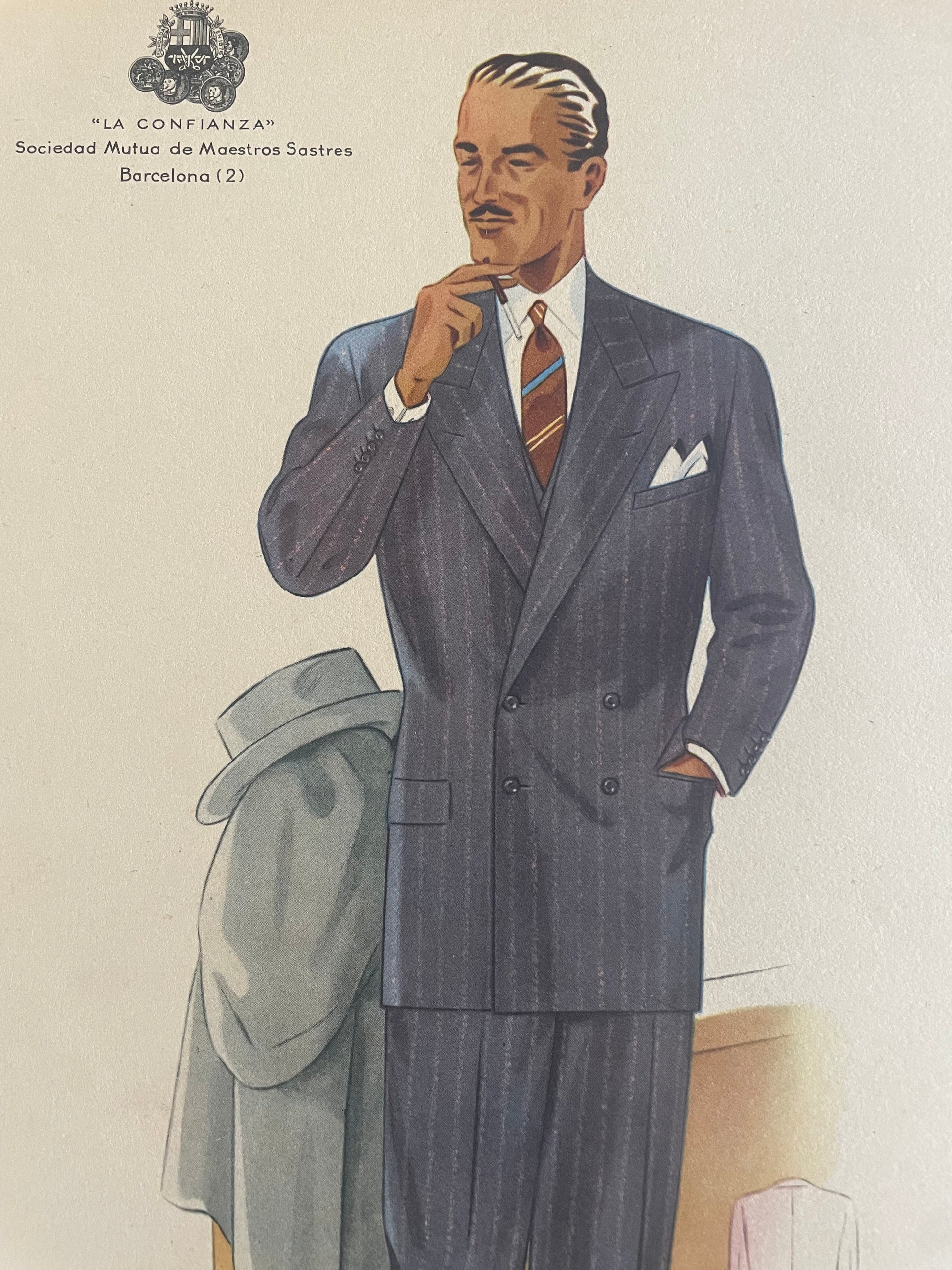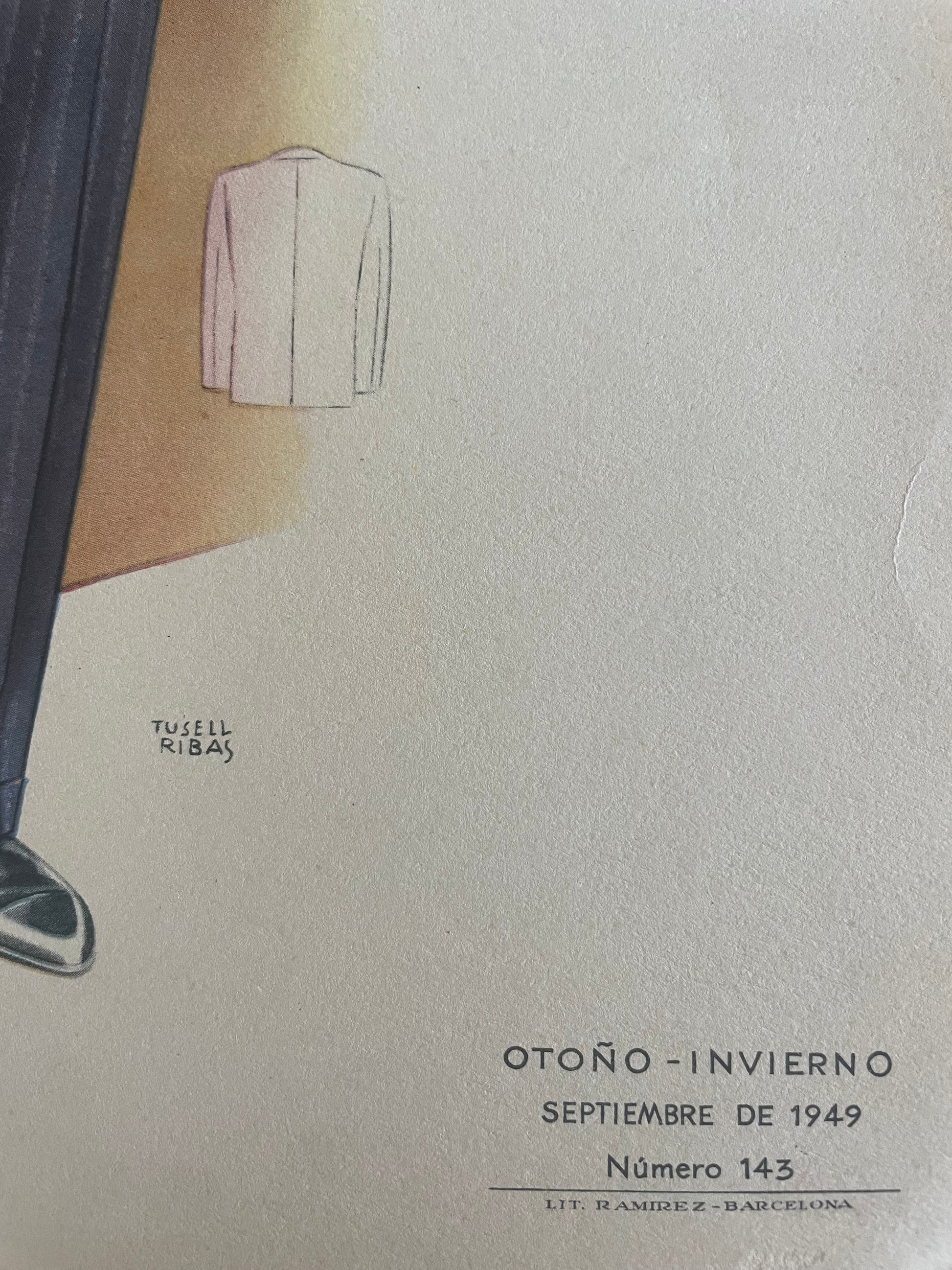 C’era un tempo in cui l’eleganza non era un’opzione, ma un’attitudine. Un tempo in cui ogni gesto — accendere una sigaretta, sistemarsi il nodo della cravatta, stringere il bavero del cappotto contro il vento — portava con sé una dignità naturale, un ritmo misurato, una consapevolezza silenziosa di sé. Queste tre tavole, realizzate nel settembre del 1949 per la collezione “Otoño - Invierno” della Sociedad Mutua de Maestros Sastres “La Confianza”, celebrano quell’uomo: sobrio, distinto, perfettamente a suo agio tanto nel traffico cittadino quanto tra le nevi di una stazione montana. Nel tratto sicuro di Vilella Ribas si riflette una moda che non ha bisogno di alzare la voce per farsi notare. Il completo marrone, portato con disinvoltura e un sorriso appena accennato. Il gessato blu, preciso e autorevole, con lo sguardo rivolto altrove, verso decisioni importanti. Il cappotto da viaggio, compagno fedele di avventure invernali, tra bagagli in cuoio e sentieri innevati. Non sono solo stampe: sono finestre aperte su un’epoca in cui la forma era sostanza, e l’abito sapeva raccontare l’uomo prima ancora che parlasse. Oggetti da collezione, sì. Ma soprattutto, frammenti di stile eterno.