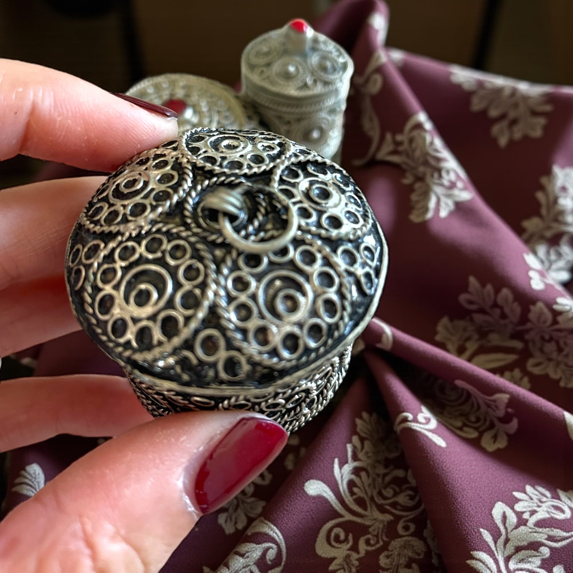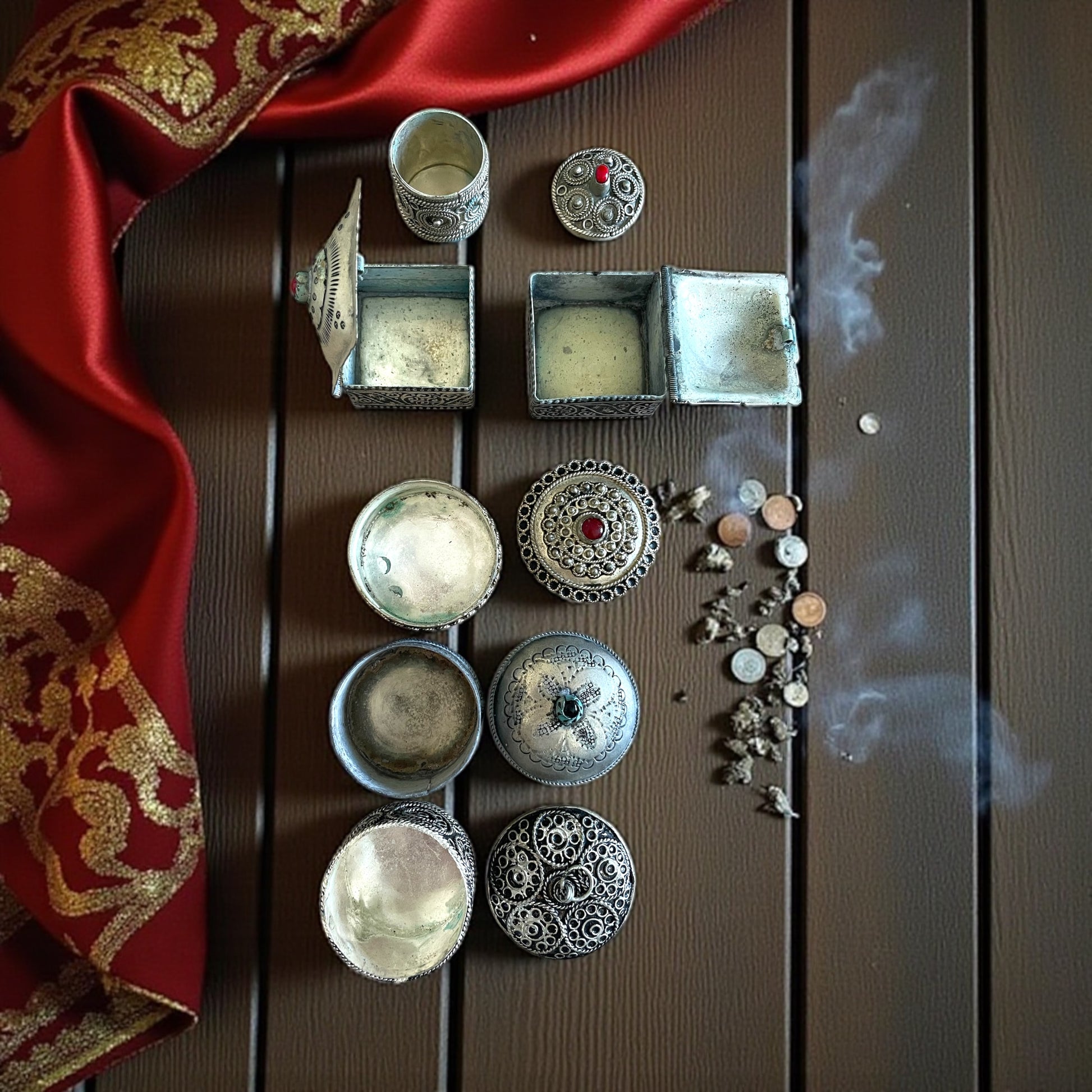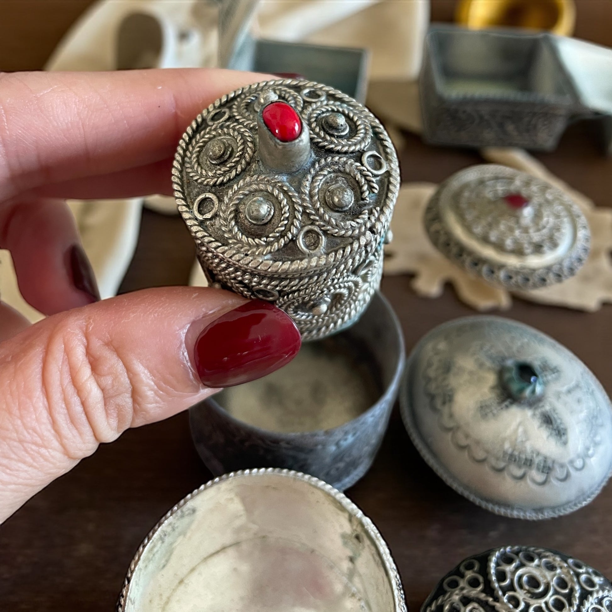 ✨ Un piccolo insieme di memorie d’Oriente, nato nella seconda metà del Novecento e arrivato fino a noi con la sua naturale patina del tempo. Sei contenitori in metallo argentato, decorati con motivi a rilievo e piccoli cabochon colorati, custodiscono ancora il fascino delle mani che li hanno plasmati. Ciascuno racconta un frammento di vita quotidiana: un flacone per oli profumati, scatoline per gioielli, piccoli scrigni per il tradizionale trucco orientale chiamato “khol” che evocano mercati lontani e tradizioni antiche. Perfetti per collezionisti o per chi ama arredare con dettagli unici e suggestivi. ✨