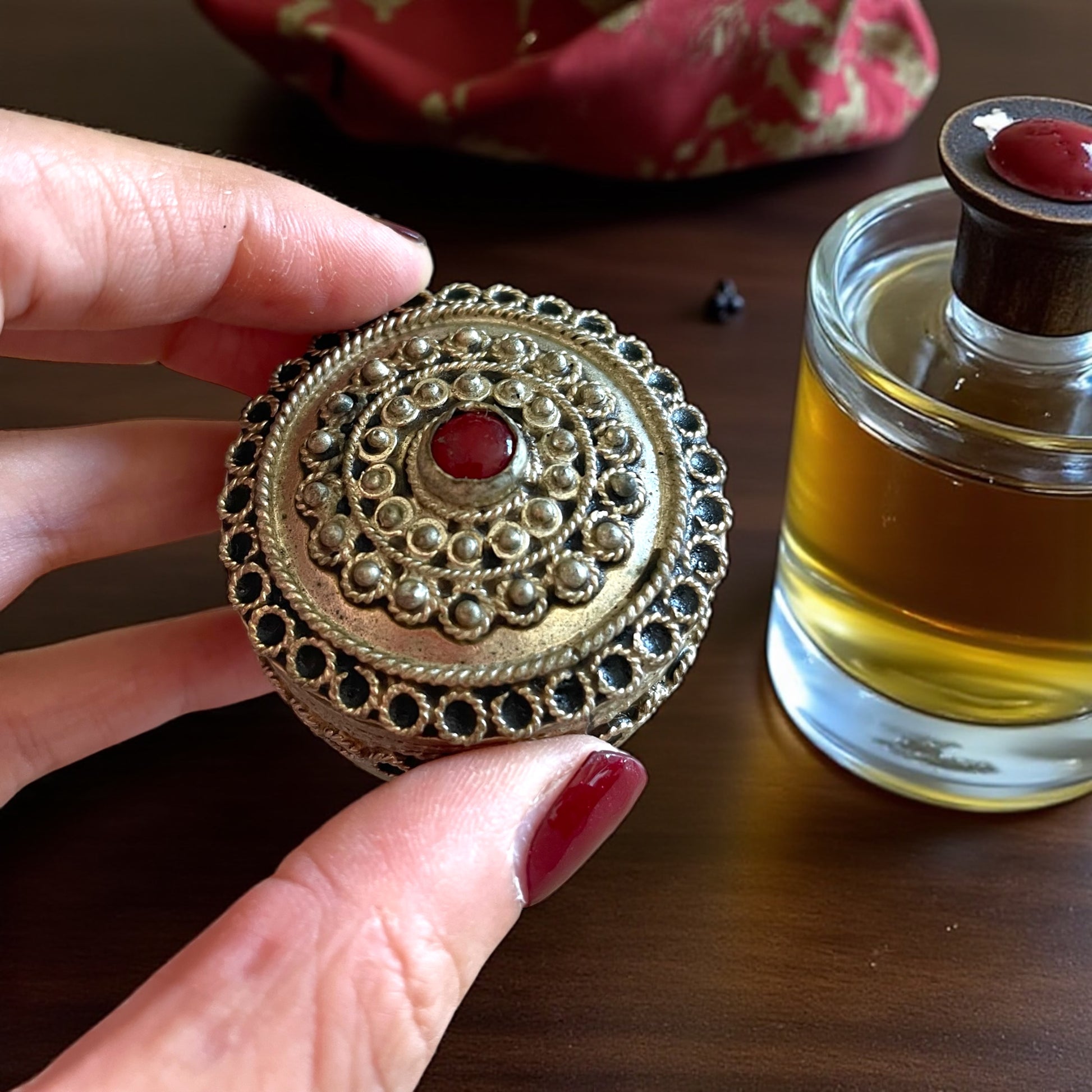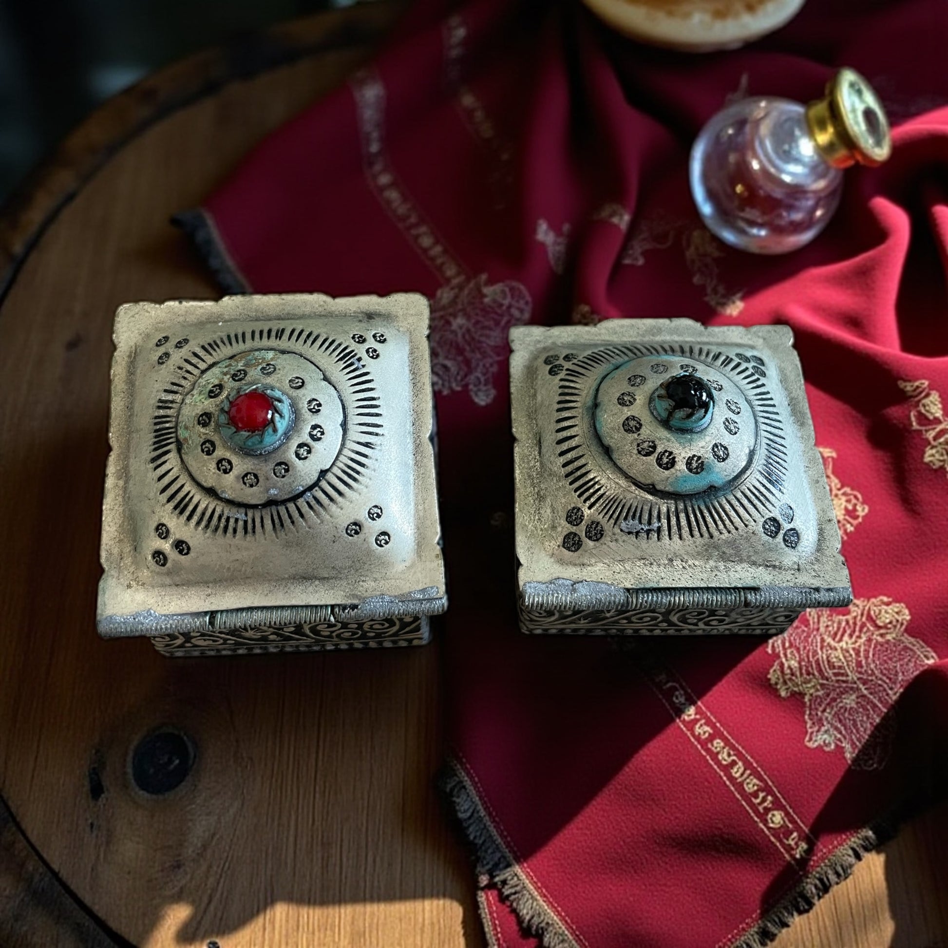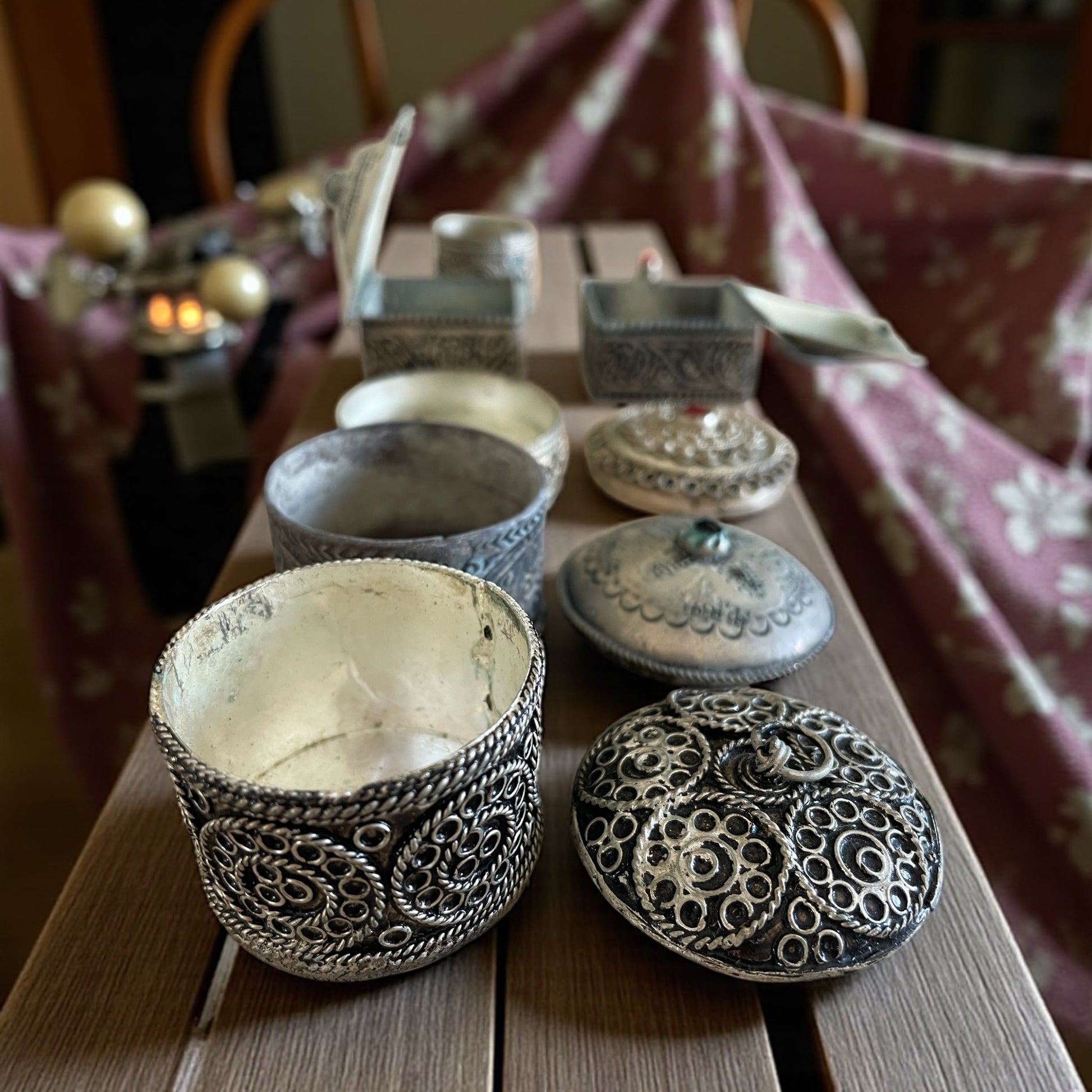 ✨ Un piccolo insieme di memorie d’Oriente, nato nella seconda metà del Novecento e arrivato fino a noi con la sua naturale patina del tempo. Sei contenitori in metallo argentato, decorati con motivi a rilievo e piccoli cabochon colorati, custodiscono ancora il fascino delle mani che li hanno plasmati. Ciascuno racconta un frammento di vita quotidiana: un flacone per oli profumati, scatoline per gioielli, piccoli scrigni per il tradizionale trucco orientale chiamato “khol” che evocano mercati lontani e tradizioni antiche. Perfetti per collezionisti o per chi ama arredare con dettagli unici e suggestivi. ✨