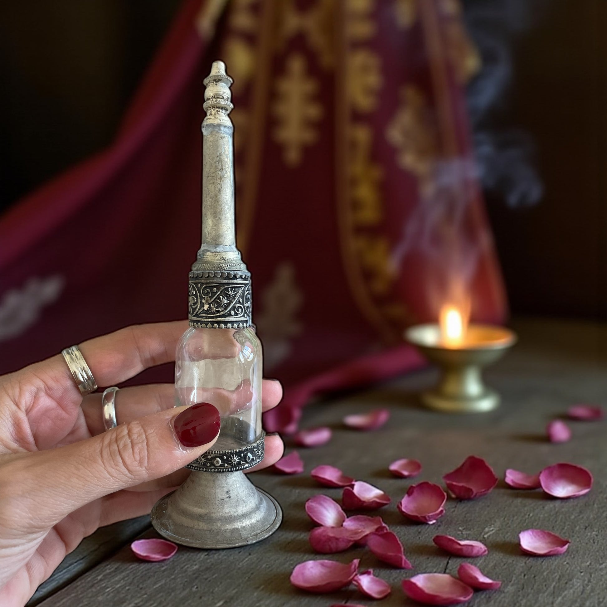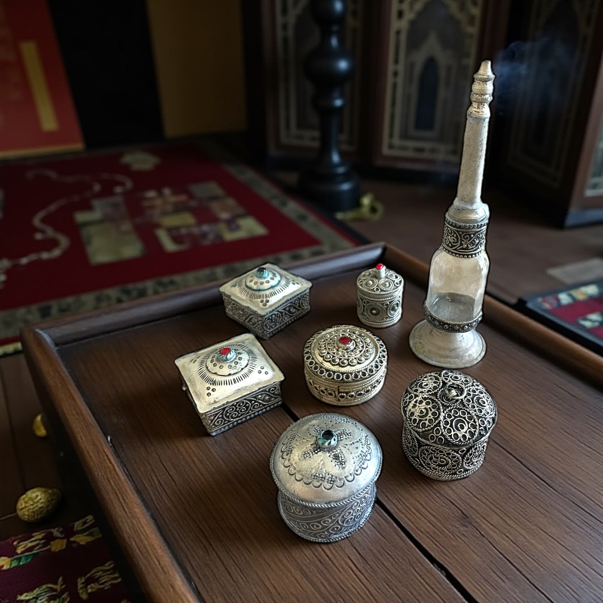 Set n.5 contenitori argentati per khol e un profumatore per olii, Oriente