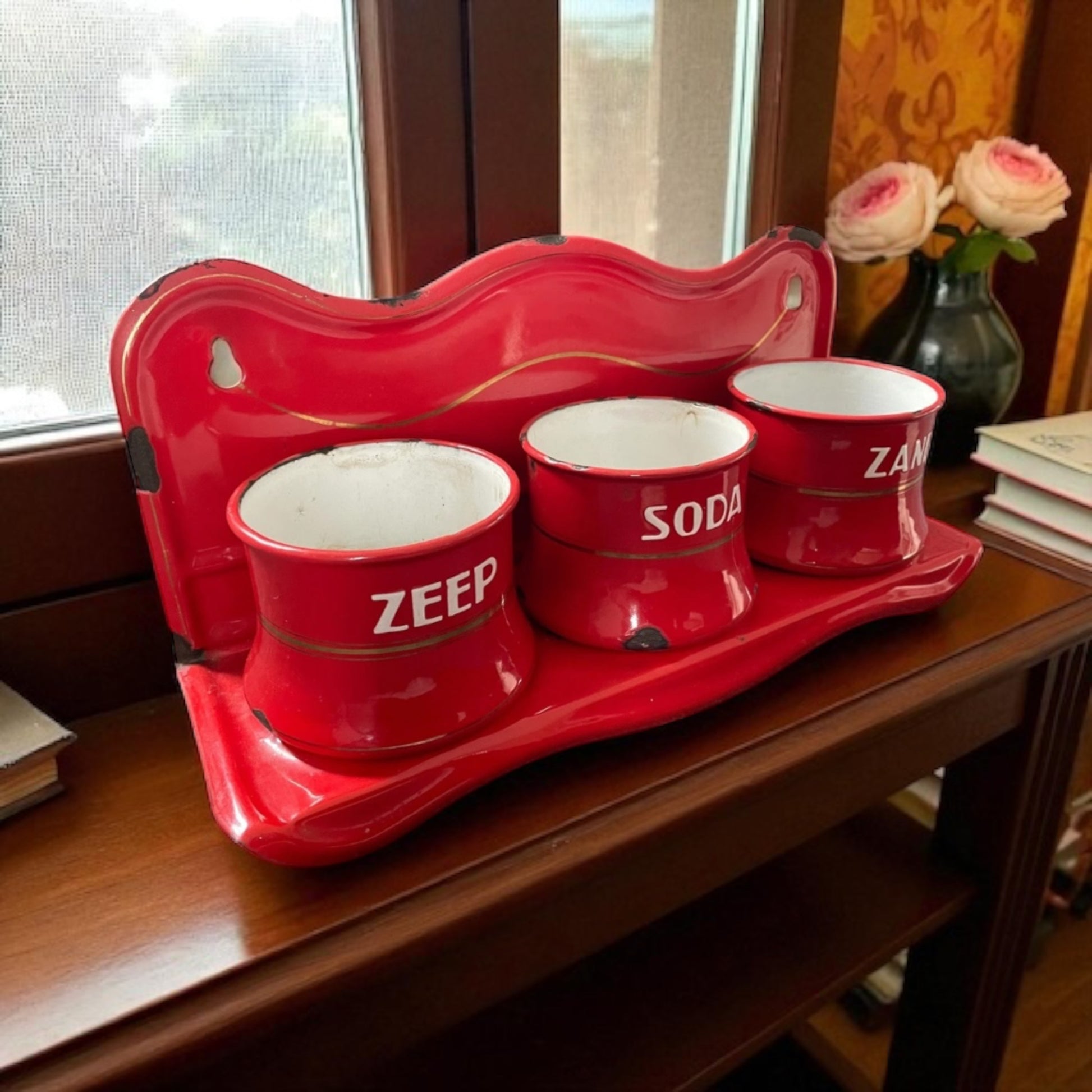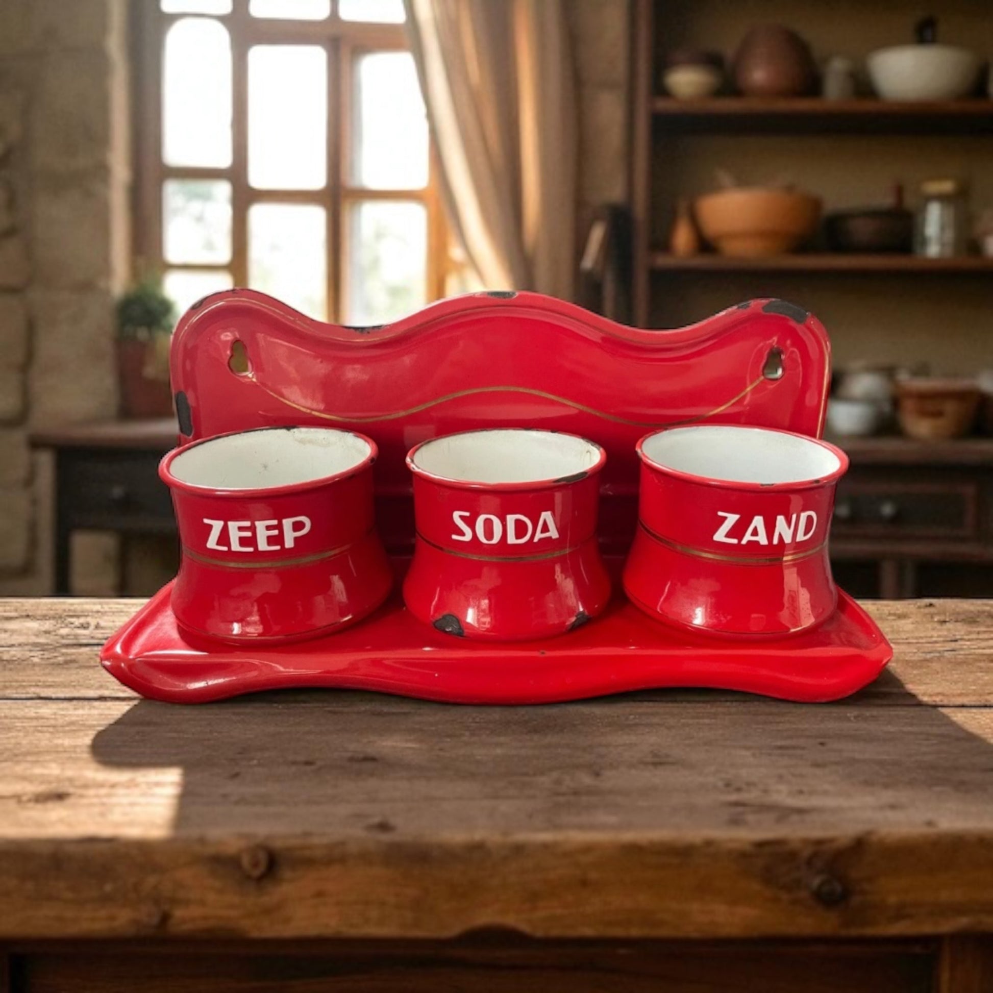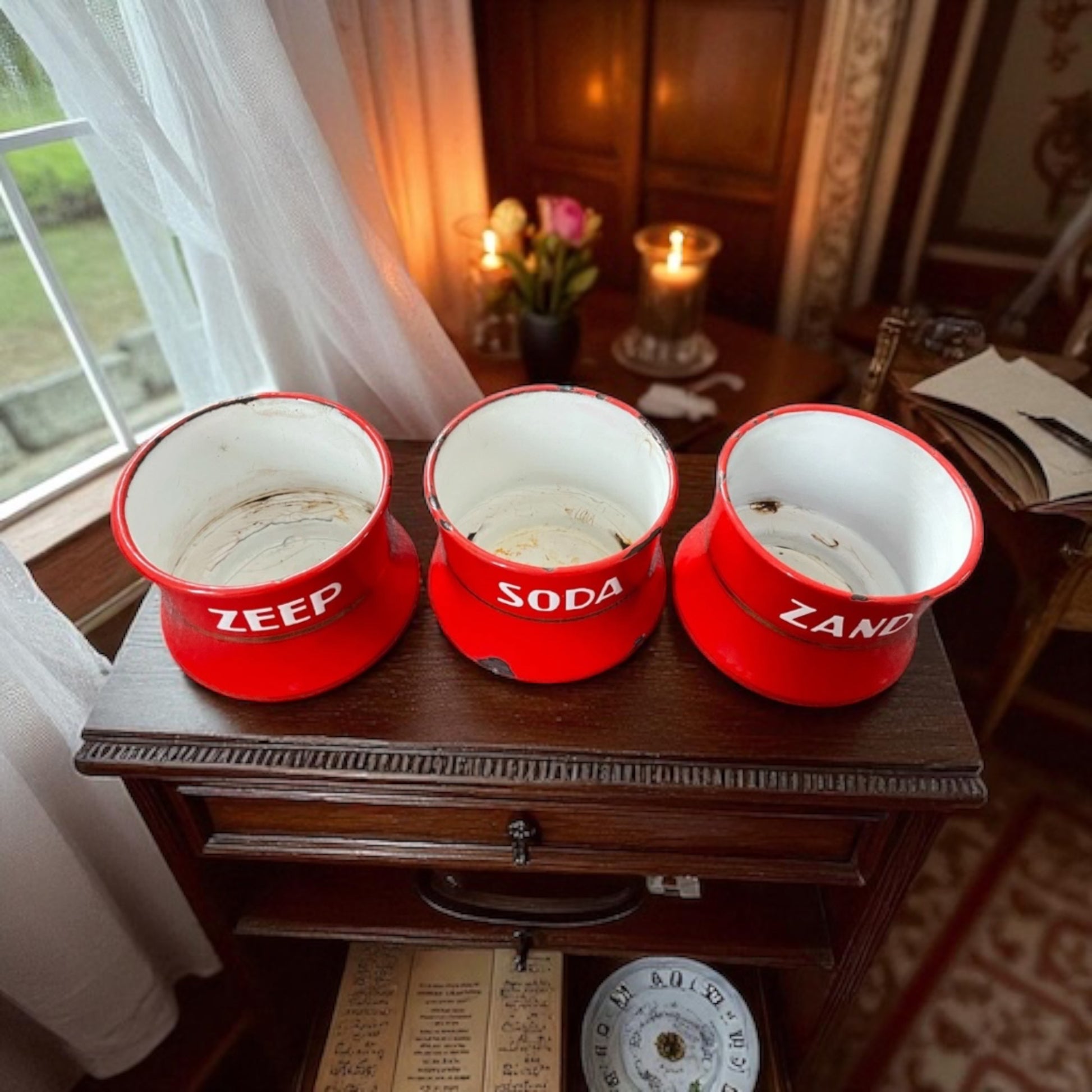 Immagina una cucina di campagna di inizio ’900: il fuoco acceso, la luce dorata che filtra dalla finestra e una donna che si muove con gesti lenti e sapienti. Sul tavolo di legno, il rosso vivo di questi barattoli in smalto cattura lo sguardo come un cuore pulsante nella stanza. Le scritte bianche – ZEEP, SODA, ZAND – raccontano la loro funzione: il sapone per il bucato, la soda per le stoviglie più ostinate, la sabbia fine per strofinare le pentole quando ancora non esistevano i detersivi moderni. Ogni volta che apri uno di questi contenitori, non stai solo vedendo un oggetto antico: stai toccando un frammento di vita quotidiana, fatta di gesti semplici e ripetuti, che hanno custodito la dignità del lavoro domestico. Il loro colore intenso, con le piccole sbeccature del tempo, diventa una traccia di autenticità, quasi una firma lasciata dal passato per ricordarci che la bellezza non sta nella perfezione, ma nella storia che un oggetto porta con sé. Lascia che questi barattoli parlino: possono ancora trasformare un angolo della tua casa in un luogo di memoria viva, capace di evocare atmosfere dimenticate e di aprire uno spazio di connessione emotiva con chi li osserva.