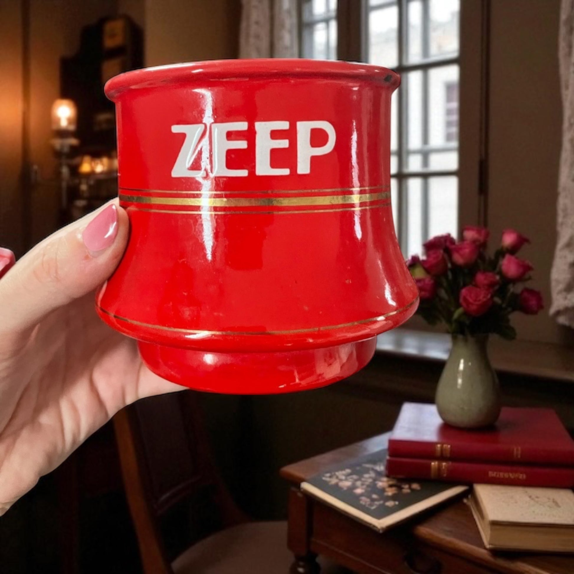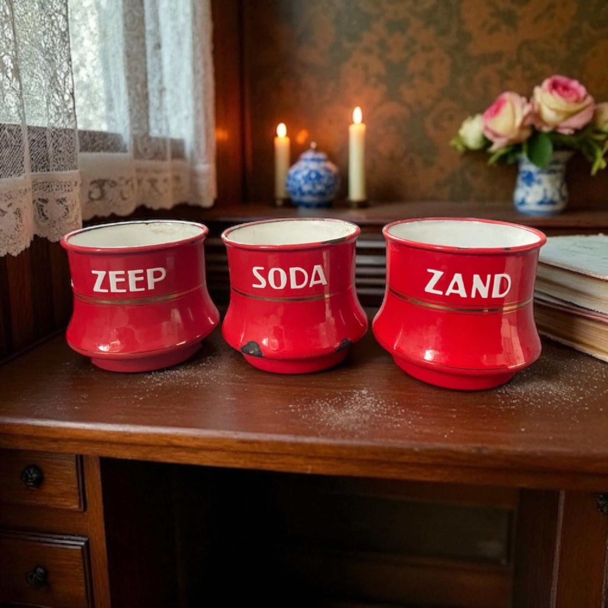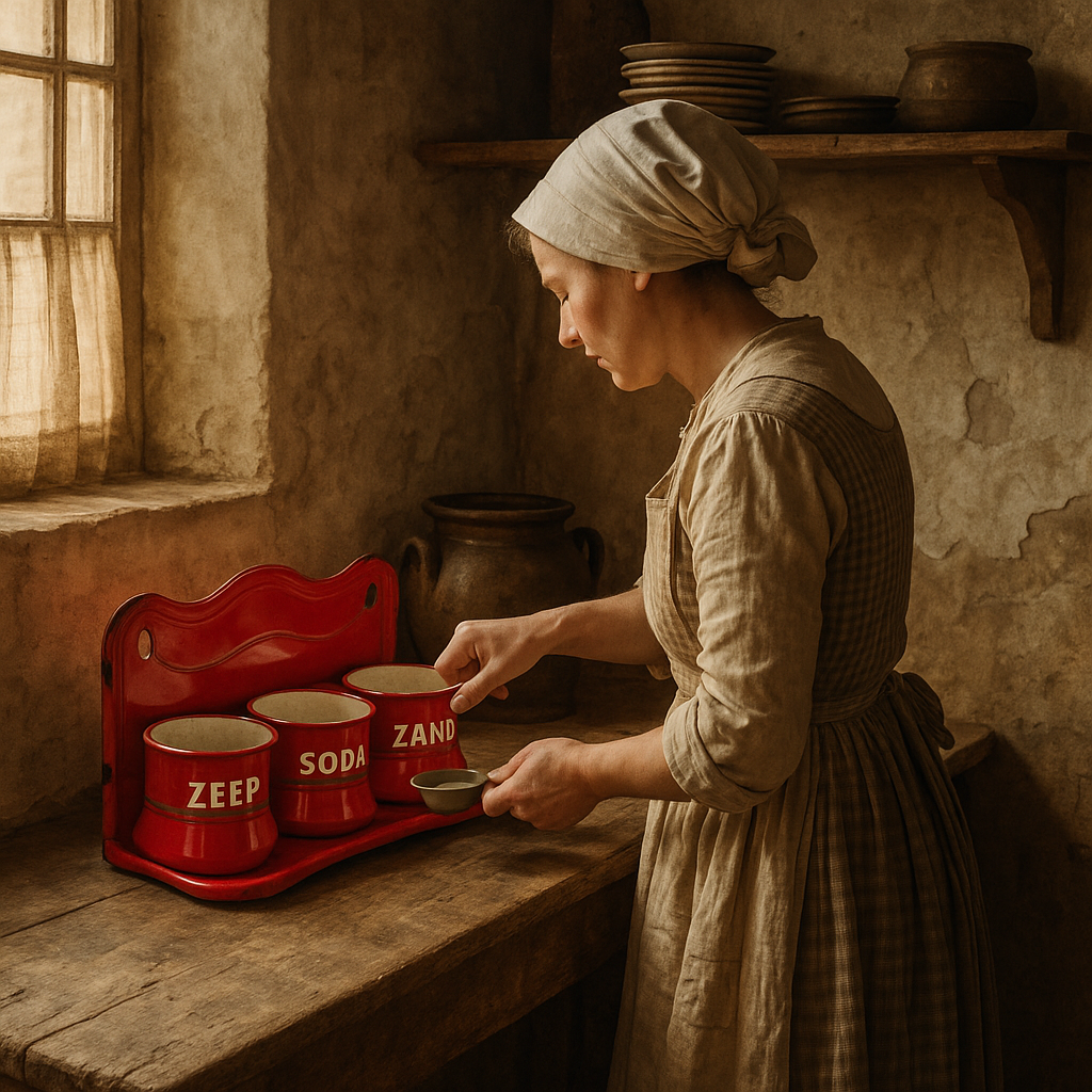 Immagina una cucina di campagna di inizio ’900: il fuoco acceso, la luce dorata che filtra dalla finestra e una donna che si muove con gesti lenti e sapienti. Sul tavolo di legno, il rosso vivo di questi barattoli in smalto cattura lo sguardo come un cuore pulsante nella stanza. Le scritte bianche – ZEEP, SODA, ZAND – raccontano la loro funzione: il sapone per il bucato, la soda per le stoviglie più ostinate, la sabbia fine per strofinare le pentole quando ancora non esistevano i detersivi moderni. Ogni volta che apri uno di questi contenitori, non stai solo vedendo un oggetto antico: stai toccando un frammento di vita quotidiana, fatta di gesti semplici e ripetuti, che hanno custodito la dignità del lavoro domestico. Il loro colore intenso, con le piccole sbeccature del tempo, diventa una traccia di autenticità, quasi una firma lasciata dal passato per ricordarci che la bellezza non sta nella perfezione, ma nella storia che un oggetto porta con sé. Lascia che questi barattoli parlino: possono ancora trasformare un angolo della tua casa in un luogo di memoria viva, capace di evocare atmosfere dimenticate e di aprire uno spazio di connessione emotiva con chi li osserva.