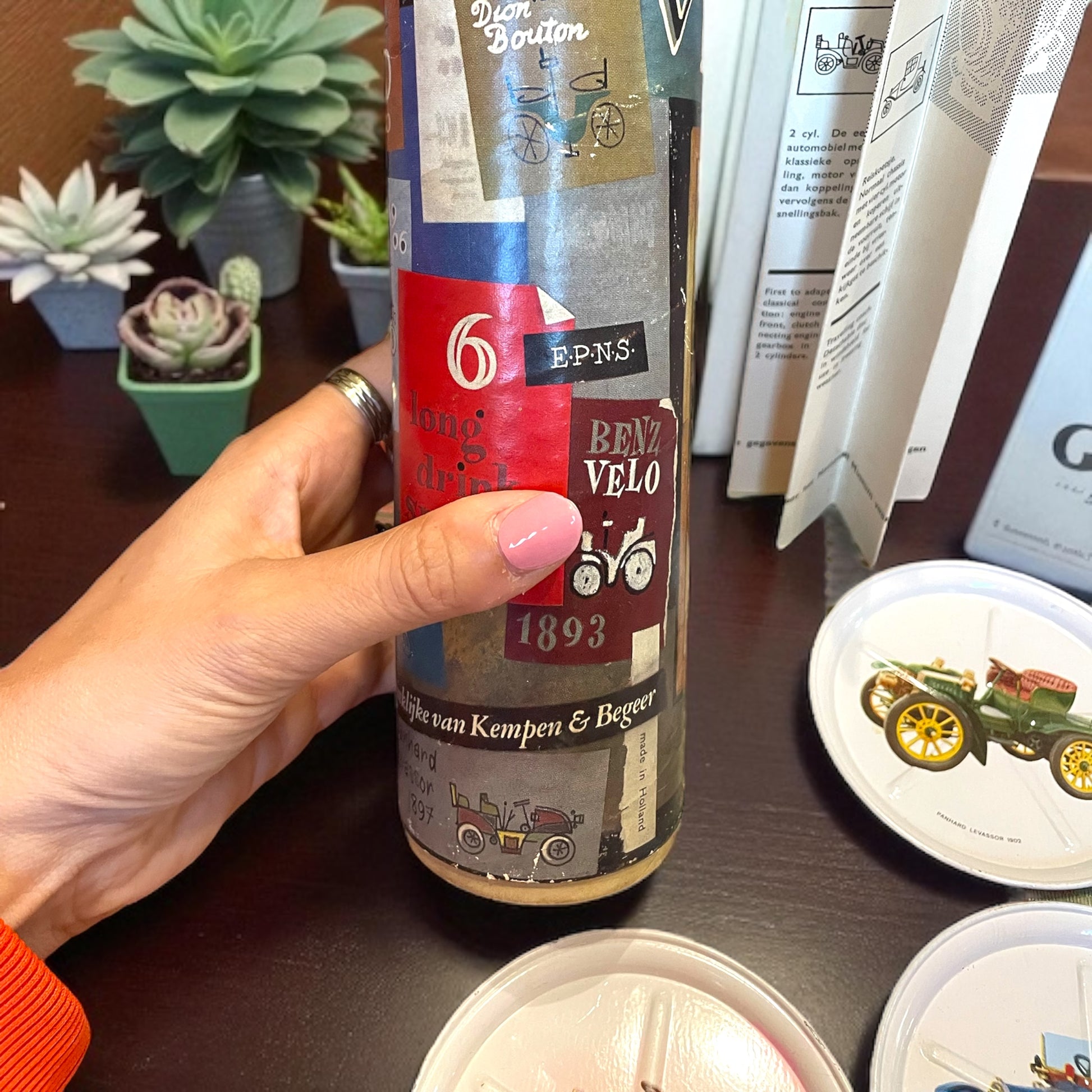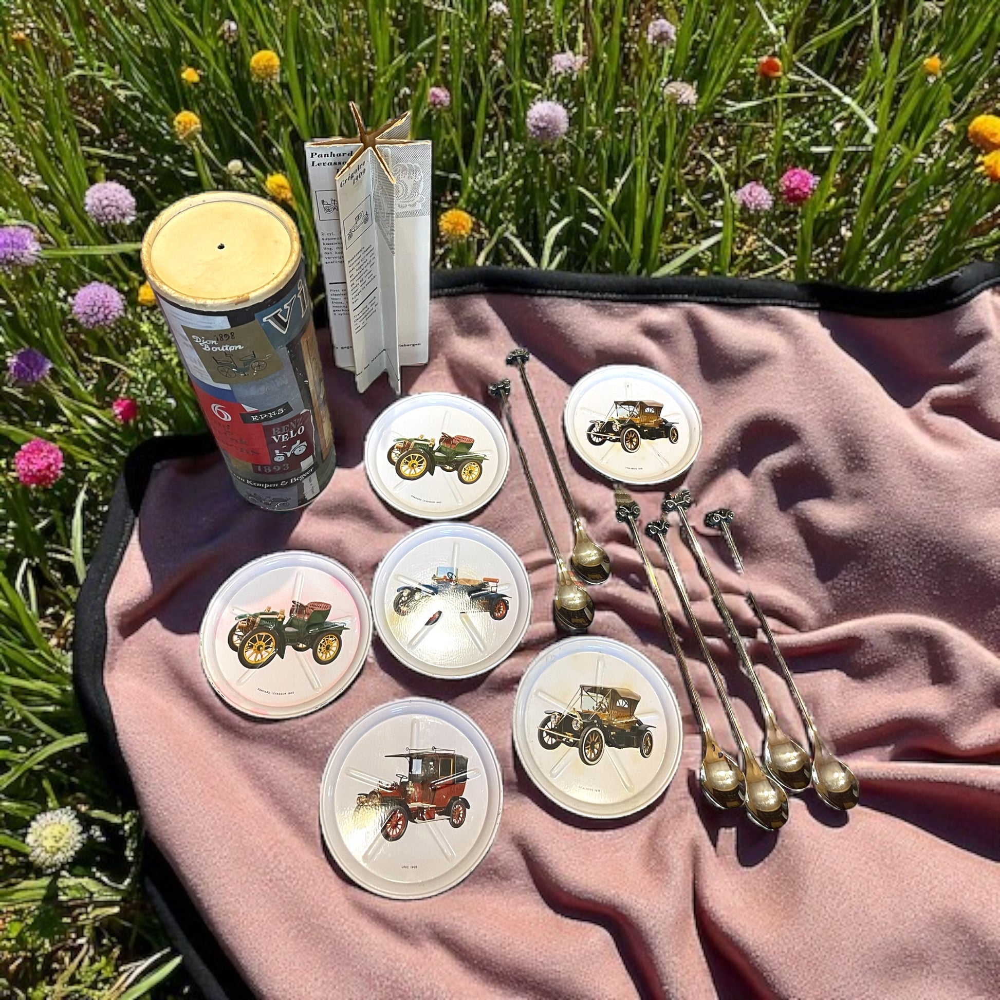 Immagina di servire un drink ghiacciato agli amici… e stupirli con cucchiaini che portano in cima minuscole automobili storiche in rilievo, mentre i bicchieri riposano su sottobicchieri dallo charme retrò. Questo raro set da cocktail anni ’60/‘70 è un piccolo tributo al mondo delle auto d’epoca, perfetto per chi ama l’eleganza della tavola ma con un tocco originale e sorprendente. Ogni cucchiaino, finemente lavorato in metallo argentato, porta in cima una piccola scultura di un’auto storica: dalla Benz Velo del 1893 alla Fiat del primo ’900. I sottobicchieri abbinati, in metallo verniciato, celebrano altri modelli con illustrazioni colorate e nomi stampati. Conservato nel suo contenitore cilindrico originale, completo di cartoncino pieghevole descrittivo, questo set è un tuffo nel passato: ideale per collezionisti di automobilia, amanti del vintage design o chi desidera semplicemente stupire gli ospiti con un dettaglio unico.