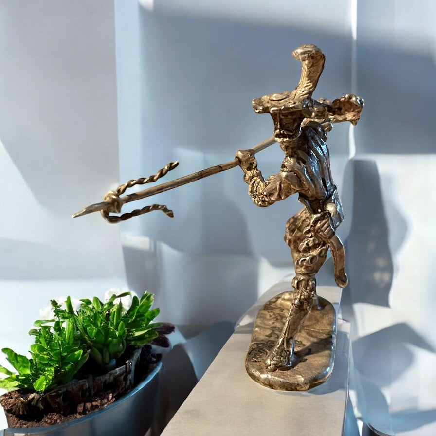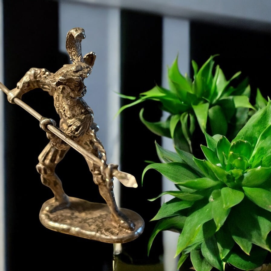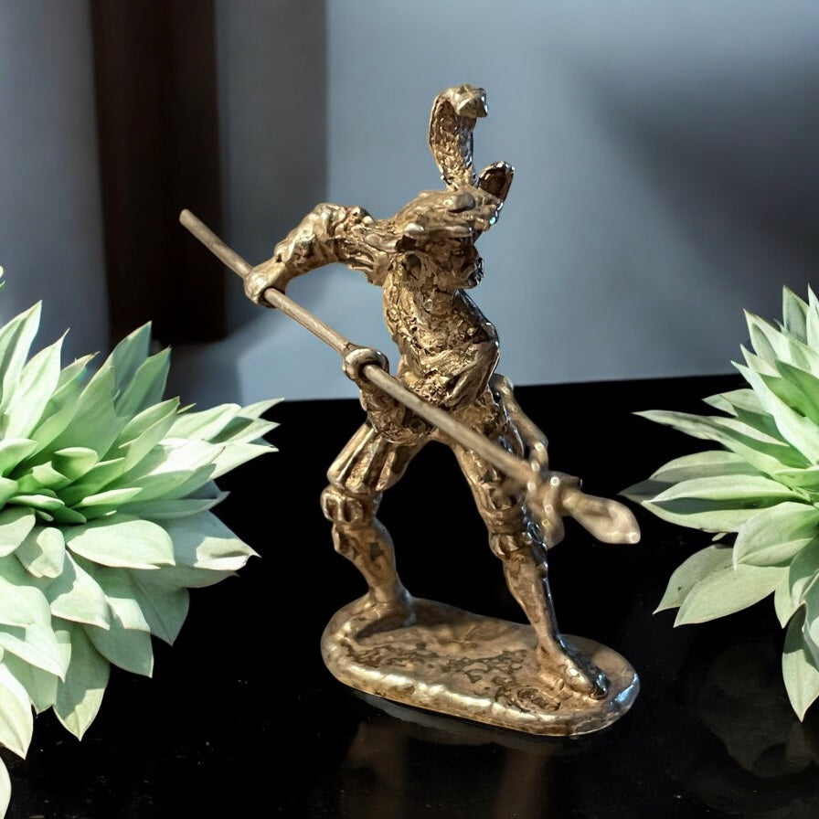 C’era chi giocava con i soldatini di piombo, e chi invece collezionava questi. Scultura in miniatura in argento 800 (punzonato 800 in ovale, no altri simboli), testato. Il soggetto rappresenta un duellante o capitano cerimoniale, caratterizzato da un copricapo piumato, busto decorato, pantaloni al ginocchio e una posa marziale. I dettagli stilistici richiamano l’immaginario della commedia dell’arte o dei romanzi di cappa e spada, con tratti volutamente marcati e una certa enfasi caricaturale. La lancia che impugna è in metallo argentato, separata dal corpo, e decorata da una sorta di fiocco d’argento - elemento raro che suggerisce una funzione cerimoniale o simbolica, piuttosto che bellica. La patina e le porosità del metallo indicano una produzione non recente, verosimilmente databile tra gli anni ’30 e ’60. Si tratta con tutta probabilità di una realizzazione artigianale da banco orafo o fonderia d’arte, forse parte di una serie limitata o di una composizione più ampia. 40 x 17 mm personaggio, 55 mm lancia.