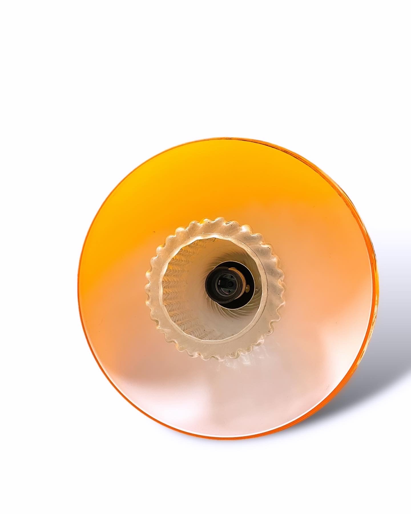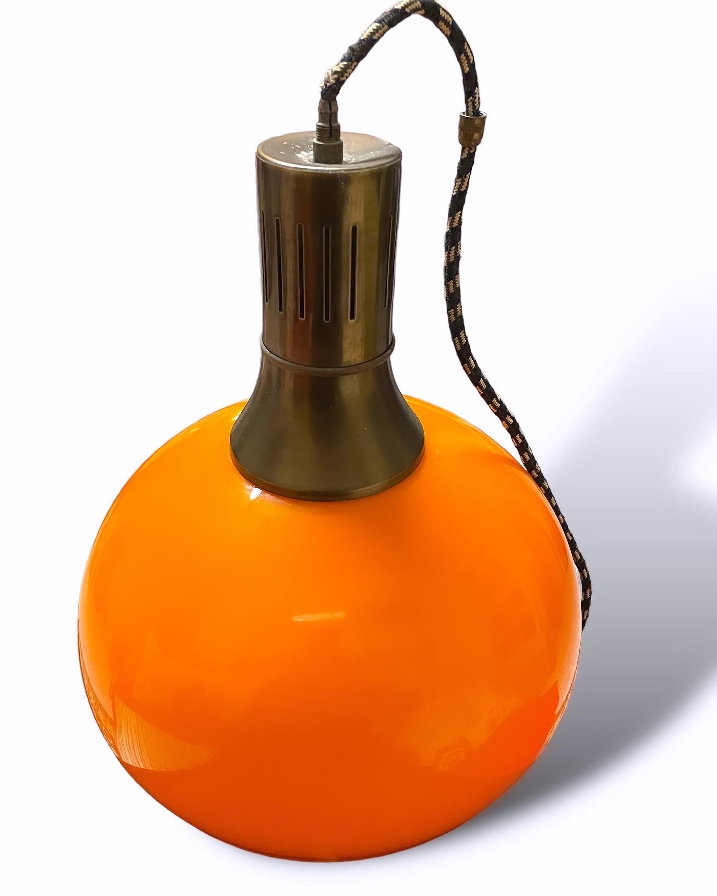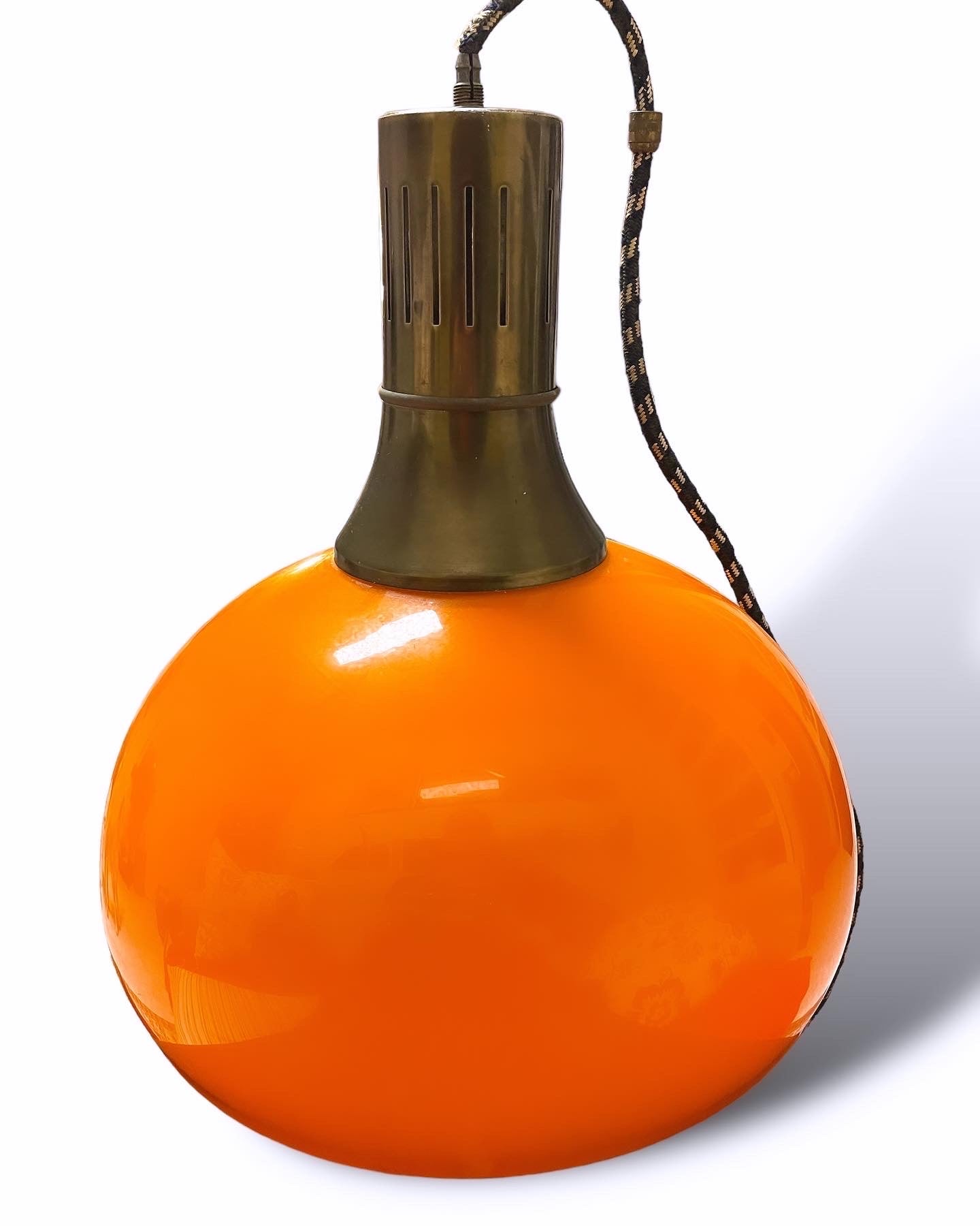 Splendid #design #pendant #lamp in #orange #glass with double bell, the interior in transparent glass, excellent condition of the glass, #spaceage #unmistakable #70s #original #vintage design. Height including brass part 35 cm, diameter 27 cm. Unmissable piece of #modernfurniture.